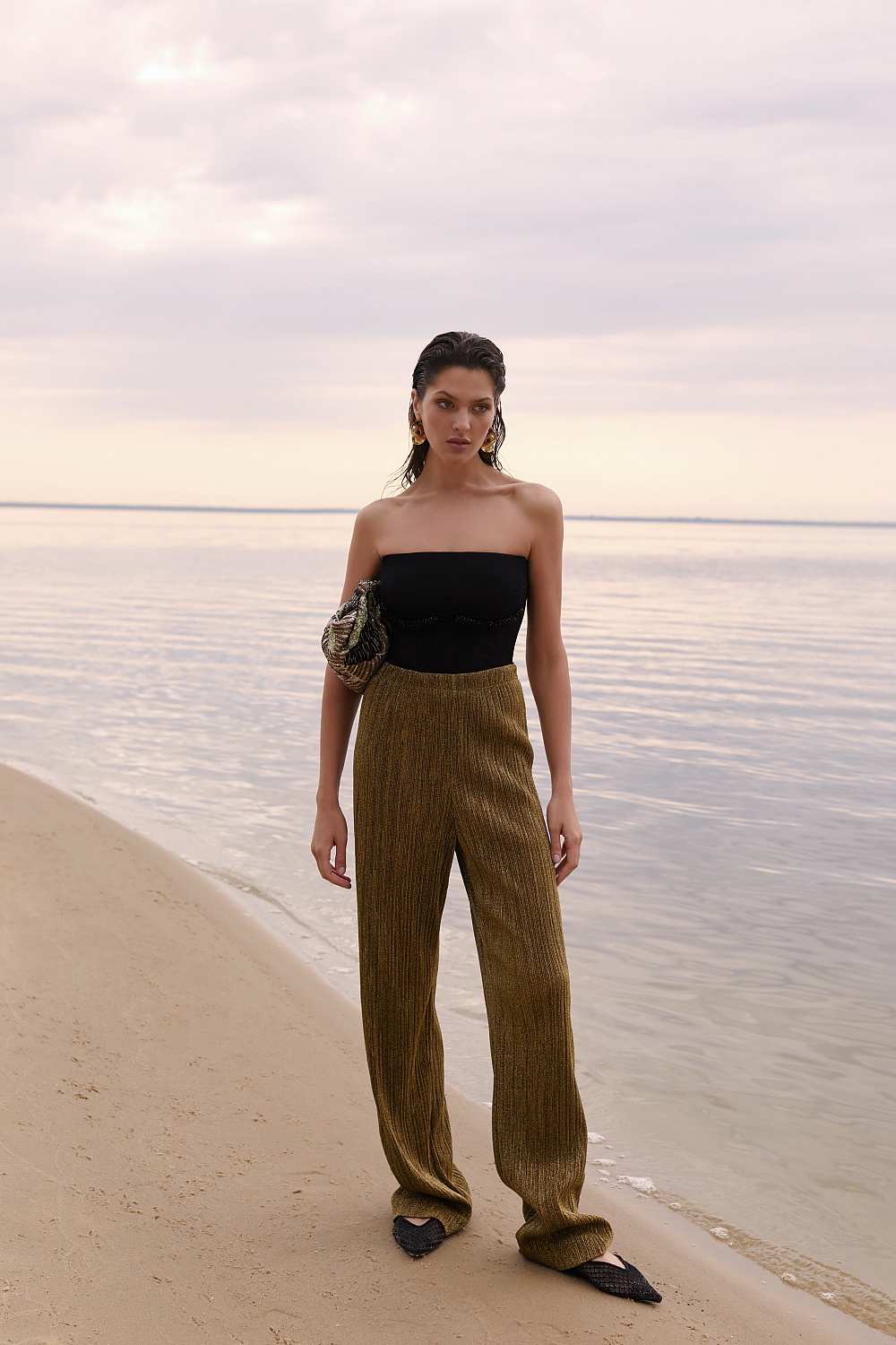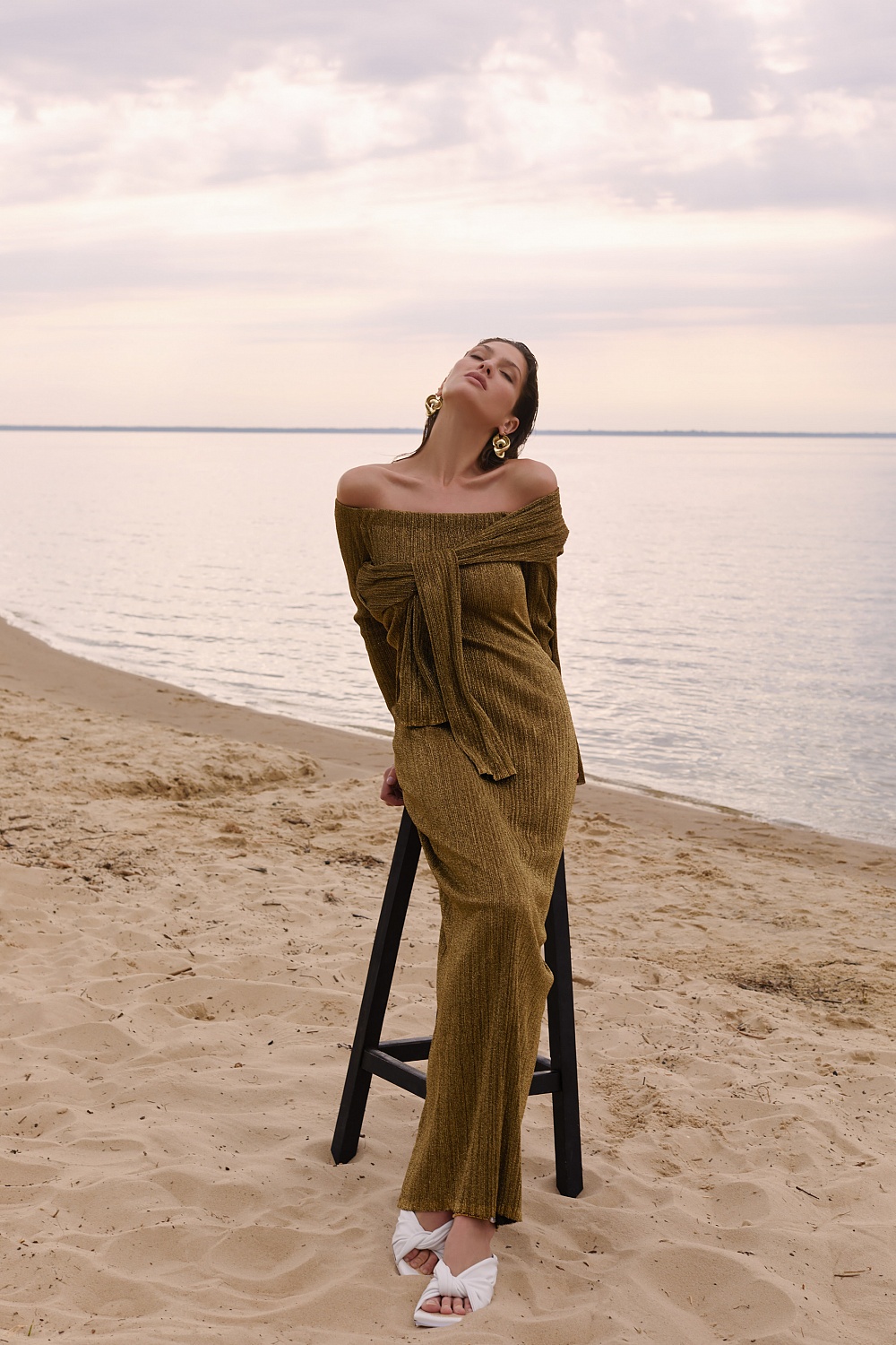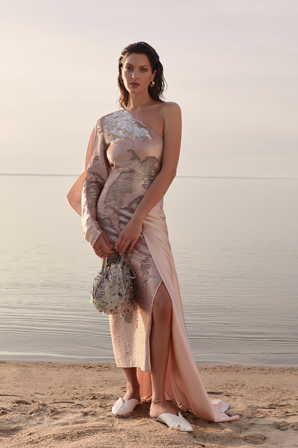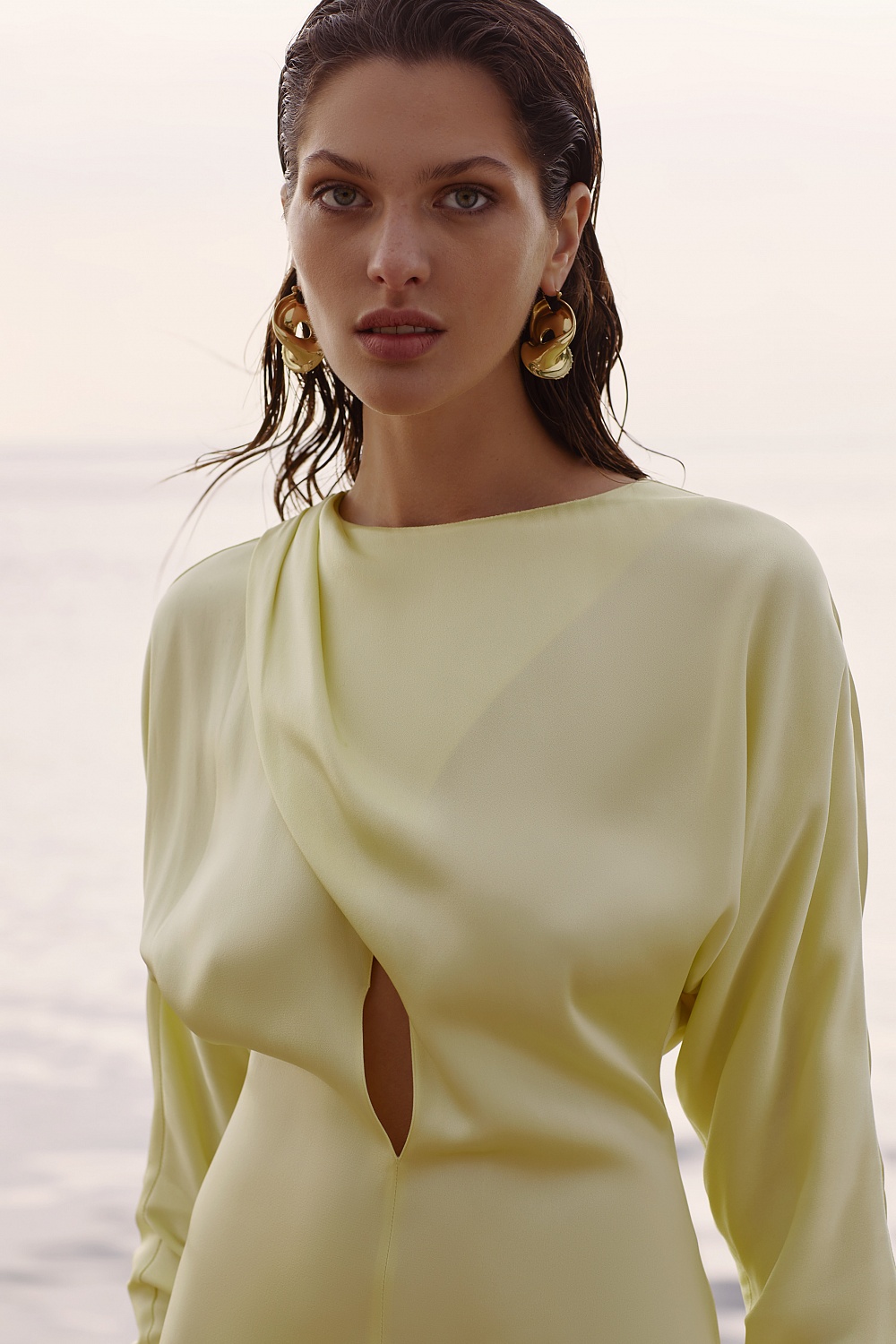 Перед стилистом съемки Натальей Осадчей стояла задача создать из кутюрно-вечерних нарядов универсальные образы, ведь именно в этом и состоит идея сегодняшнего осознанного потребления — надевать вещь не один раз и по разным поводам. Отсюда и нестандартные стилистические решения — купальник-бандо соседствует с юбкой с бахромой из стекляруса, рубашка с кристаллами, наклеенными вручную, надета поверх купального костюма телесного цвета. Камни на боди и топах-бюстье отражаются в рассветном зеркале воды - и героиня съемки из модели превращается в мифический образ.