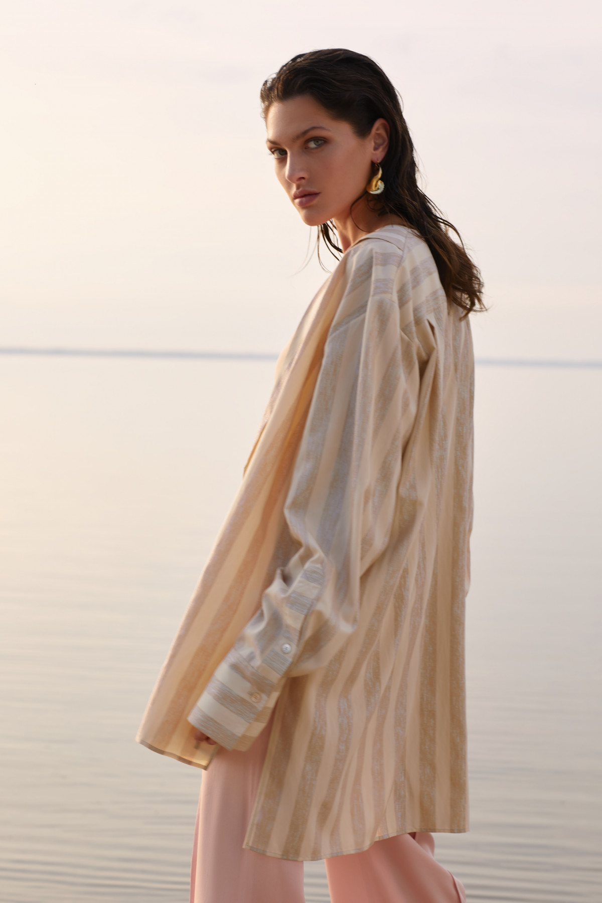 Перед стилистом съемки Натальей Осадчей стояла задача создать из кутюрно-вечерних нарядов универсальные образы, ведь именно в этом и состоит идея сегодняшнего осознанного потребления — надевать вещь не один раз и по разным поводам. Отсюда и нестандартные стилистические решения — купальник-бандо соседствует с юбкой с бахромой из стекляруса, рубашка с кристаллами, наклеенными вручную, надета поверх купального костюма телесного цвета. Камни на боди и топах-бюстье отражаются в рассветном зеркале воды - и героиня съемки из модели превращается в мифический образ.