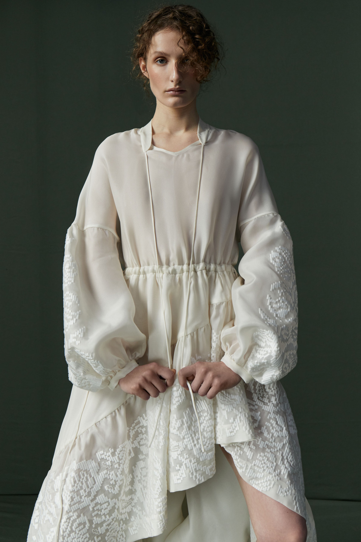 Лінійка втілює суть українських звичаїв, використовуючи низку деталей, що притаманні традиційному народному костюму: каламайковий пояс, восковиці для вінка й ґуґлю — пальто нареченої. Колекція складається з шести позицій: п’яти варіантів суконь у різній довжині та брючного костюма. Увесь одяг доповнений білою вишивкою по білому полотну, що підкреслює сучасний характер дизайну.
