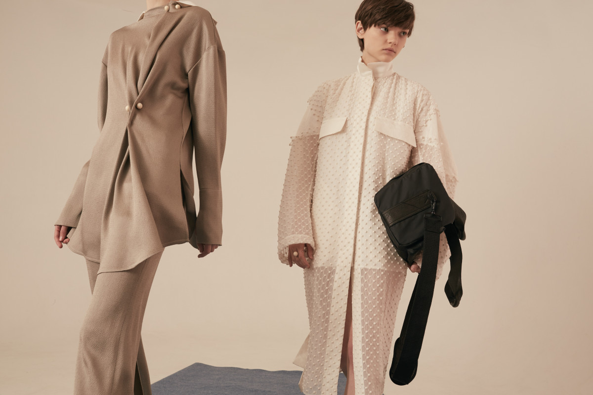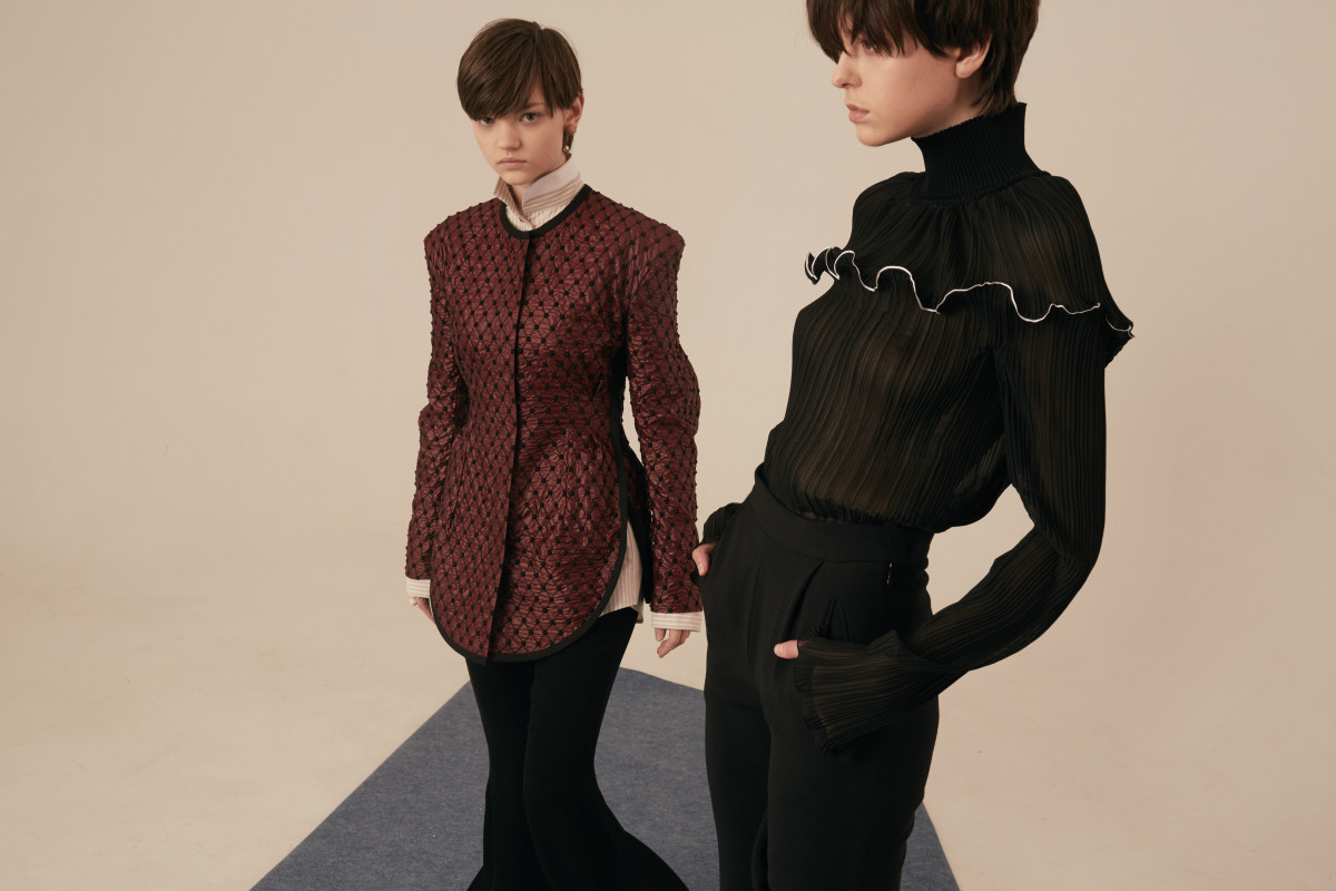 Этот принцип работает и в коллекции. Героиня со своим глубоким внутренним миром идет против заданных правил большой игры (религии). Одновременно благодаря своим культурным рамкам, и верой в собственный ход событий, она вовлечена в спортивную игру, которая, словно метафора к ее образу жизни: она любит добиваться результата и не боится бросать мяч, зная, что он срикошетит назад. Элементы спортивной одежды можно увидеть в двусторонних бомберах из бордовой болоньи с объемной вышивкой шелковыми нитями, а также платьях и боди из люрексового трикотажа. Материал с эффектом цифрового принта – лишнее напоминание о том, что современные технологии никогда не заменят такие реальные вещи, как сила воли и рвение, необходимые в спорте.