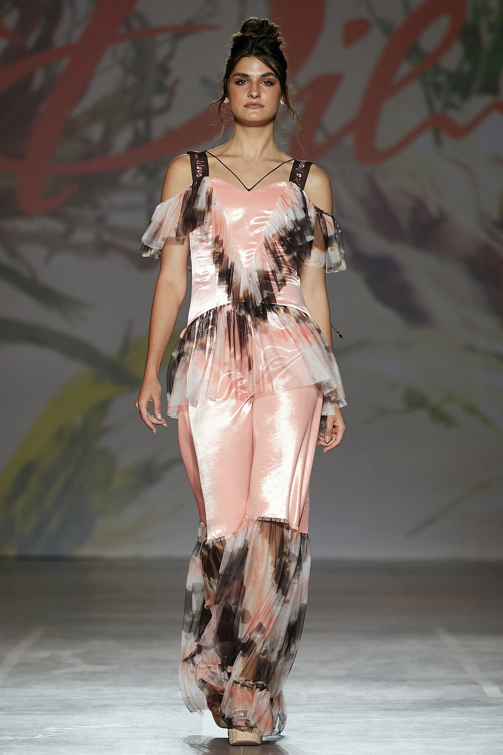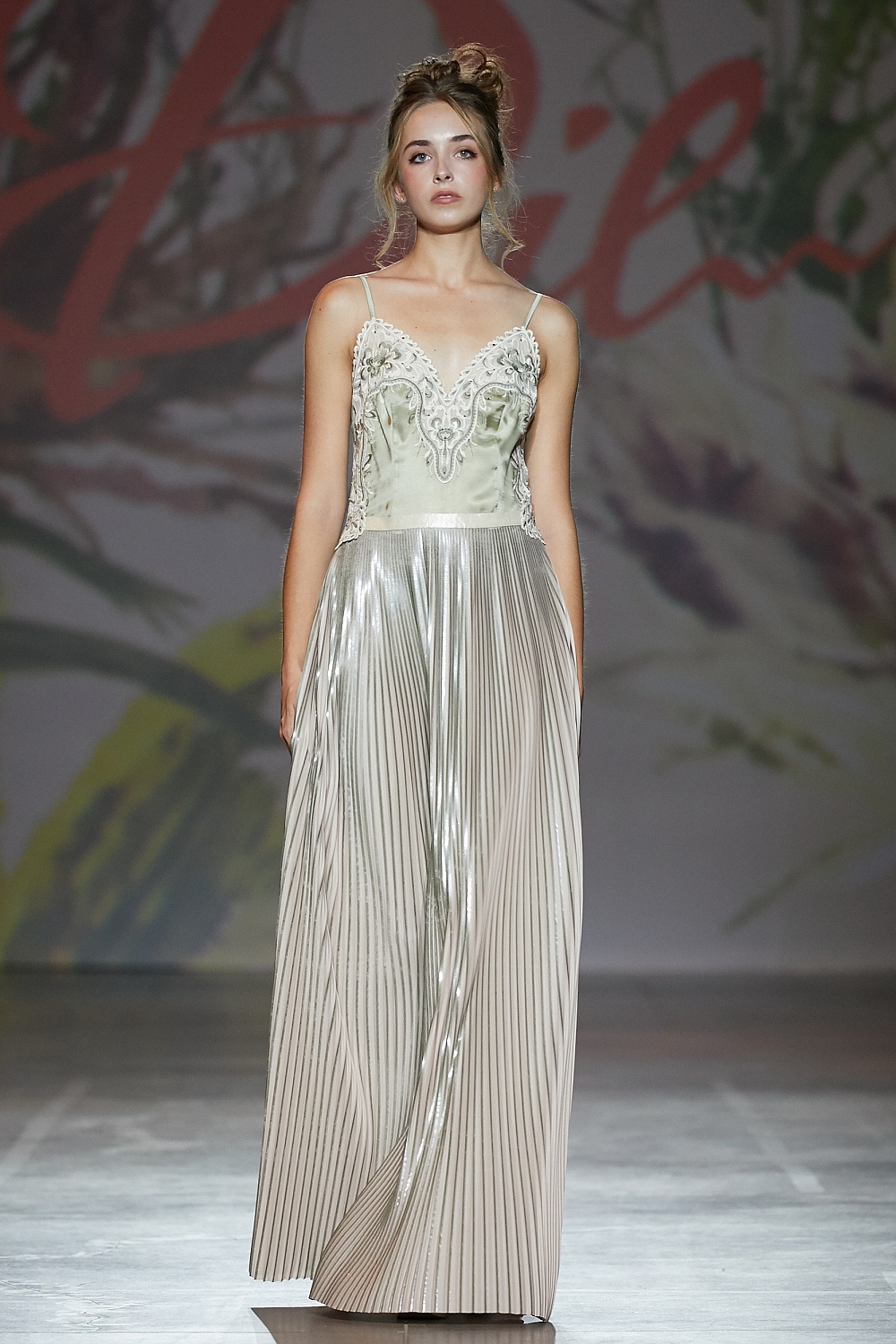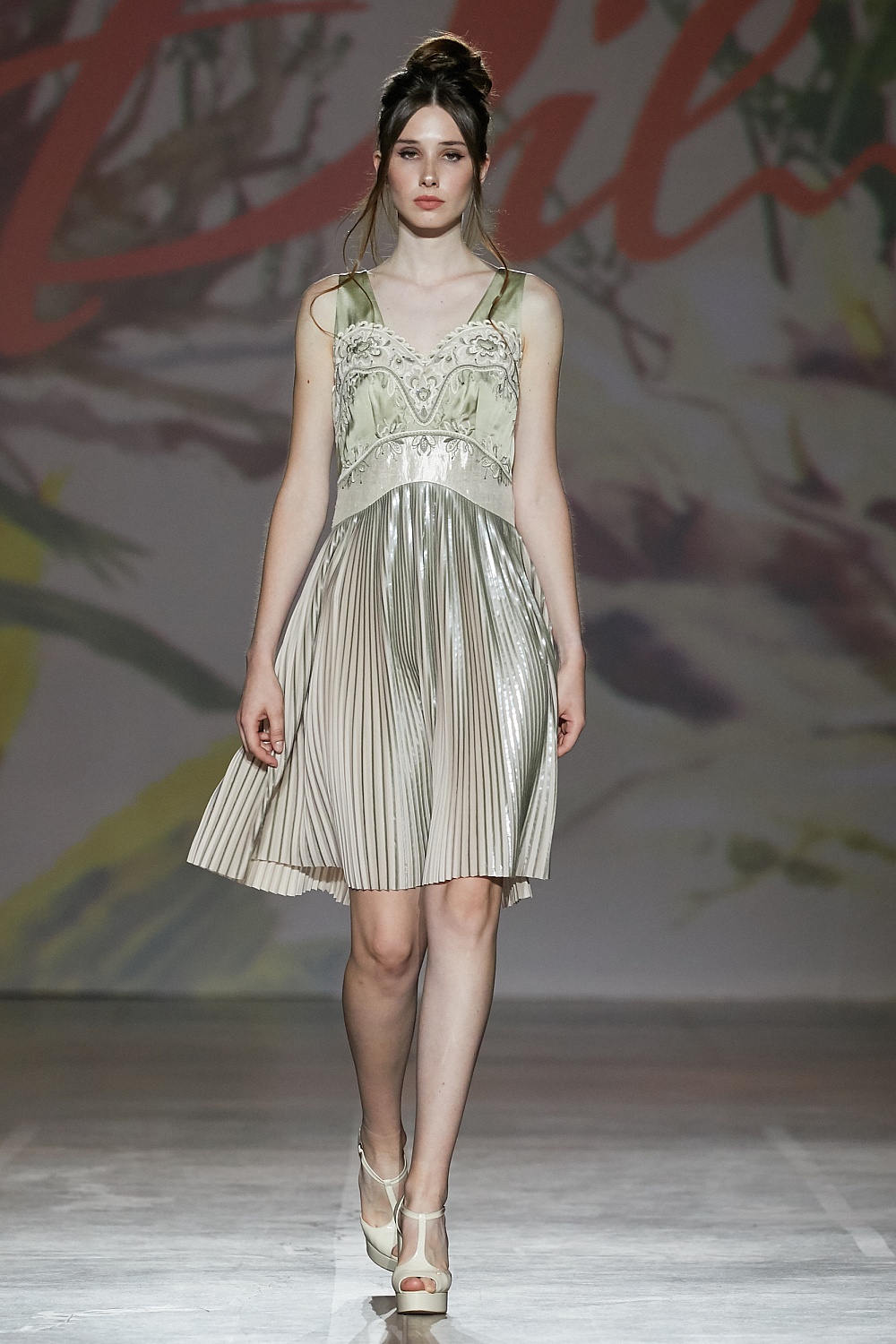 Iryna Dil сделала ставку на металлизированные ткани, которые создают жемчужное мерцание, а также натуральные лен, вискозу, батист и шелк. Трендовая фактура плиссе наполнила силуэты объемом и динамикой.