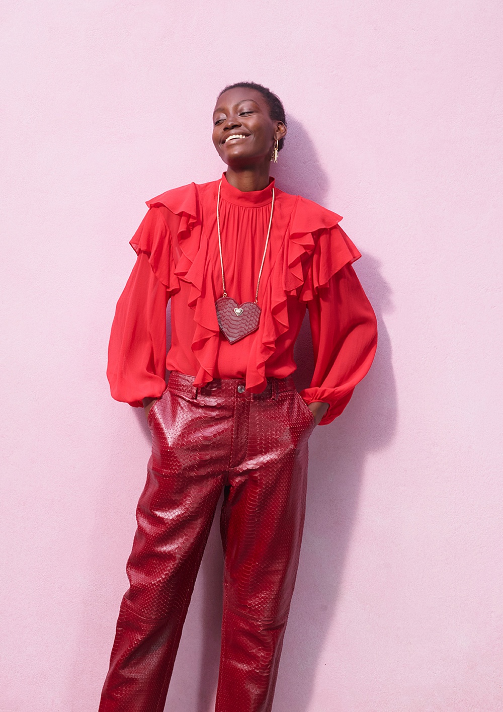 Платья занимают центральное место в коллекции. Модели с корсетом струятся ниже талии, при этом движения подчеркиваются кружевной каймой, красивыми принтами и пышными слоями. Драматичное красное платье раскрывается гигантскими оборками на плечах, как крылья ангела. Принты в мелкий цветочек придают платьям настроение рококо.