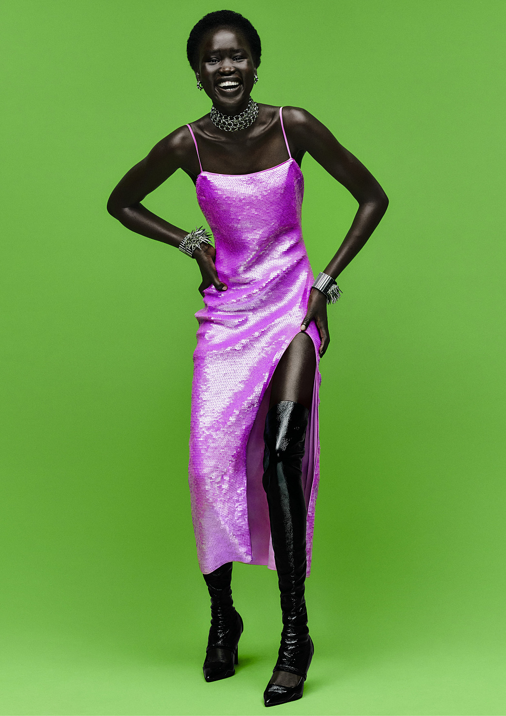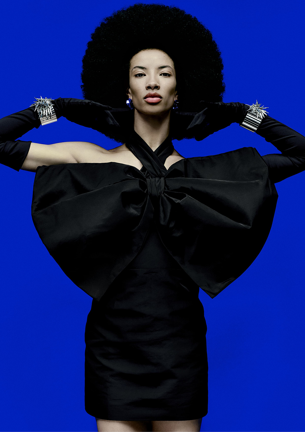 Коллекцию разрабатывали совместно со стилистом Иб Камарой, который выступил в качестве креативного консультанта. Среди одежды есть как драматические объемы и маскулинные силуэты, так и обтягивающие боди и облегающие мини-юбки.
