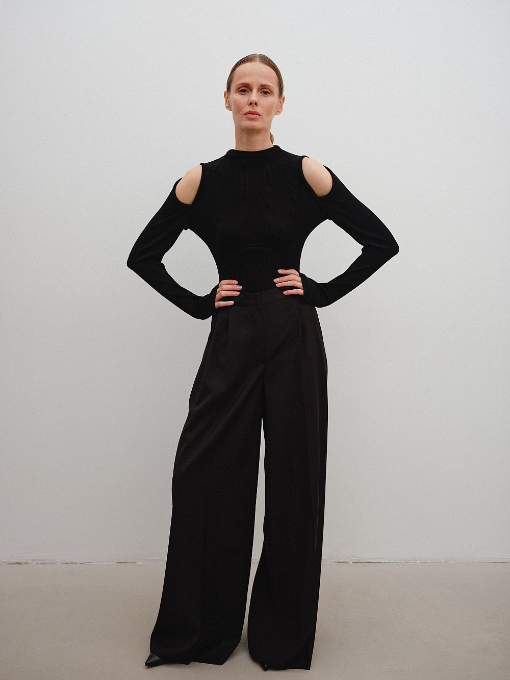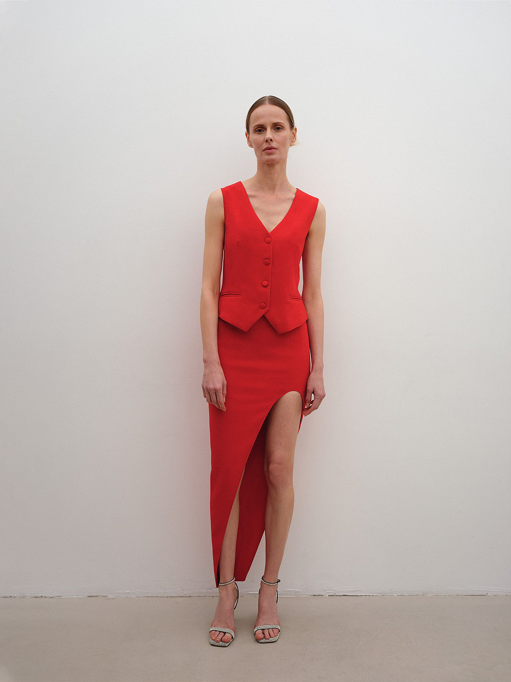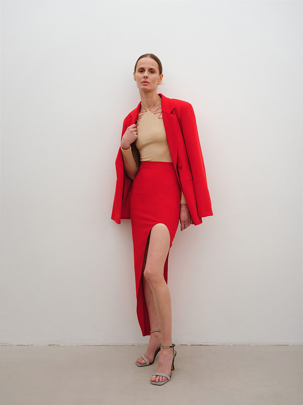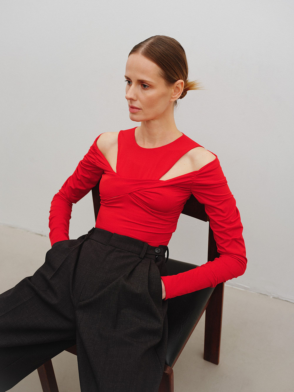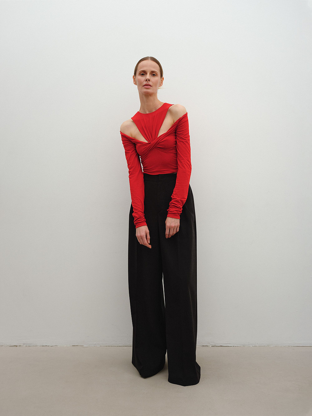 Дизайнерка впевнена, що навіть базові речі мають бути незвичайними, тому дає можливість «гратися» з ними. Червона мінісукня дозволяє експериментувати зі ступенем відкритості вирізів. Двостороннє боді можна носити як шнуруванням наперед, так і на спину. А посадка штанів палаццо регулюється завдяки ґудзикам на талії.
