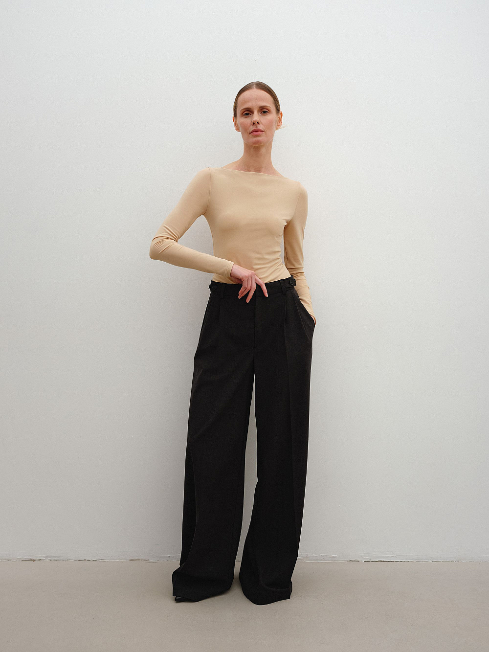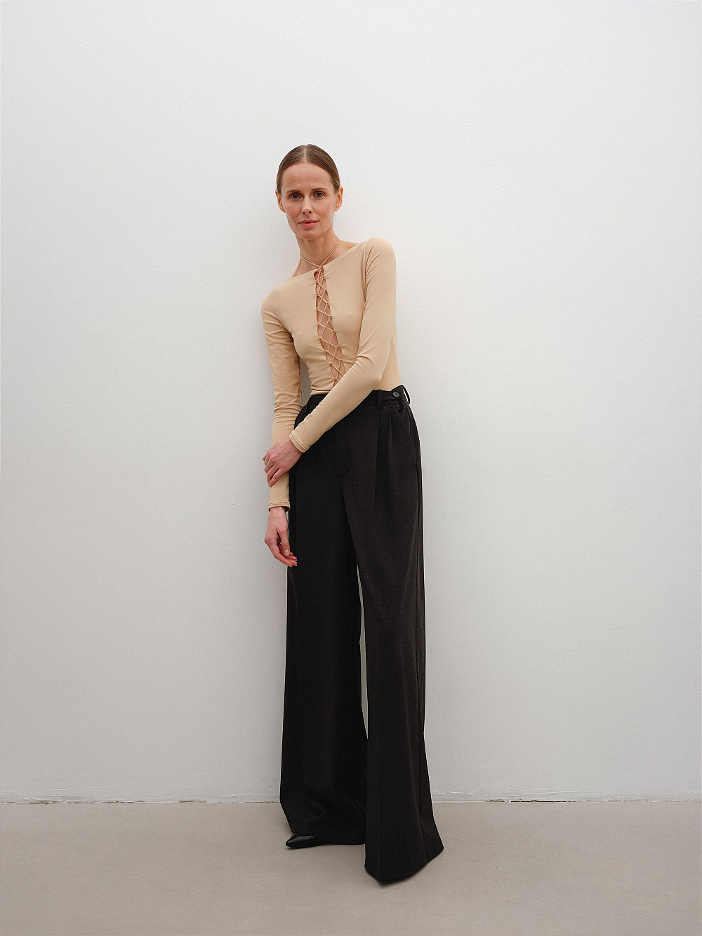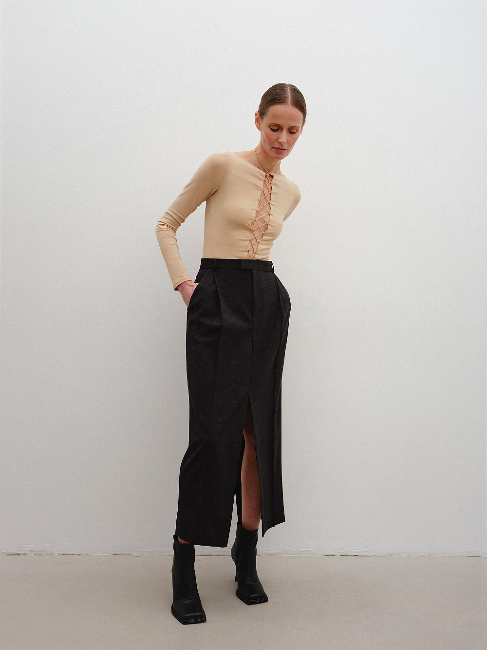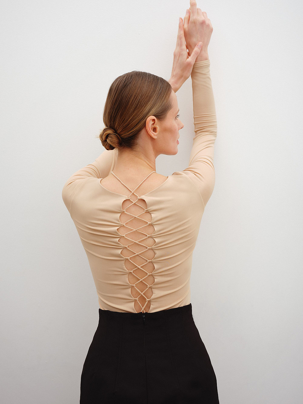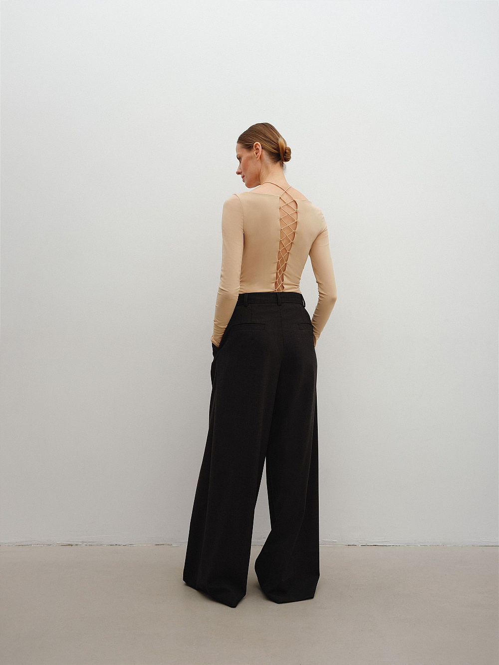 Дизайнерка впевнена, що навіть базові речі мають бути незвичайними, тому дає можливість «гратися» з ними. Червона мінісукня дозволяє експериментувати зі ступенем відкритості вирізів. Двостороннє боді можна носити як шнуруванням наперед, так і на спину. А посадка штанів палаццо регулюється завдяки ґудзикам на талії.