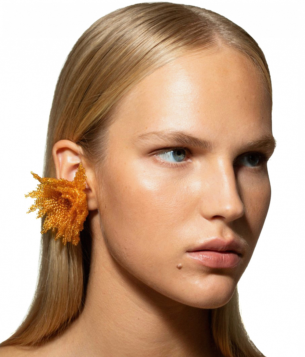 Робота з бісером традиційна для українського декоративного мистецтва, і, взявши її за основу, бренд Ruslan Baginskiy за допомогою кутюрних технік додає їй нової цінності й нового значення. Окрім бісеру в колекції використовується срібло для застібок сережок та підвісок з логотипом RB.