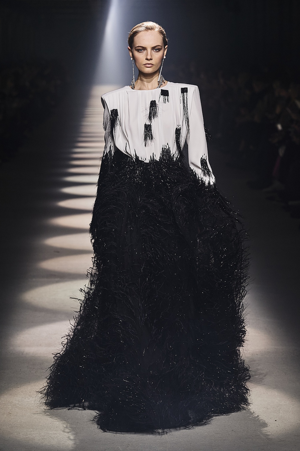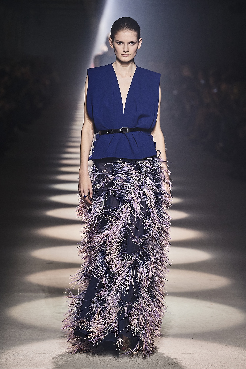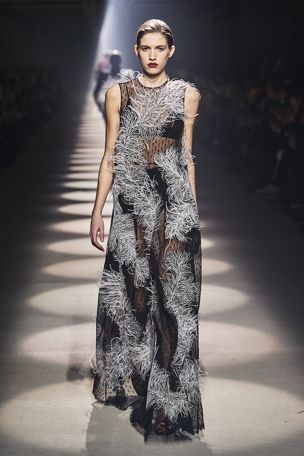 Кинематографичные образы для современных жительниц мегаполиса дизайнер предлагает собирать из минималистичных платьев с драматичными вырезами, безупречных костюмов и прозрачных юбок, покрытых перьями и кристаллами.