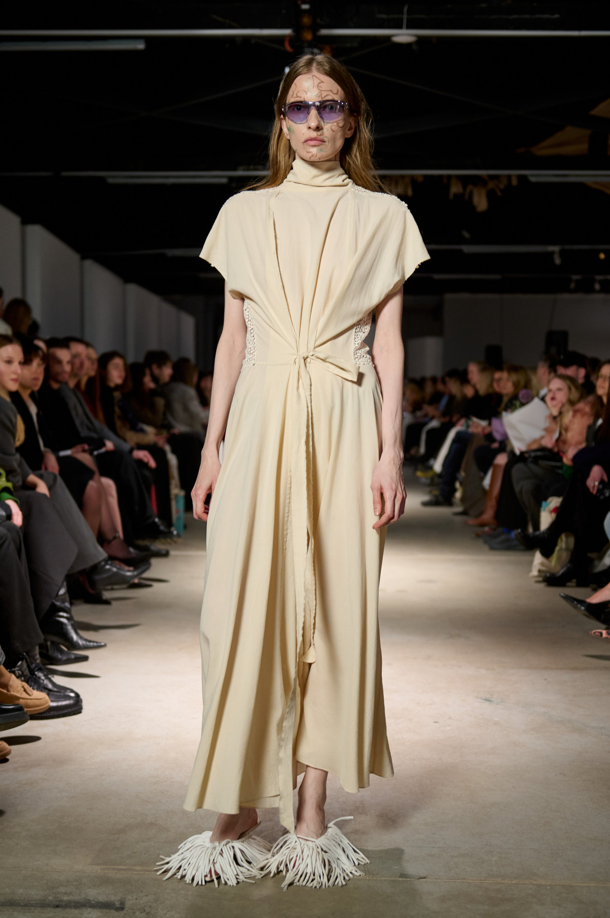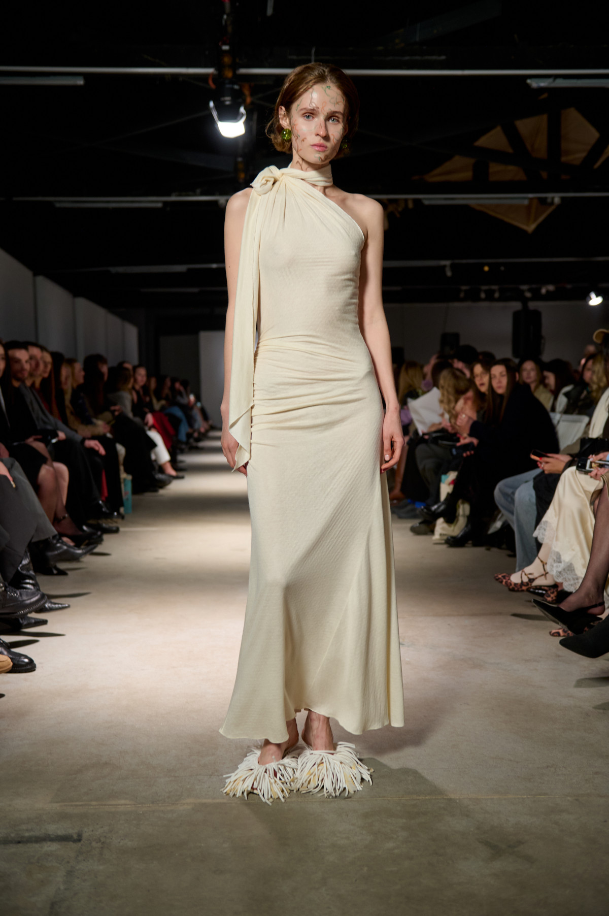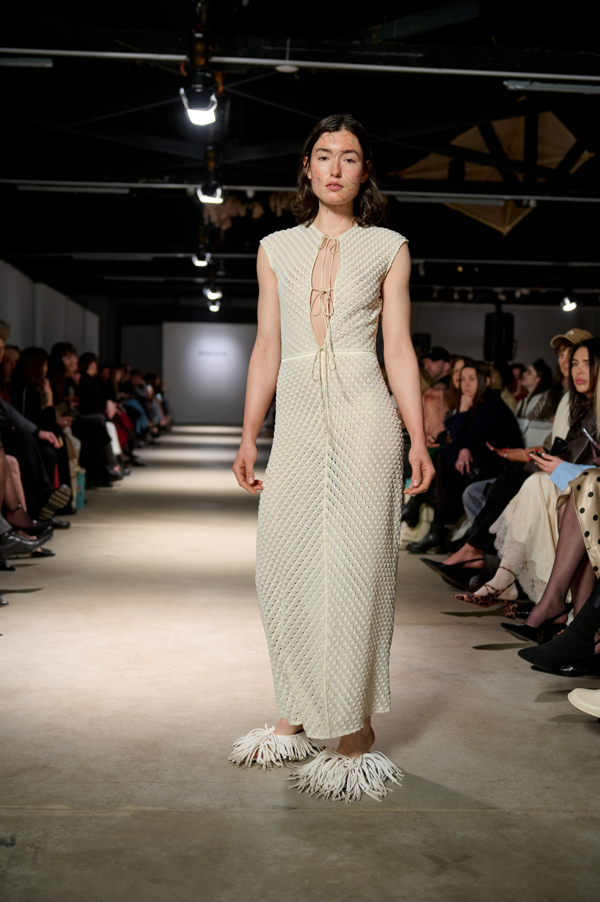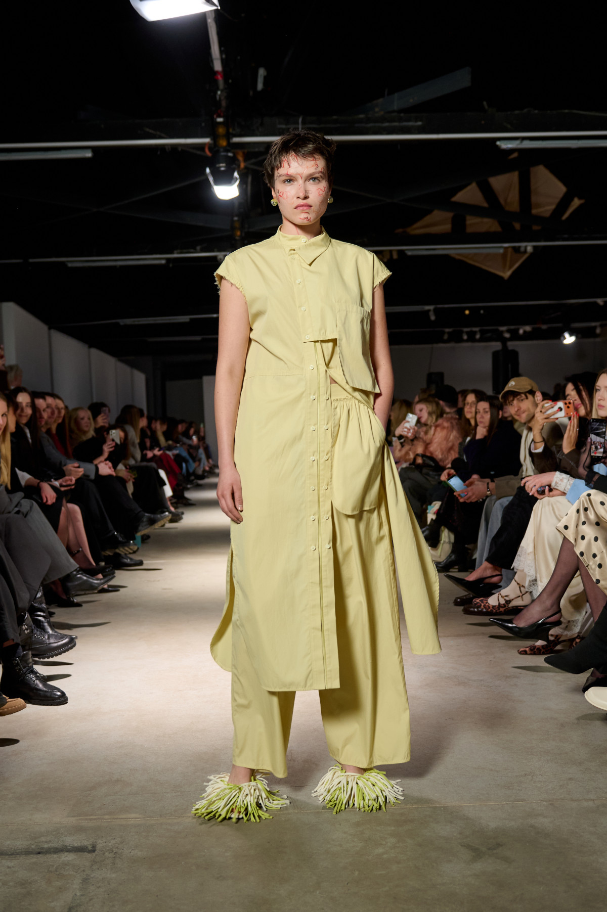 У колекції зʼявилися нові матеріали, зокрема креш-бавовна, а також збереглася робота з печворком як частиною sustainable-коду бренду. Крафтова необробленість країв, декоративні шви назовні та відкрита підкладка виробів сформували відчуття недосконалої, але чесної краси. Знімні комірці-хустки на сукнях-сорочках додали архітектурності, а шовкові бюст’є-бра з подвійними бретелями та стрічками — тендітності й чутливості.
