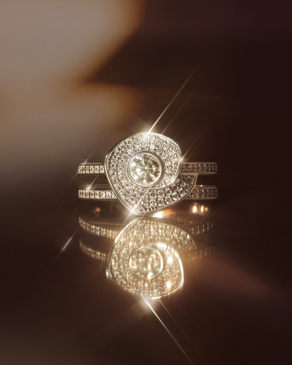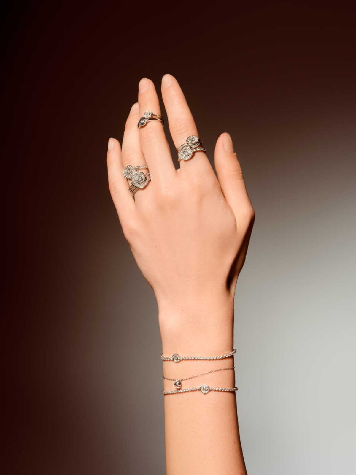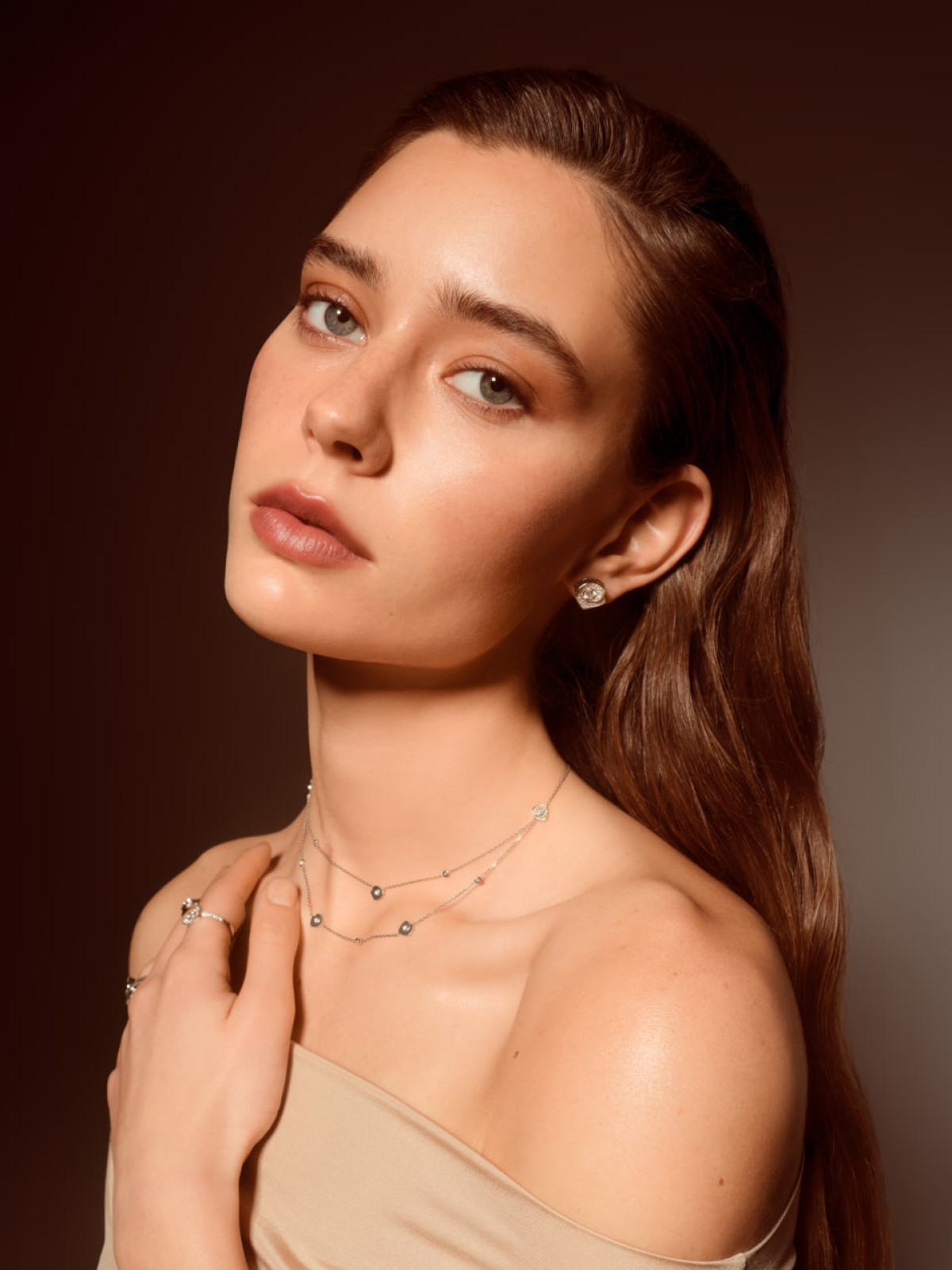 Колекція ROSÉ грає на контрасті двох характерів. Одні прикраси — мінімалістичні, з гладкими пелюстками без додаткових акцентів. Інші вкриті розсипом діамантів різних розмірів, що разом створюють ефект об’ємного сяйва, ніби світло проходить крізь пелюстки й підсвічує їх зсередини.