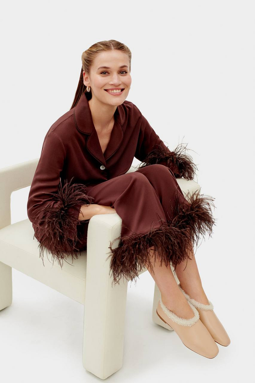 Класична Party Pajama виконана з віскози, а манжети штанів та сорочки прикрашені невагомим пір’ям у тон виробу. Пір’я відстібається, що робить комплект простим у догляді та дозволяє легко перетворити костюм у вбрання на вихід. У колекцію увійшли комплекти у шоколадному, яскраво-рожевому кольорах та принті Blue Vichy. Комплект можна носити як удома, так і за його межами — гуляти містом, накинувши улюблений тренч, або піти на вечірку, доповнивши образ акцентними підборами.