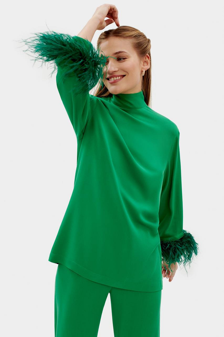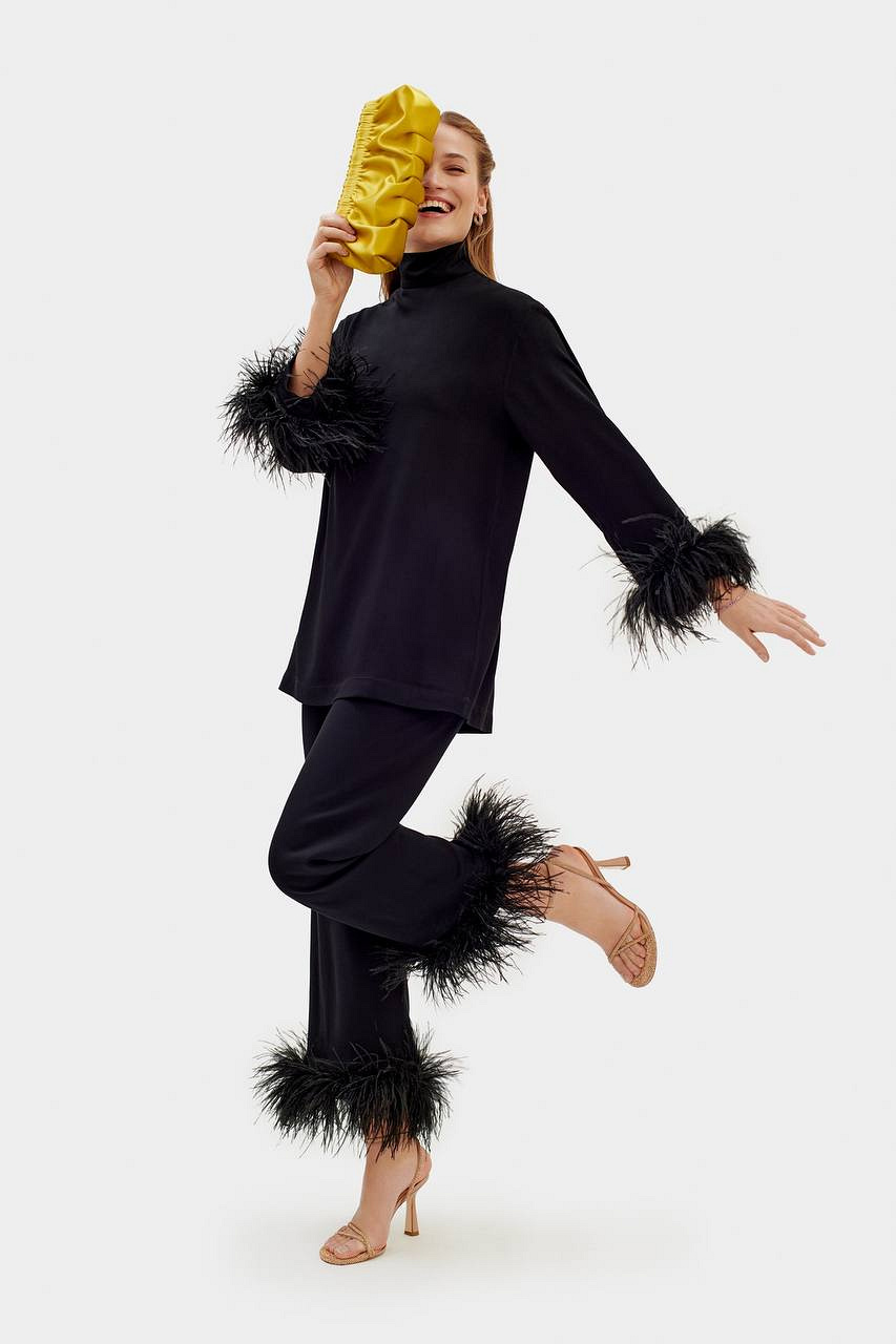 Ошатна піжама Black Tie також виконана з віскози. Верх представлений вільною блузою з високим коміром. Закритий топ надає піжамі строгості та зібраності. Манжети штанів та блузи прикрашені невагомим пір’ям у тон виробу. Пір’я легко відстібається. У колекцію увійшли комплекти в класичному чорному, святковому смарагдовому та яскраво-рожевому кольорах.