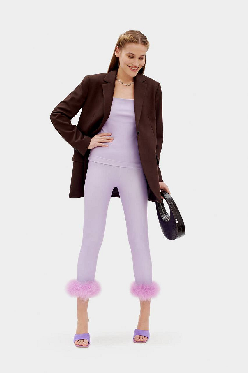 Костюм вихідного дня з легінсами зроблений з ніжного переробленого поліестеру, сертифікованого за стандартом Global Recycled Standard. Квадратний виріз лонгсліва підкреслює зону декольте. Низ легінсів та лонгсліва прикрашений знімними елементами з пір’я. Костюм комфортно прилягає до тіла та не сковує рухів. У колекцію увійшли моделі у класичному чорному, яскраво-рожевому та бежевому кольорах. Ідеальний для занять спортом та прогулянок.