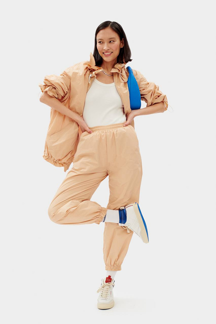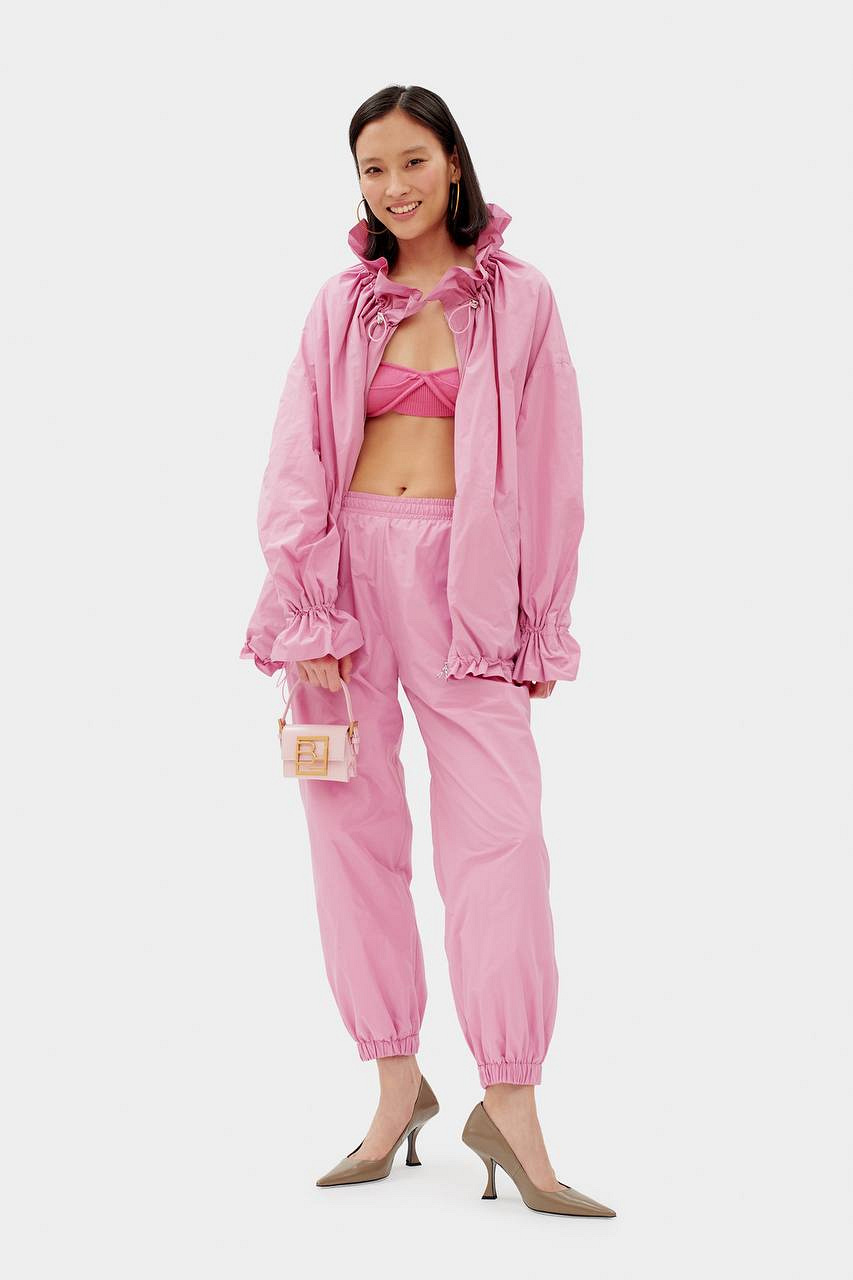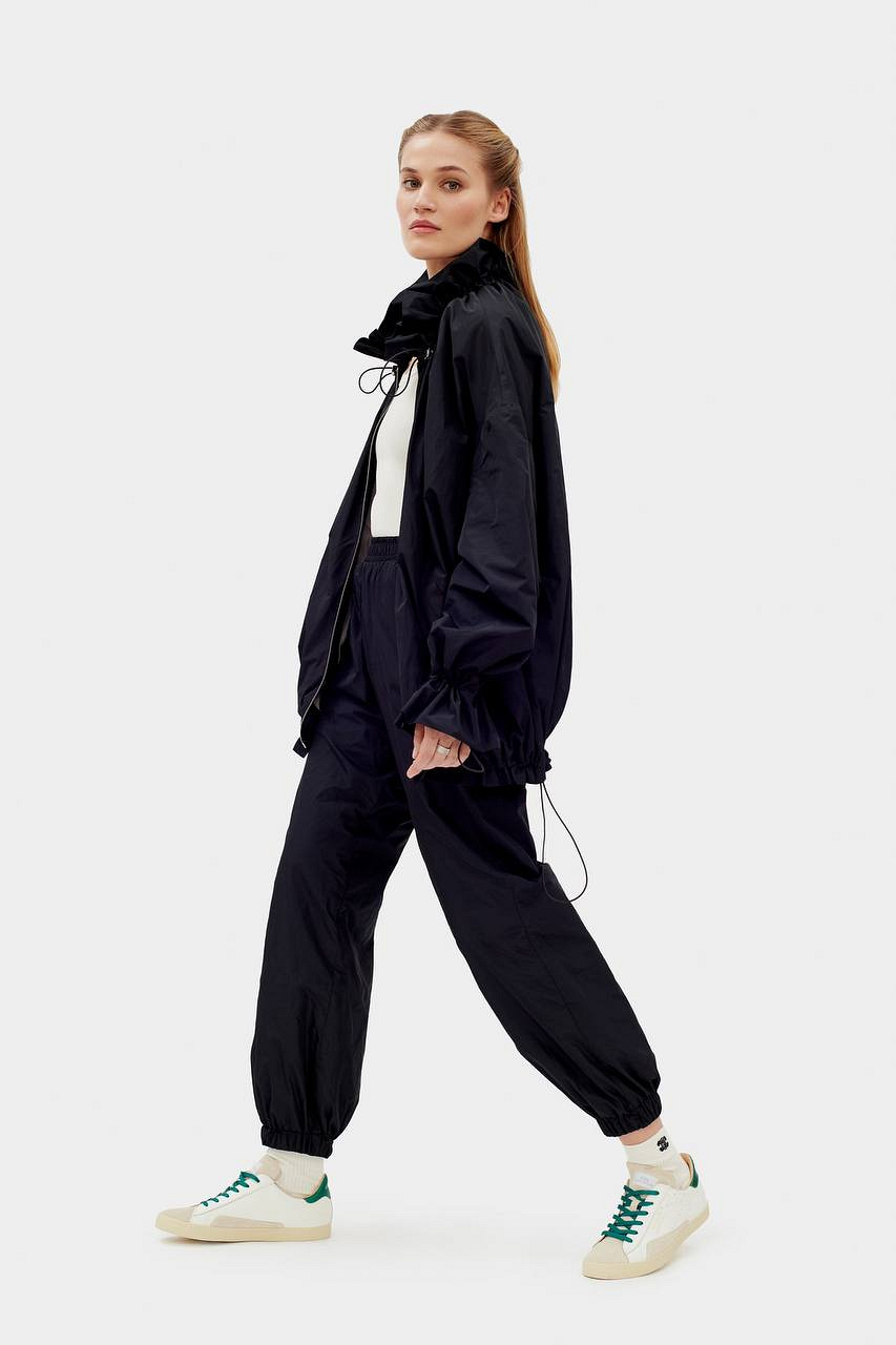 Прогулянковий костюм виконаний у розслабленому крої. Верх представлений курткою з грайливим коміром у вікторіанському стилі, а низ — штанами з косими кишенями. Об’єм куртки легко регулюється затяжками. Модель виконана з глянцового переробленого матеріалу — тафти. Представлена у класичних чорному, бежевому та шоколадному кольорах, а також у яскравих — смарагдовому та вогняно-рожевому.