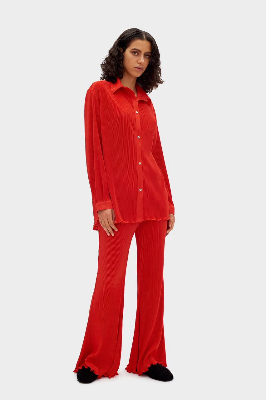 Піжамний костюм вільного крою виконаний з рельєфної тканини із жатим ефектом. Верх представлений вільною сорочкою з контрастними смарагдовими ґудзиками, низ — штанами кльош. Застебнута на всі ґудзики блуза додасть образу суворості. Ідеальний для дому та виходів у світ — доповнивши костюм клатчем та босоніжками, можна піти в театр або на танці. Костюм доступний у рожевому, вогняно-червоному та чорному кольорах.