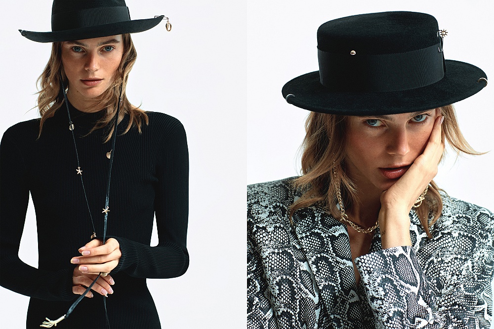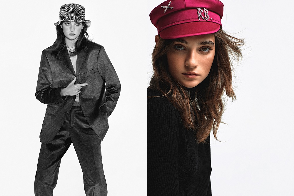 Для съемки стилист Надя Шаповал подобрала главные осенние модели Ruslan Baginskiy: шапки-ушанки из искусственного меха, фетровые шляпы с металлическими деталями, обручи из тафты и знаковые для бренда фуражки – клетчатые и ярко-розовые, украшенные сверкающими кристаллами и узнаваемой вышивкой с инициалами дизайнера.