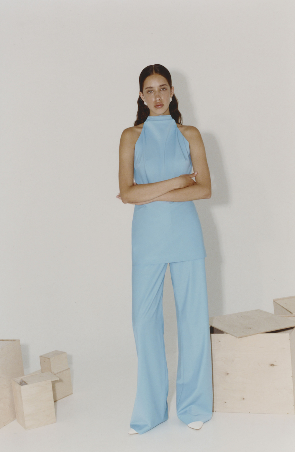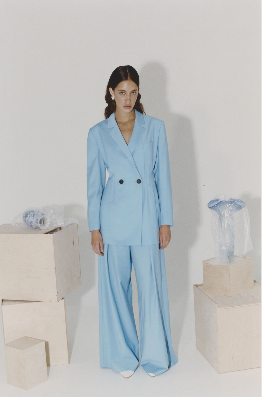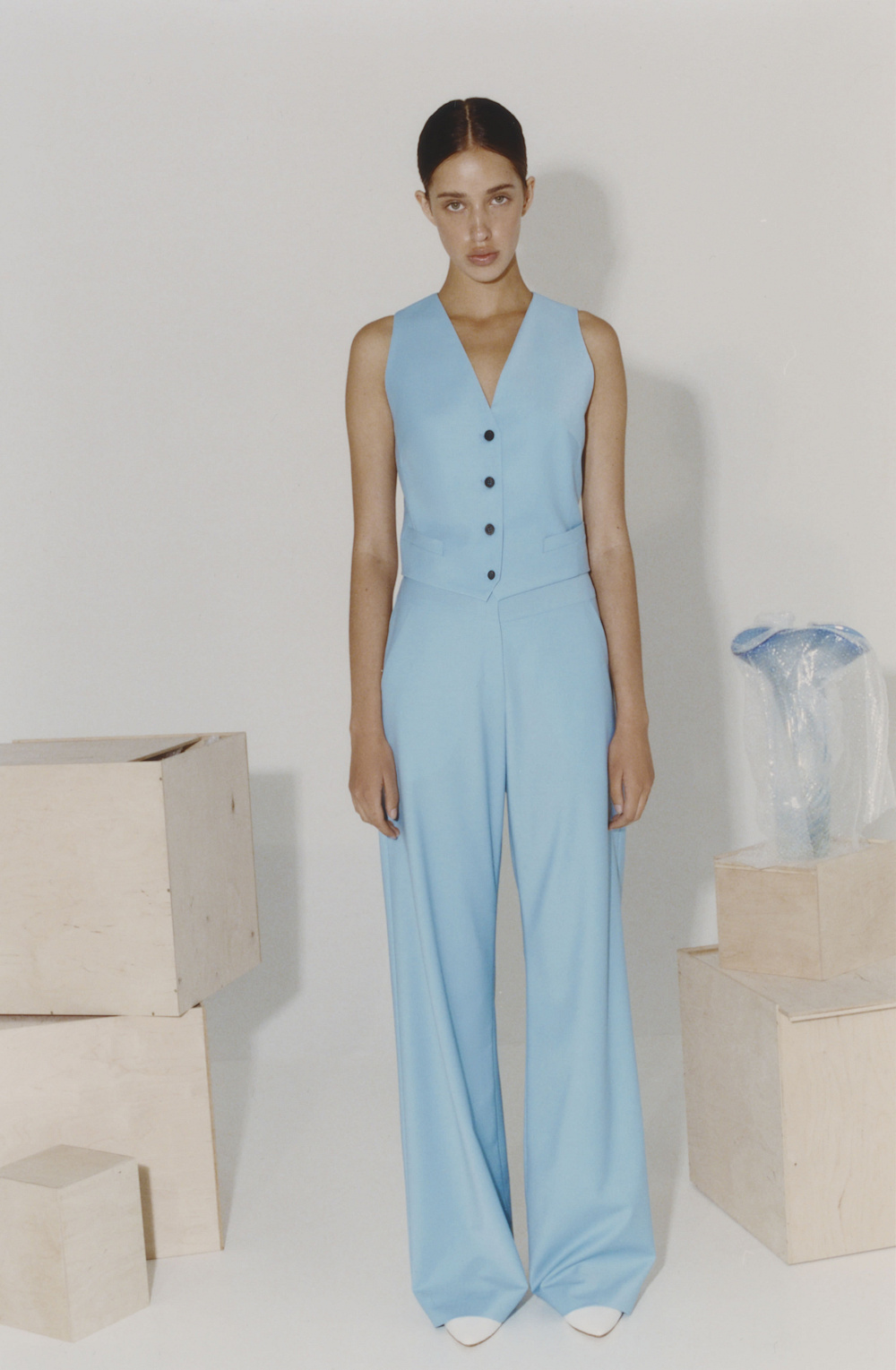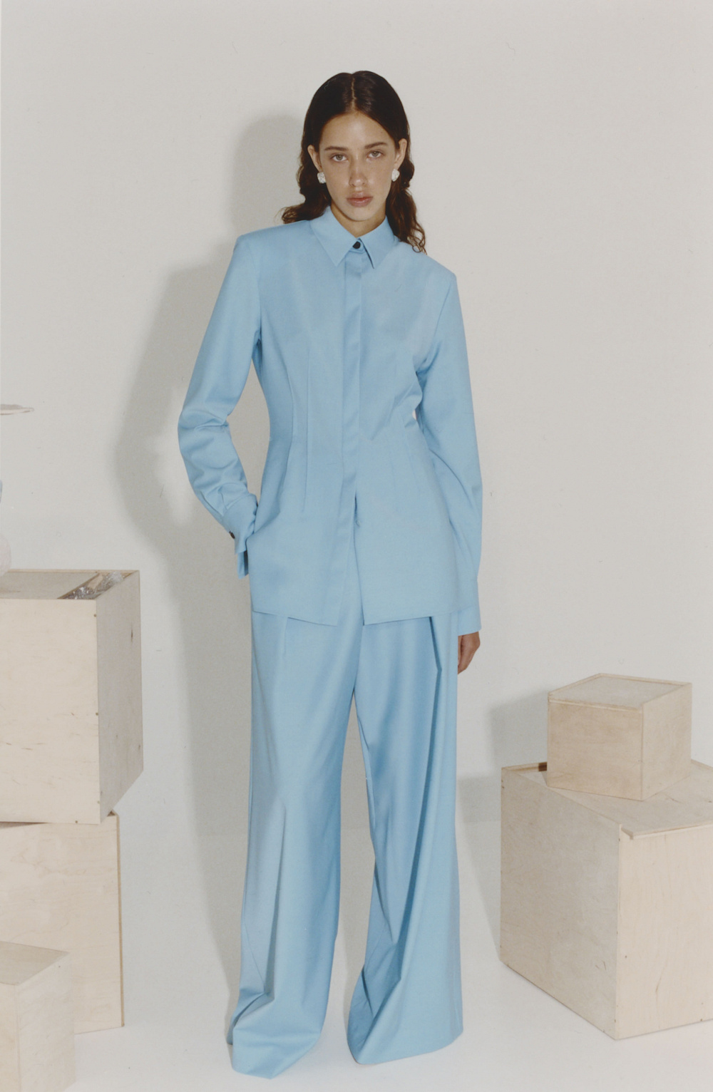 Культ жінки, поклоніння жіночій енергії та материнству, який існував у Трипільській культурі, знайшов відображення у колекції ELENAREVA у вигляді жіночних силуетів та делікатних акцентів в області бюста на шовкових сукнях та блузах. Характерні для бренду костюми-трійки в колекції SS`23 представлені у ніжно-блакитному та молочному кольорах.