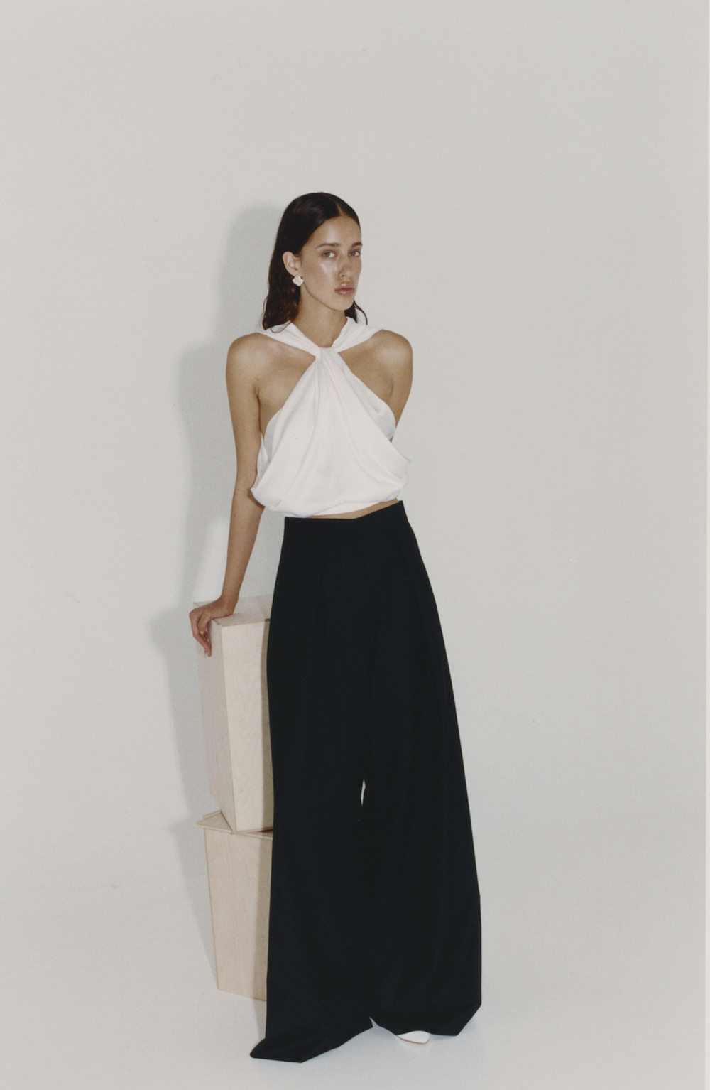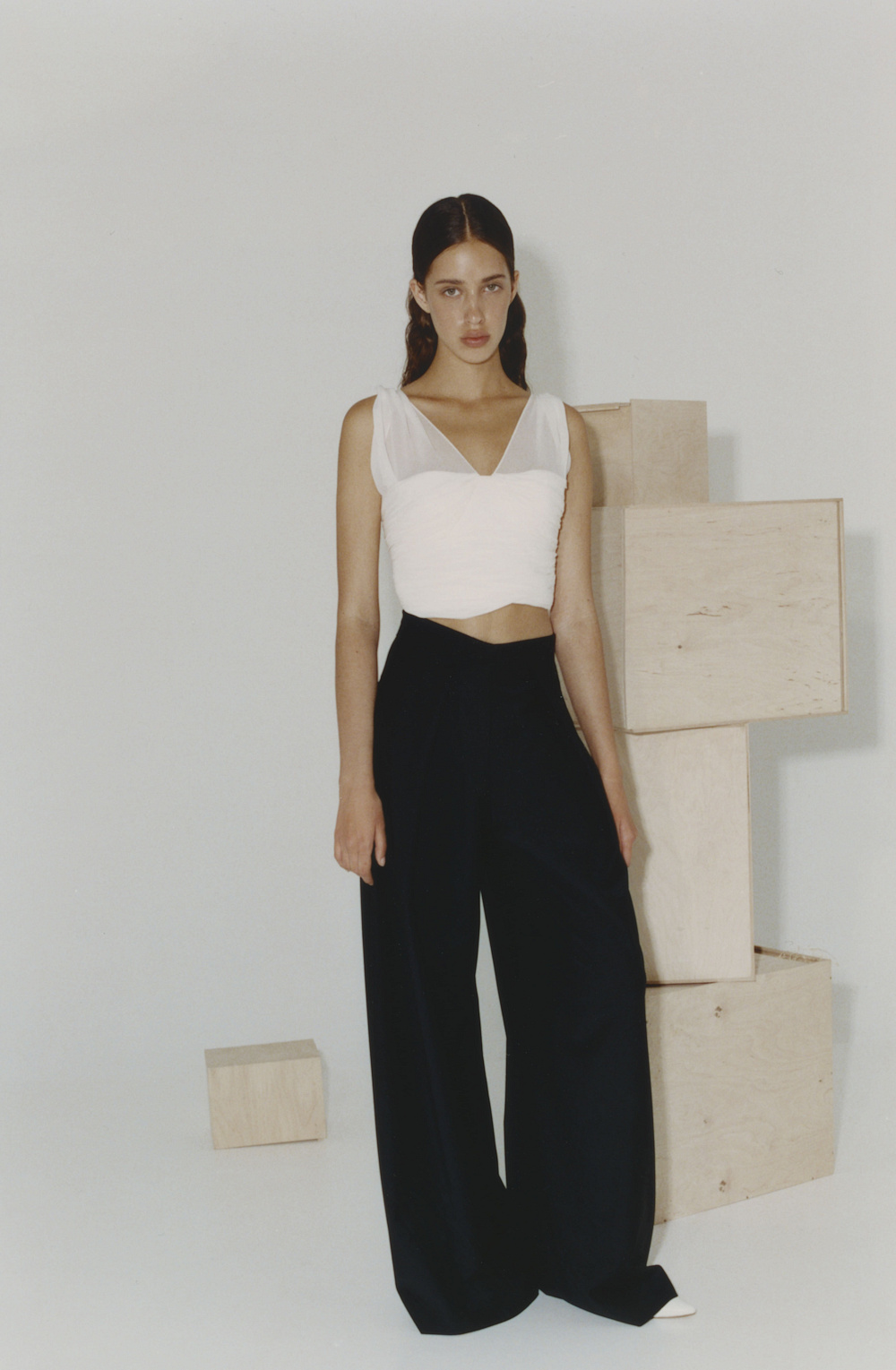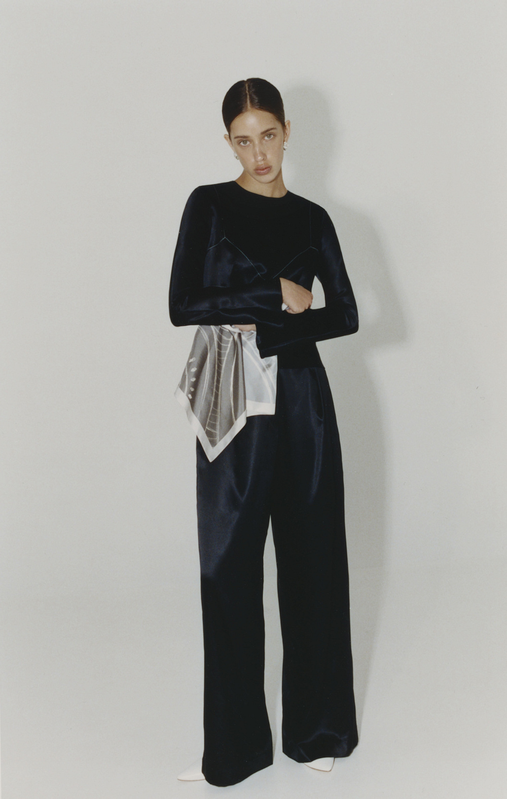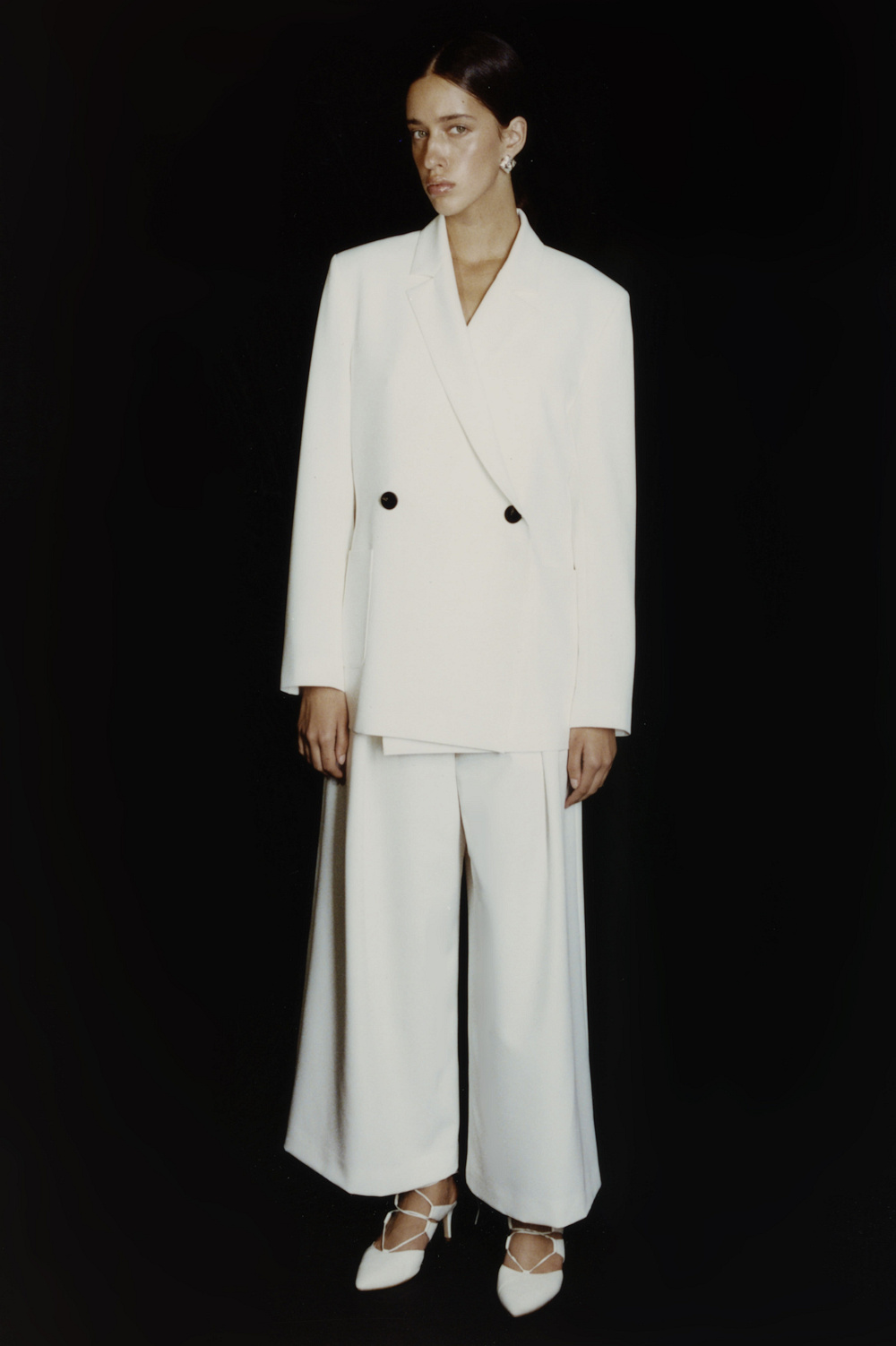 Культ жінки, поклоніння жіночій енергії та материнству, який існував у Трипільській культурі, знайшов відображення у колекції ELENAREVA у вигляді жіночних силуетів та делікатних акцентів в області бюста на шовкових сукнях та блузах. Характерні для бренду костюми-трійки в колекції SS`23 представлені у ніжно-блакитному та молочному кольорах.