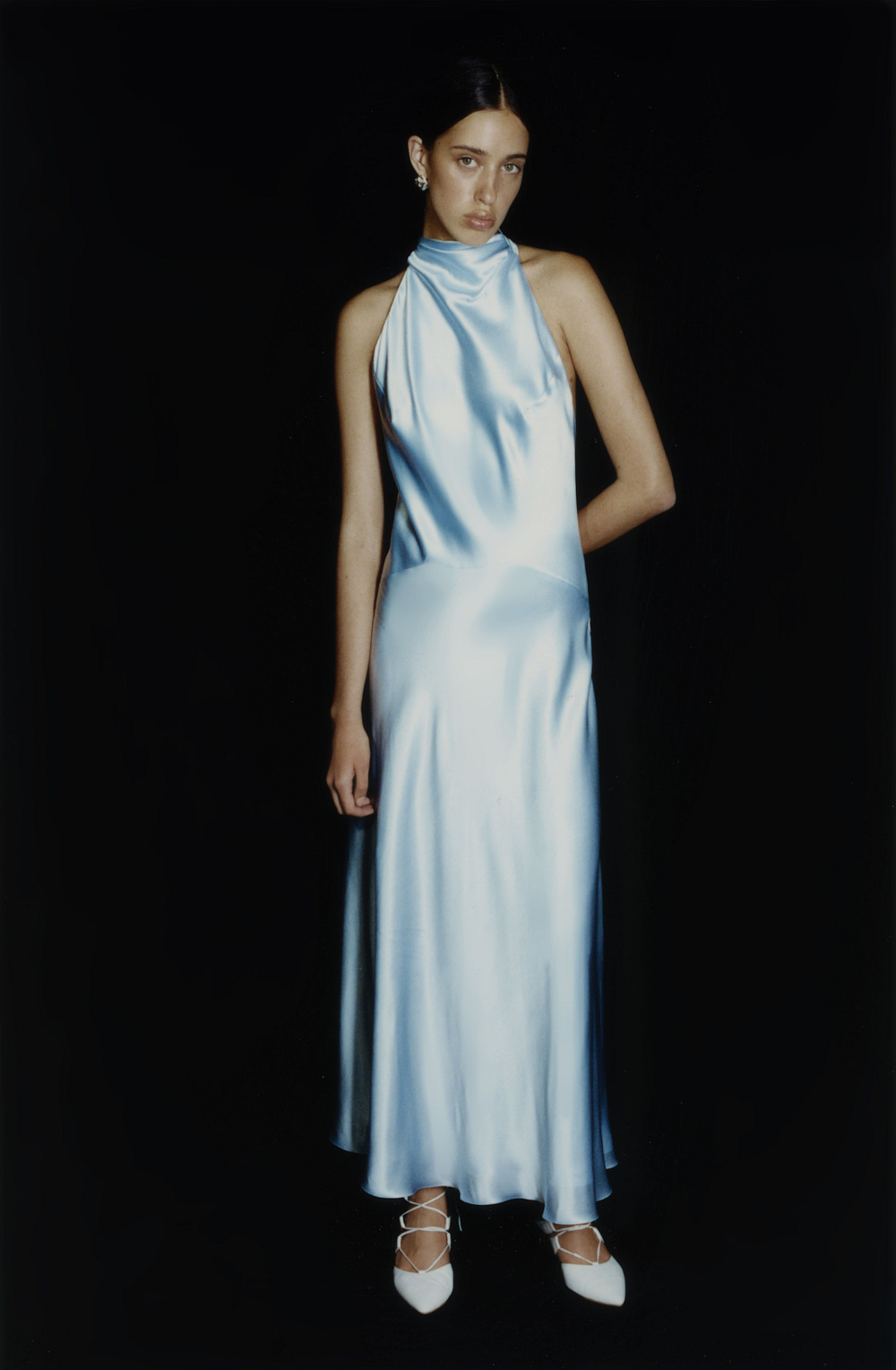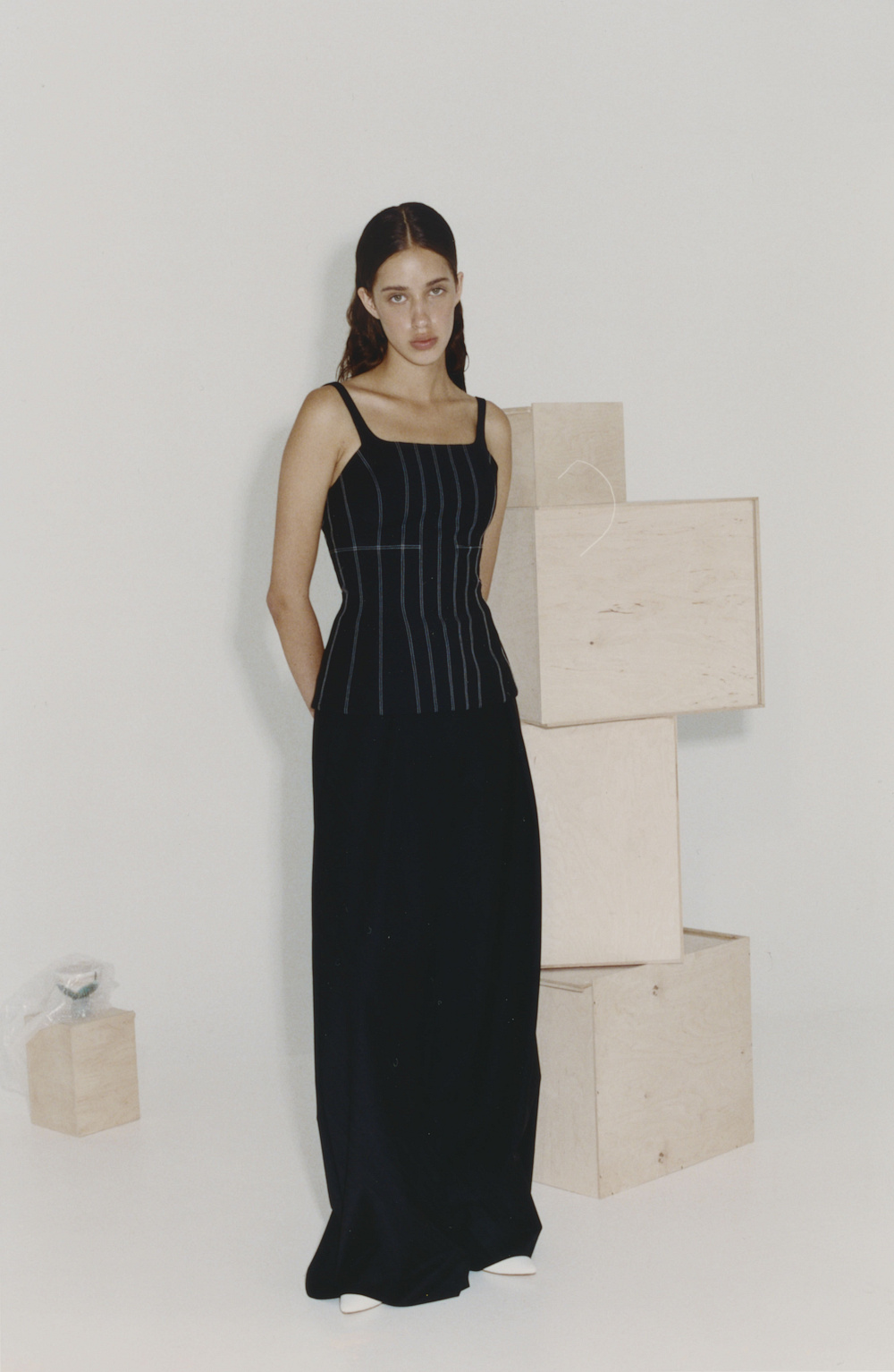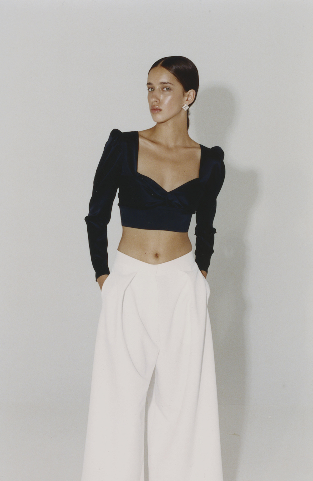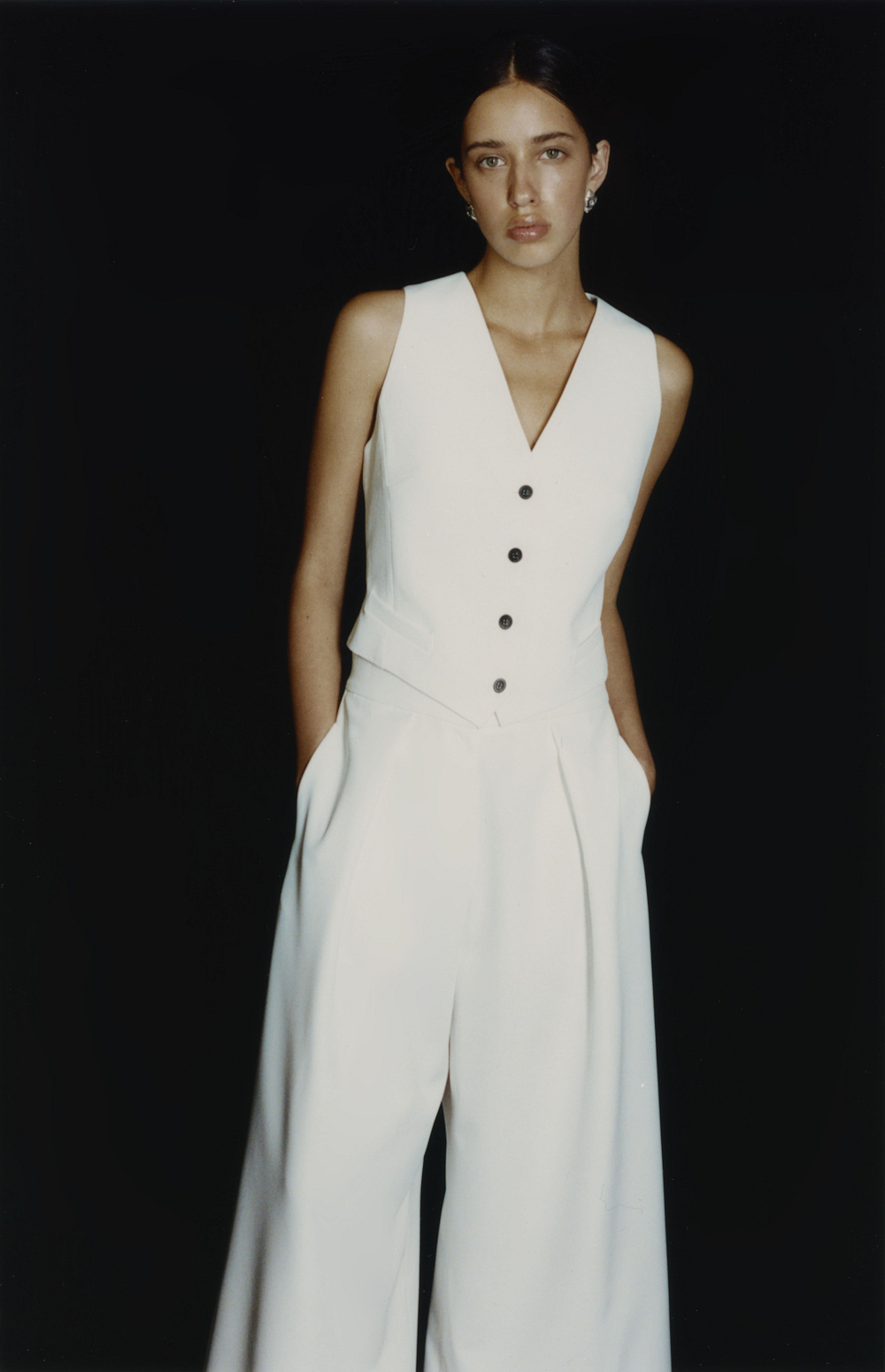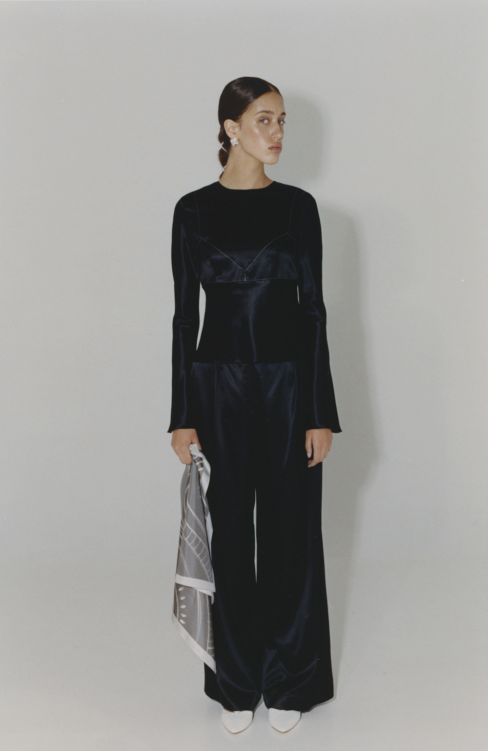 Культ жінки, поклоніння жіночій енергії та материнству, який існував у Трипільській культурі, знайшов відображення у колекції ELENAREVA у вигляді жіночних силуетів та делікатних акцентів в області бюста на шовкових сукнях та блузах. Характерні для бренду костюми-трійки в колекції SS`23 представлені у ніжно-блакитному та молочному кольорах.