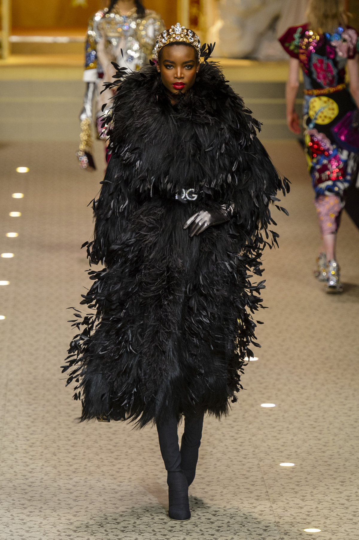 Показ открыли вовсе не модели, а дроны, которые парили перед гостями, демонстрируя сумки из новой коллекции. А вот жакеты, шубы и свитшоты украшали изображения ангелов, как в эпоху рококо. Мария-Антуанетта бы точно оценила платья, дополненные принтами из столовых приборов, юбки с корсетной шнуровой, а также клатчи-мидоньеры, усыпанные стразами, и даже розовый парик. Внедрение современных технологий и смешение всего и вся – два тренда, которые подхватывают многие бренды, чтобы влюбить в себя поколение миллениалов. Похоже, новой коллекцией, в которой помимо роскошных фирменных платьев, был и костюм зебры, и даже мягкая игрушка в руках у одной из моделей, Dolce & Gabbana доказал, что у них пока это получается лучше всех. Подтверждение – самые популярные Instagram-блогеры в первом ряду.