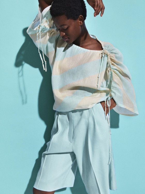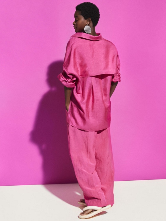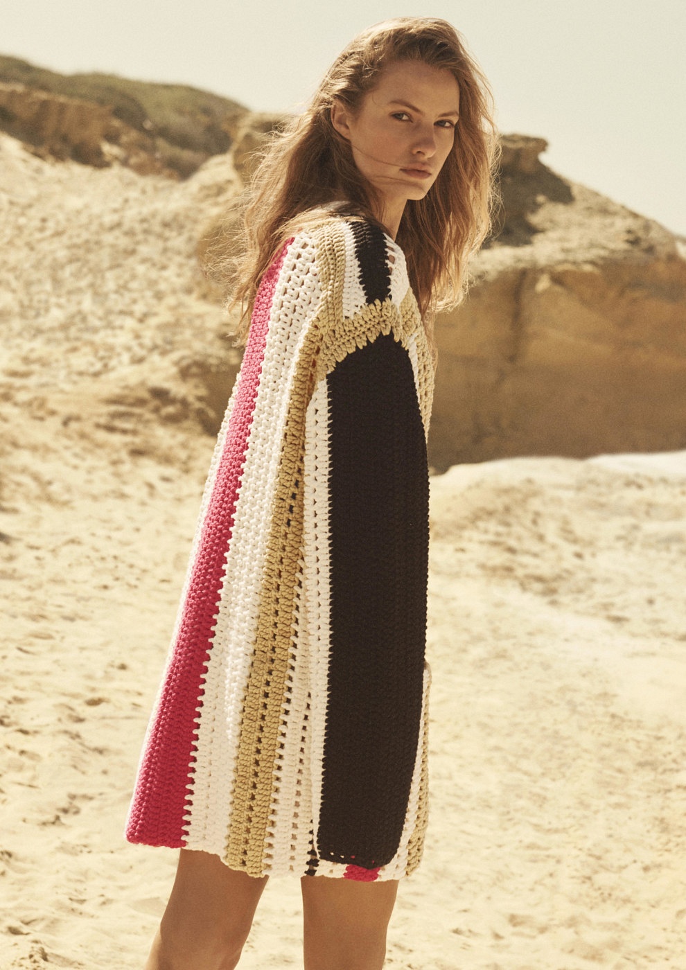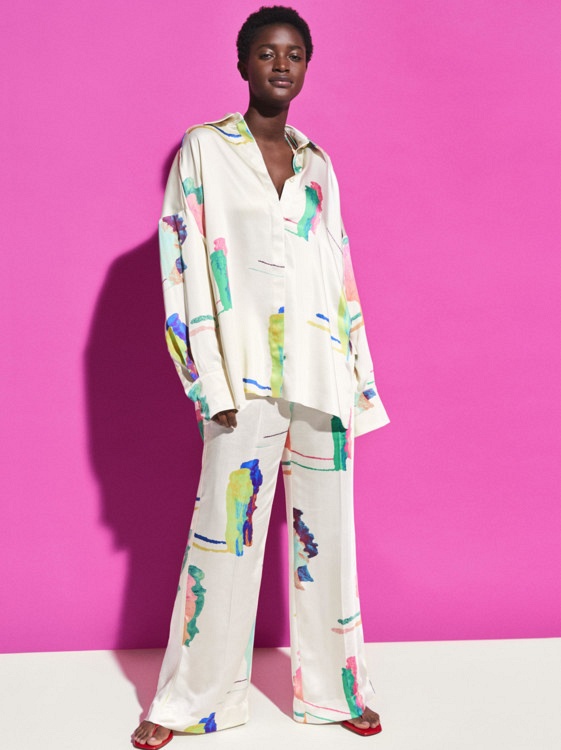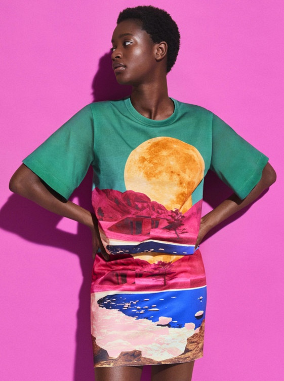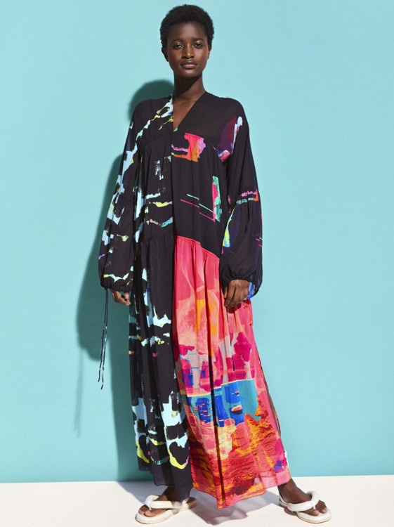 Нетривиальные силуэты и электрические цвета создают беззаботное настроение. Ключевые модели включают воздушное платье в оригинальном принте, полосатые кремовые джинсы, свитер крупной вязки в розовых, кремовых и черных полосах. Натуральные вискозно-льняные волокна придают вещам легкости, а переработанный полиэстер добавляет платьям невесомости.