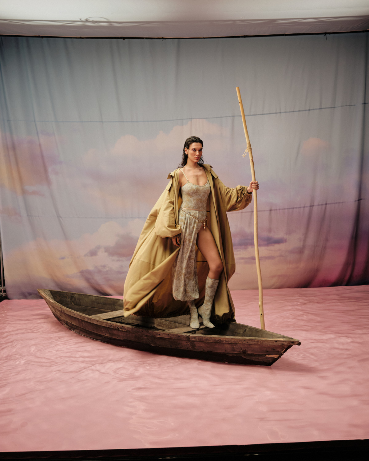 Поєднання фемінних форм, мʼякої шкіри, напівпрозорих силуетів з японської матової сітки та акценти на стегнах зустрічаються з об’ємними конструкціями штанів карго, тренчу та куртки з котону, що відіграють роль кокона.