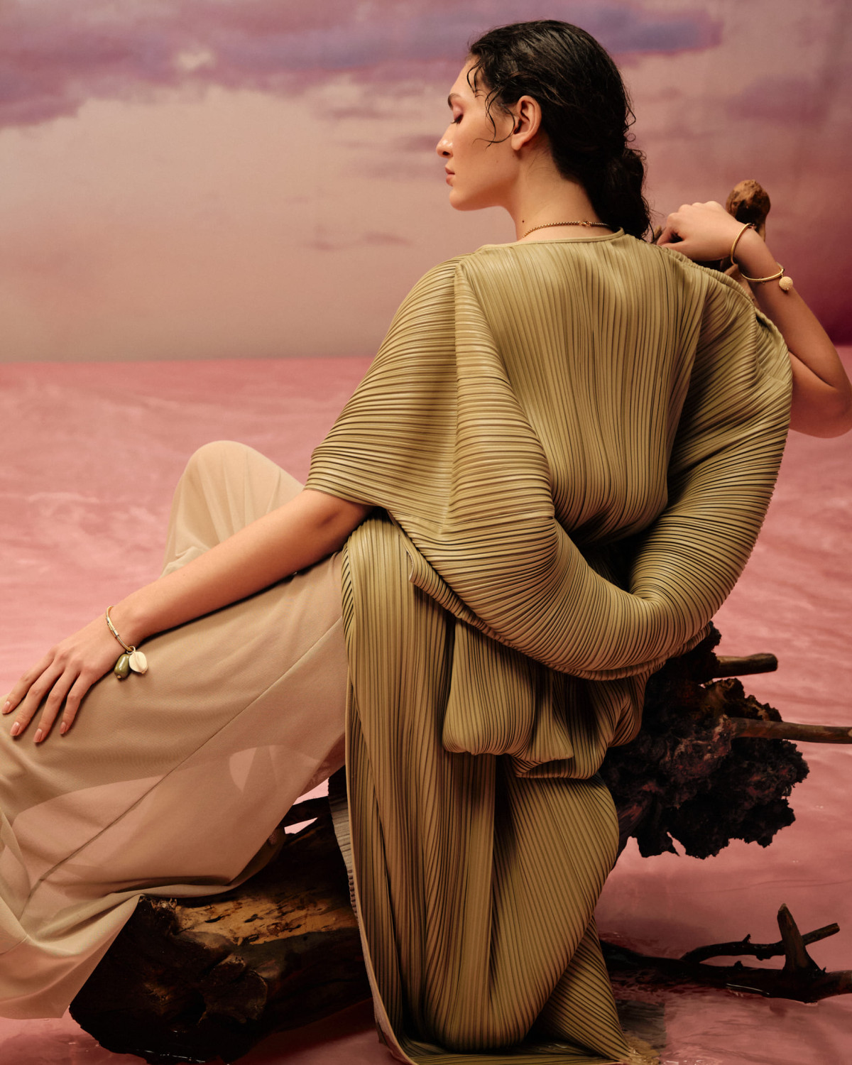 Кольори та принти — це відлуння природи: обпалені сонцем піски дюн, рожеві солоні озера Херсонщини, каміння з малюнками часу, візерунки морського дна, сухі квіти й молоді бутони, пекуче сонце в останні секунди перед зануренням в океан.