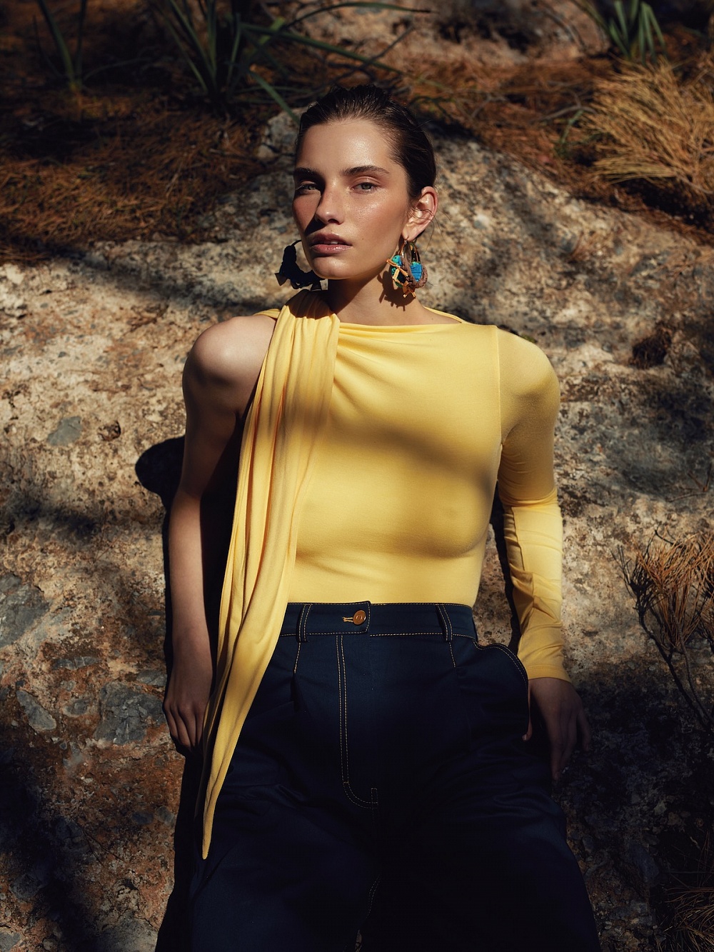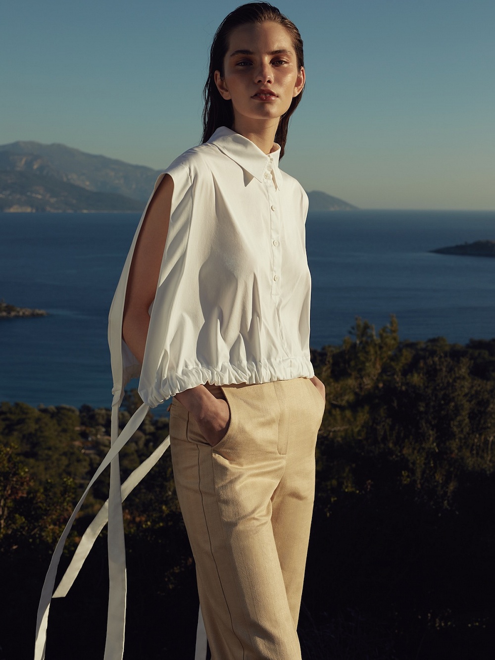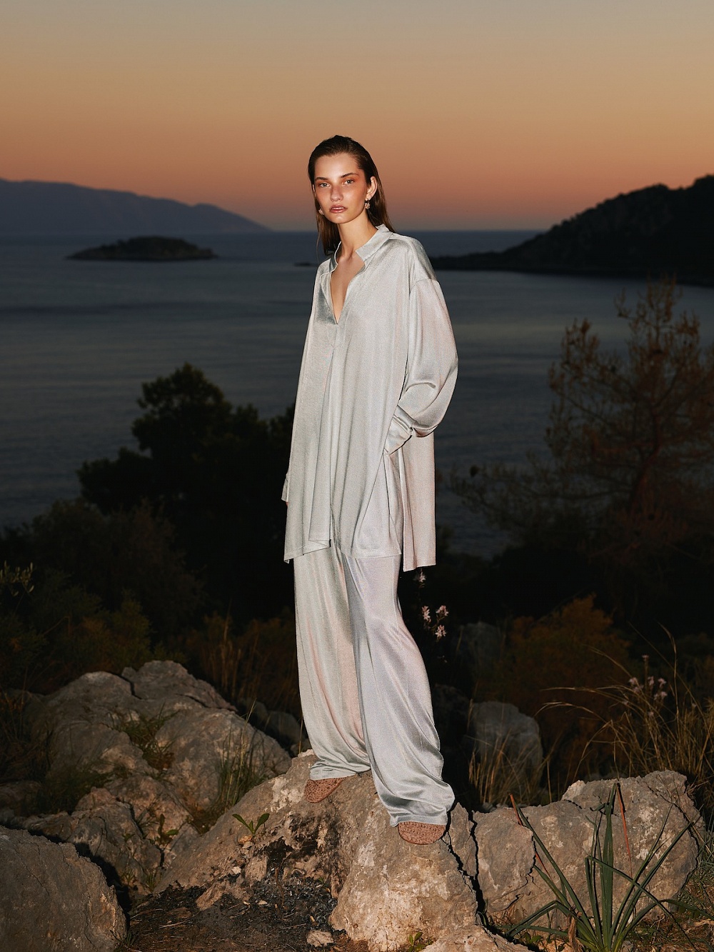 Основной материал - трикотаж, выбранный брендом для летних путешествий. Свободные брючные двойки, мягкие расслабленные силуэты платьев, джемпера из вискозы, хлопка и шелка как будто созданы для уединения и созерцания волшебных закатов. Купальники, топы и сарафаны с чувственными акцентами - обнаженным плечом или тонкими, но эффектными разрезами в районе ключицы стали уже must-have этого лета.