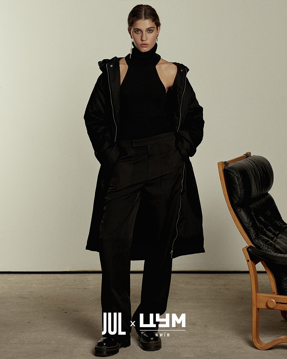 Коллекция Jul x ЦУМ рассказывает про осень в большом городе: от теплого периода до приближения зимних холодов. В основе капсулы тенденции нового сезона, как стилистические, так и цветовые. Трикотажные платья и брючные костюмы свободного кроя для теплой поры сезона, а также водолазки, силуэтные костюмы в рубчик и объемные пуховики, которые будут актуальны в период холодной, глубокой осени. В палитре преобладают черный, оттенки серого, camel, пастельный голубой и красный. Коллекция Jul x ЦУМ создавалась, как универсальный и исчерпывающий осенний гардероб из 20 единиц, которые легко сочетаются друг с другом.