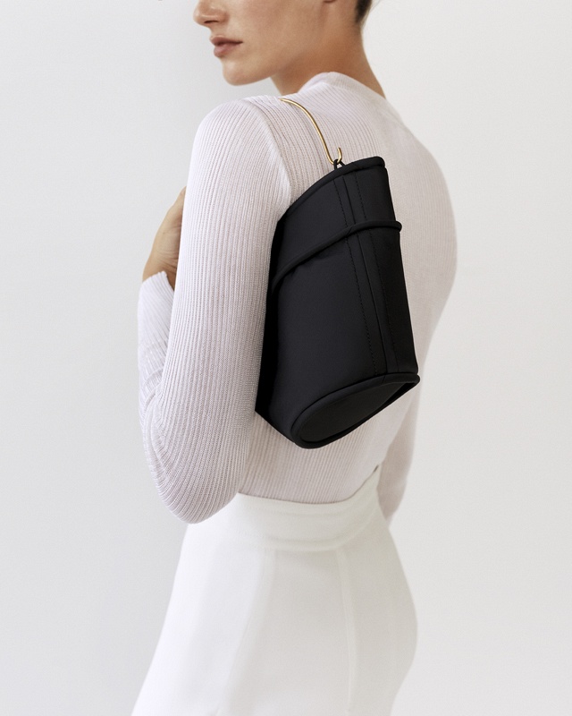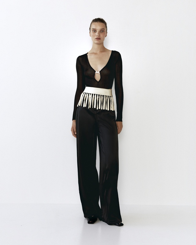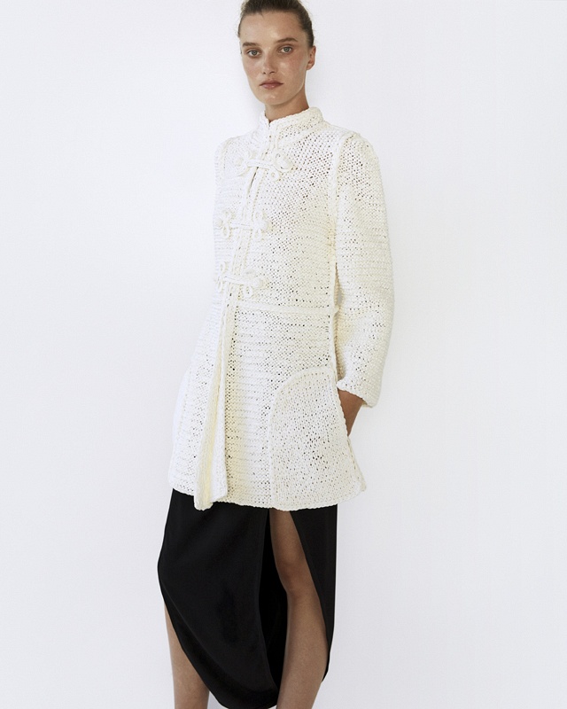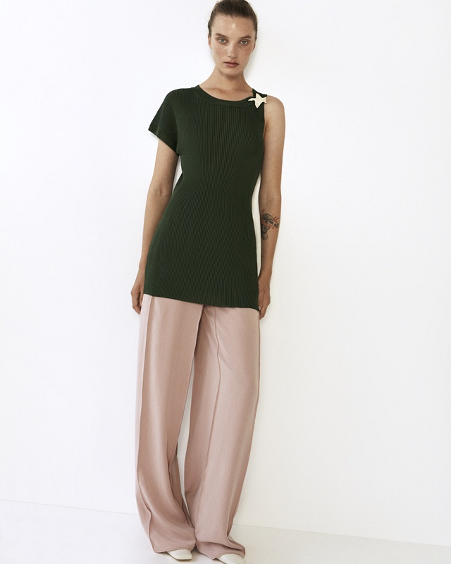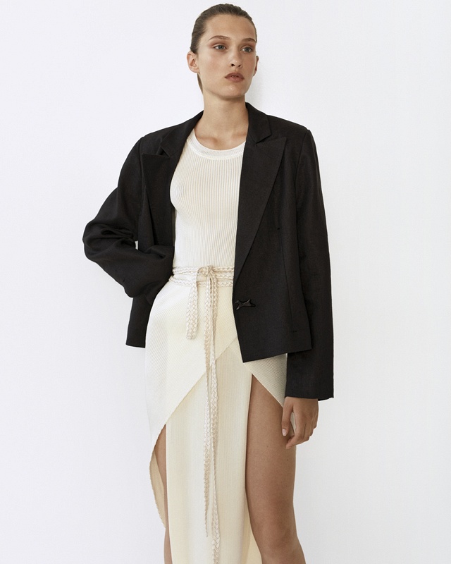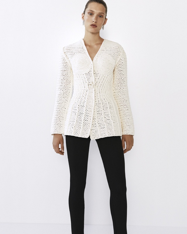 Среди излюбленных платьев-комбинаций в обтяжку и комбинезонов Bevza, можно увидеть структурированный вязаный жакет на основе кожуха – традиционного украинского пальто из овчины. Это изделие с лаконичным дизайном связано вручную из полосок хлопка. Также фольклорный символ дерева жизни присутствует в минималистичных платьях и топах.