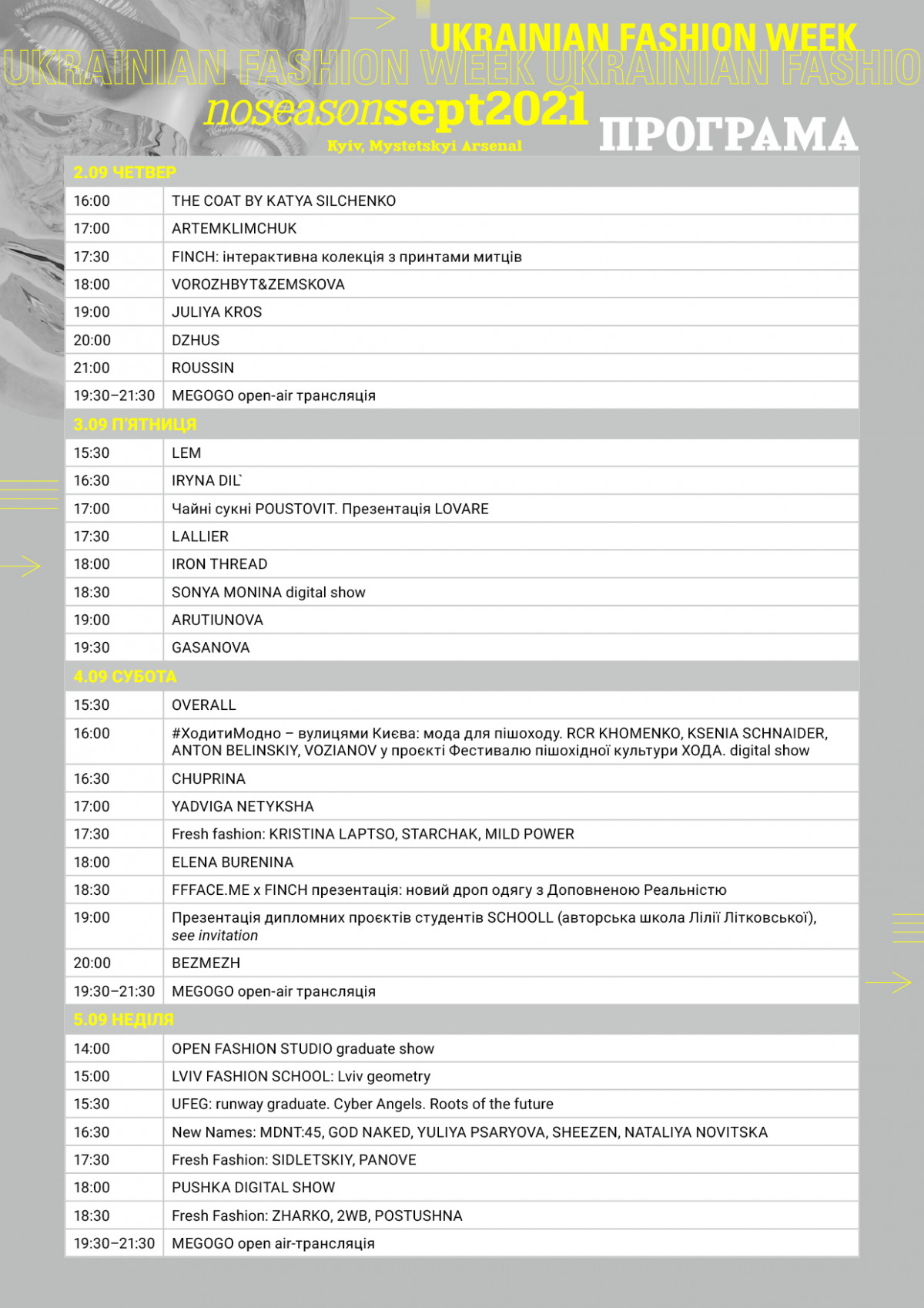 Кілька сезонів тому Ukrainian Fashion Week, усвідомлюючи виклики, що постають перед будь-яким Тижнем моди і демонструючи готовність відповідати на них, на знак підтримки українських дизайнерів, оголосив концепцію позасезонності — NO SEASON Season та започаткував phygital-формат проведення. Гібридний формат UFW передбачає інклюзивність для всіх, хто цікавиться українською модною індустрією, завдяки відкритому online-доступу до показів. Професійна спільнота – представники медіа, баєри, інфлюенсери — запрошені відвідати Тиждень моди та ознайомитись із колекціями дизайнерів offline, дотримуючись карантинних обмежень.