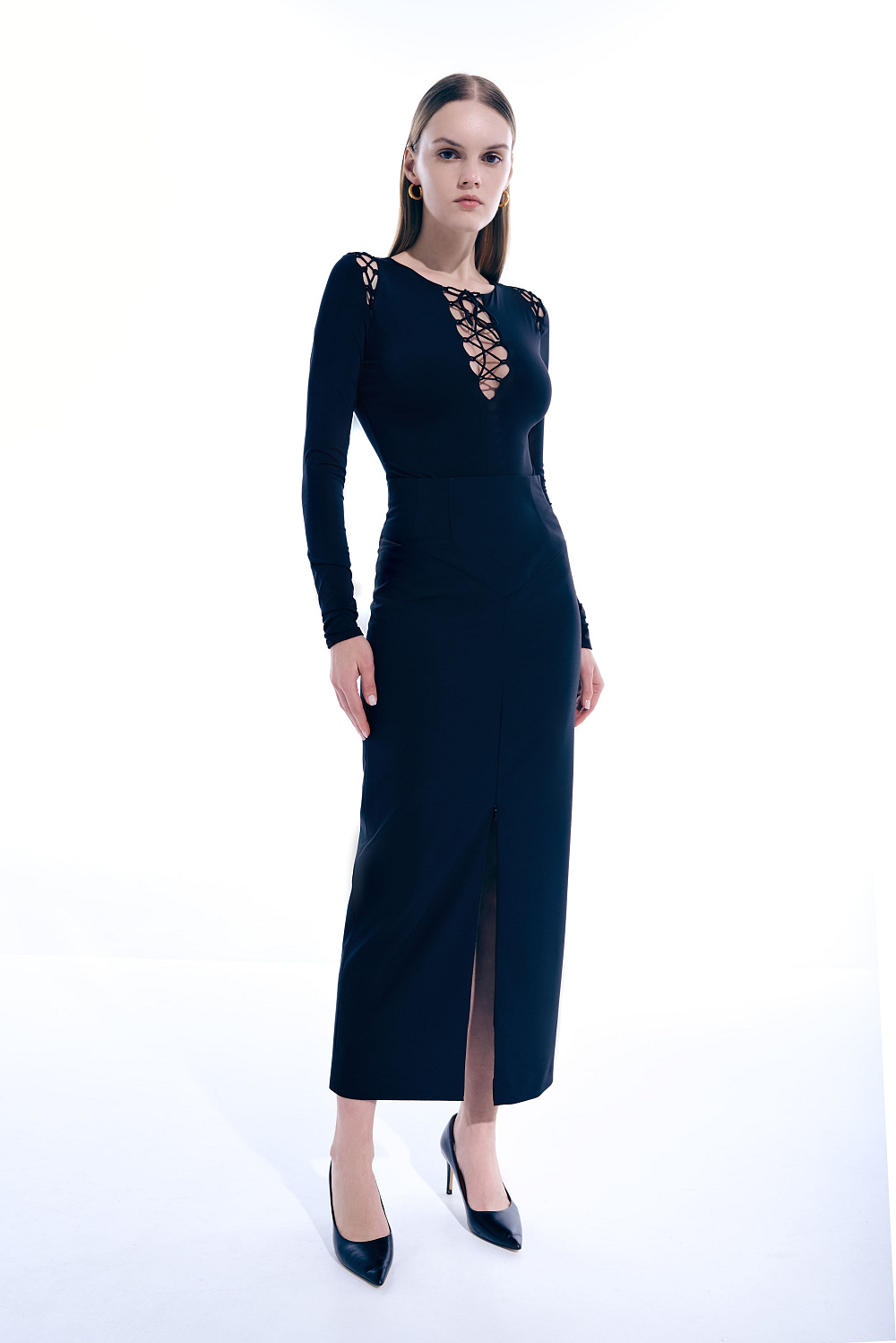 Для особливого випадку дизайнерка пропонує вечірні сукні, максі та міні, блакитного кольору, а також боді та лонгслів, декоровані сіткою зі стразами. Деякі моделі дають змогу експериментувати з образами. Так, завдяки блискавкам у брюках і спідницях можна самостійно обирати ступінь сміливості розрізу, сорочки мають застібки не лише спереду, а й на рукавах, а спідниця міні має знімну, прикрашену стразами спідницю, що дає можливість робити цю річ як повсякденною, так і вечірньою.