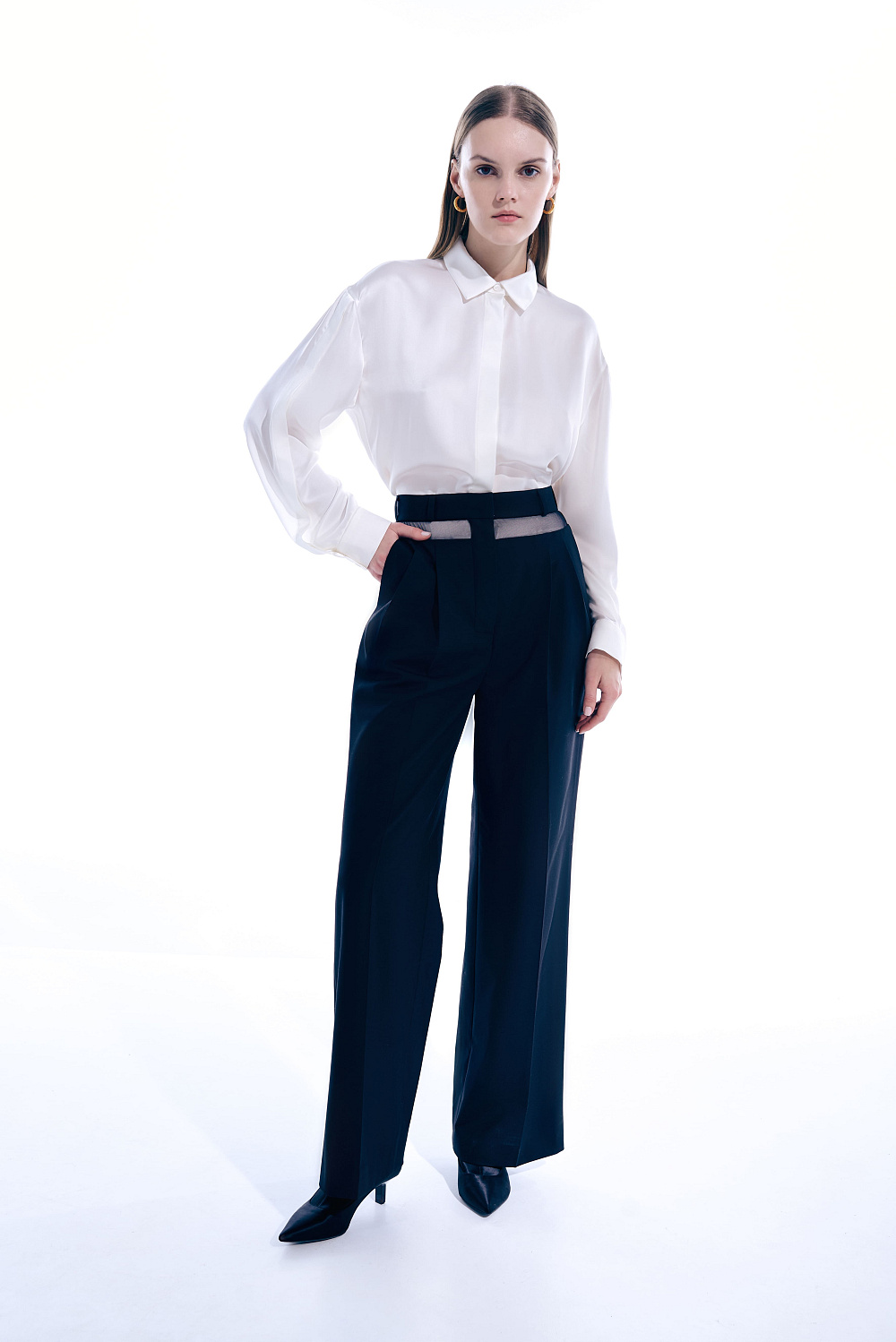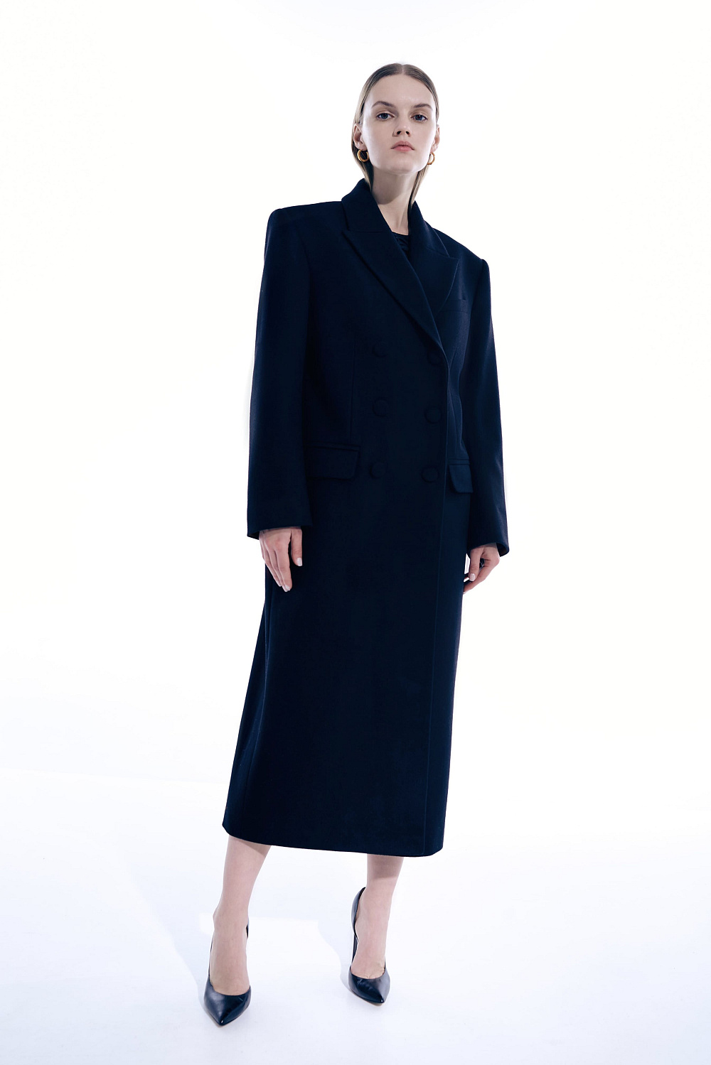 Головні кольори колекції — мокко, чорний, беж, синій і блакитний, а тканини — вовна, шовк, поліестер і віскоза.