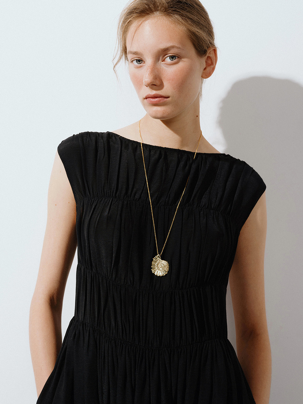 До колекції входить не лише одяг, а й ексклюзивні прикраси, які підкреслюють її унікальність. Сережки з ювелірної латуні доповнюють жіночі образи, надаючи їм витонченості та особливого шарму. Кулон і брошка у формі амоніту стануть головними акцентами стилю влітку і символом природної краси та глибини.