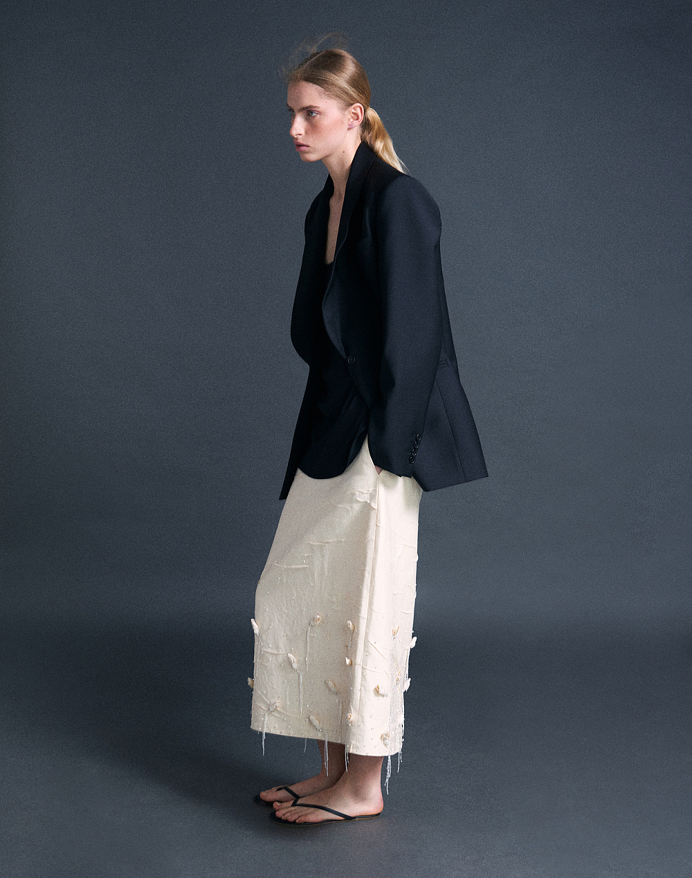 Бутони троянди стали окрасою ще однієї важливої речі в колекції — спідниці А-силуету довжини міді. Крім троянд її також оздобили торочками ручної роботи та кришталевими намистинами. На створення спідниці майстрам INLYLAND потрібно 45 годин ручної роботи.