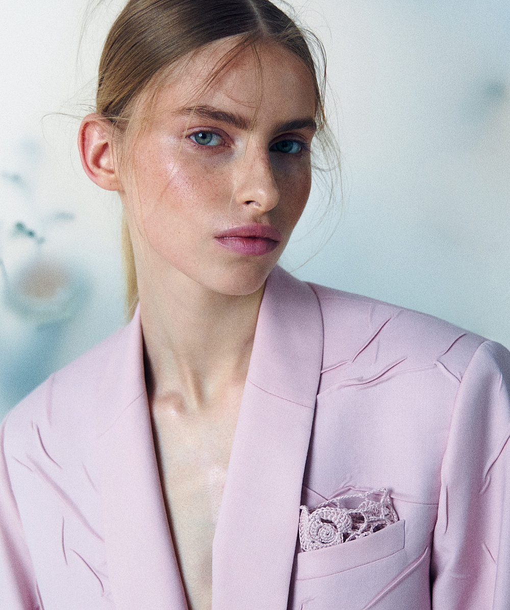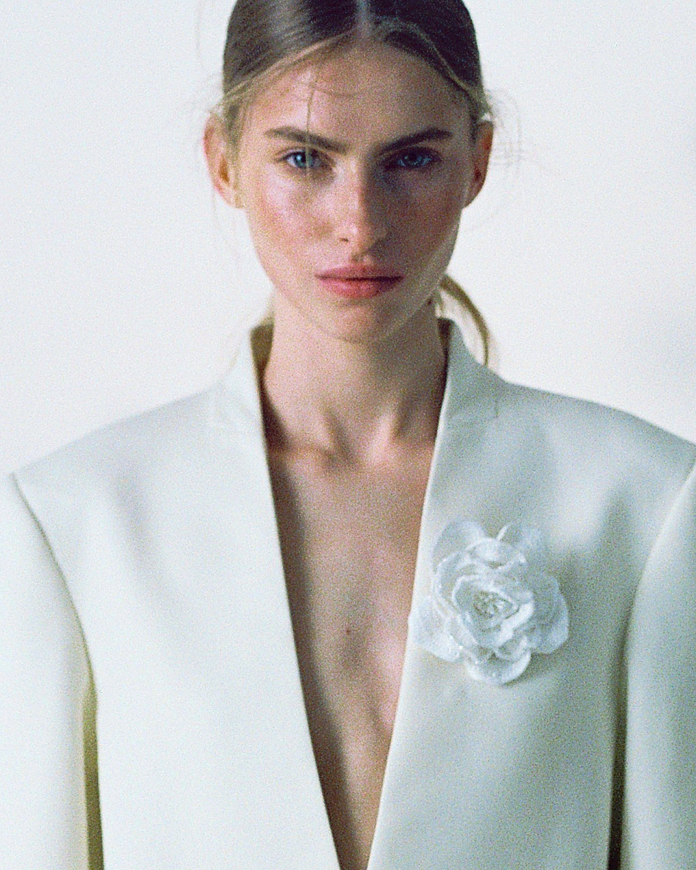Біла троянда, головний декоративний елемент колекції, подарувала фірмовій лаконічності INLYLAND небачену раніше романтичність, проте в делікатному й вишуканому виконанні. Відправною точкою в роботі Інна Грицик називає в’язану гачком кишенькову хустку з квітчастим візерунком.