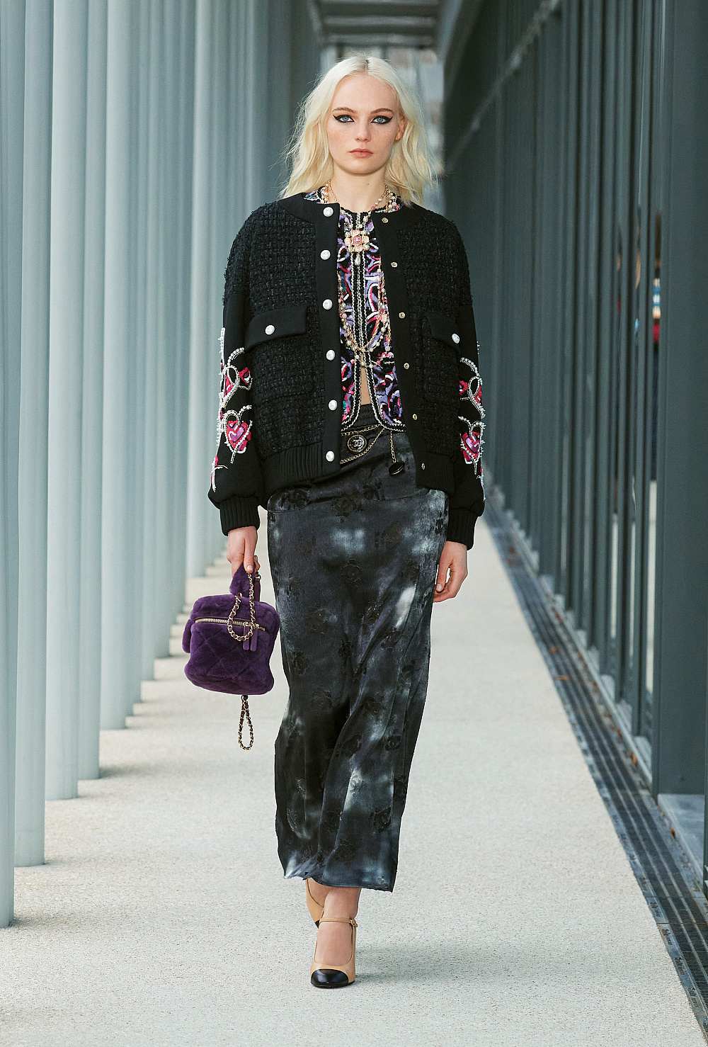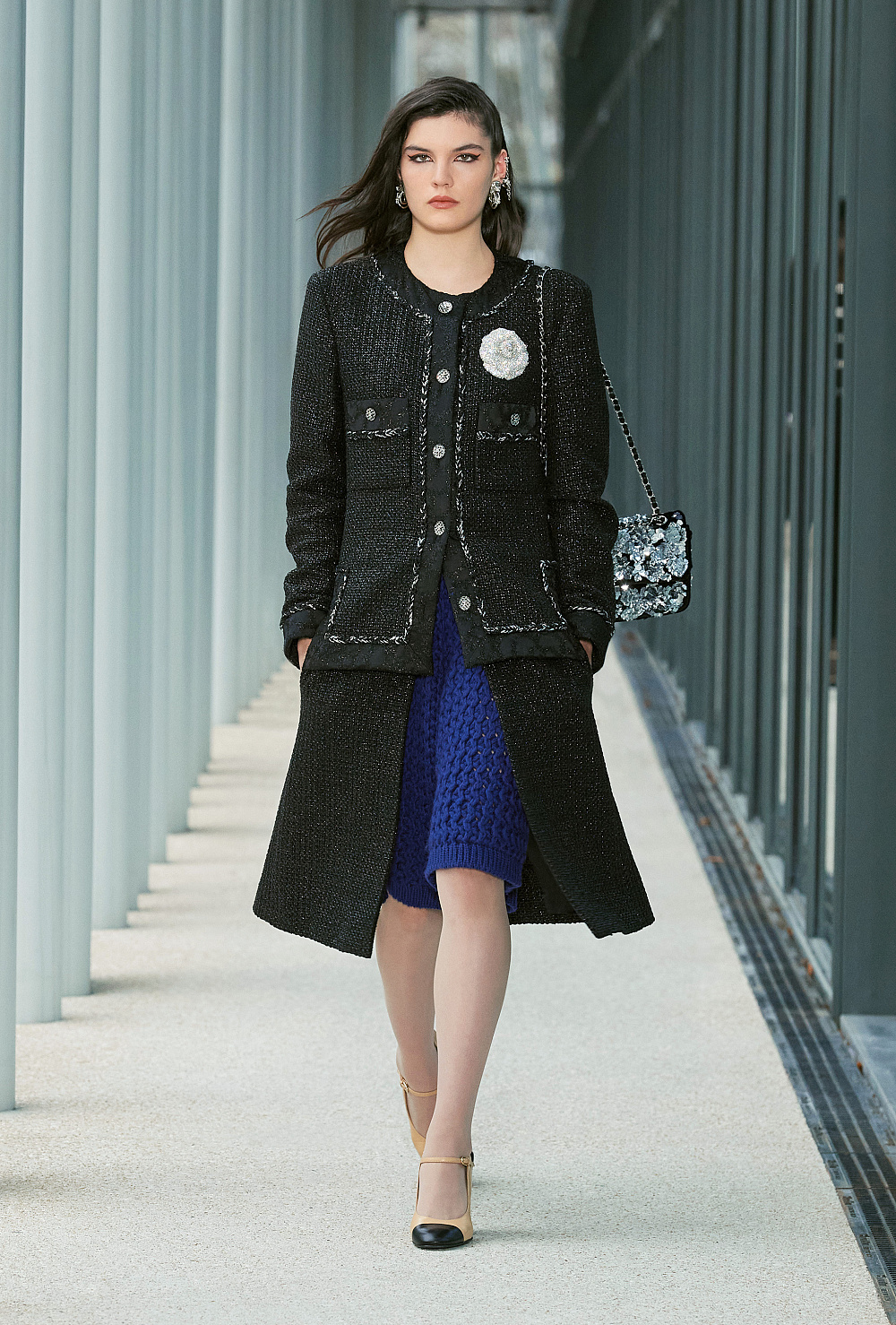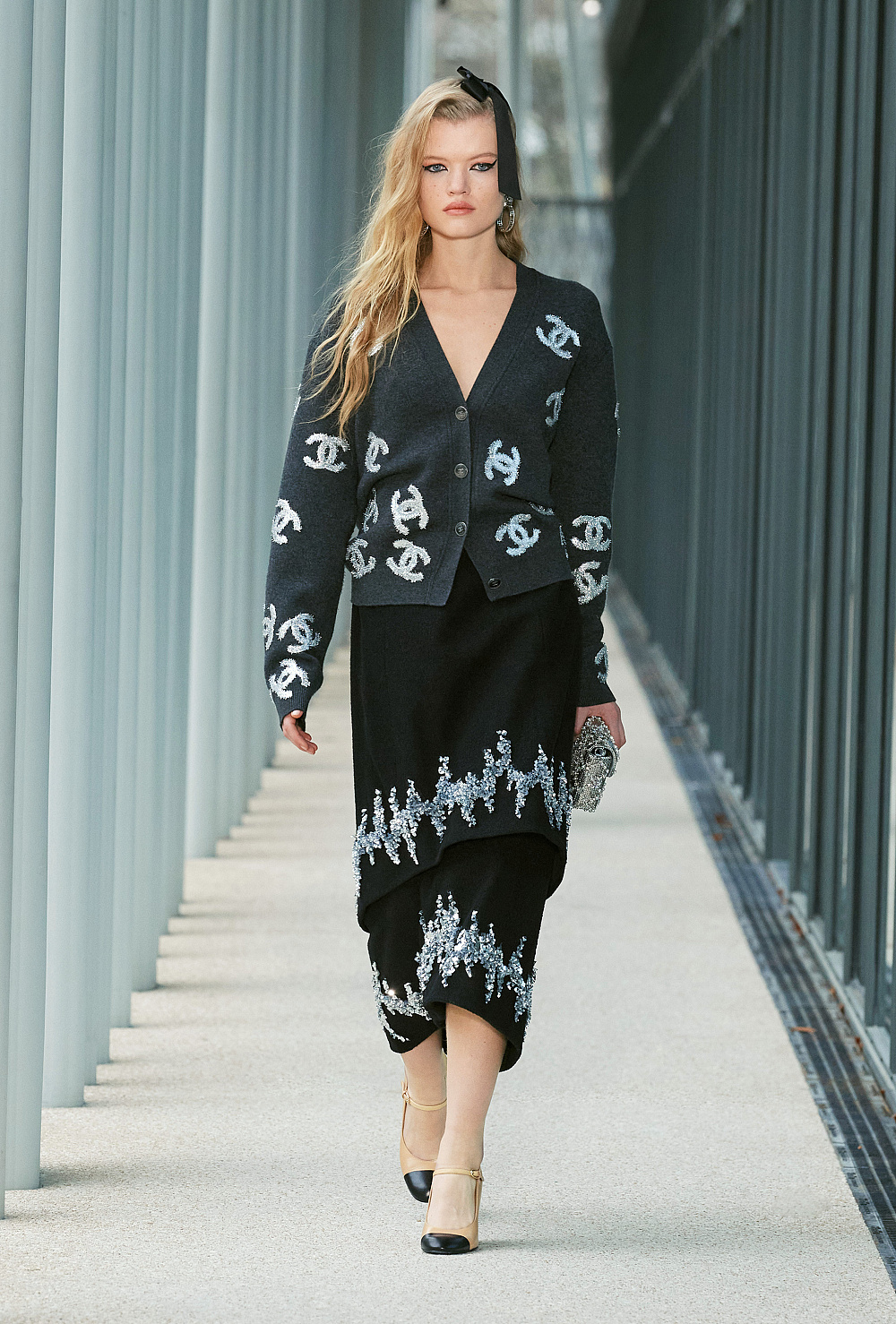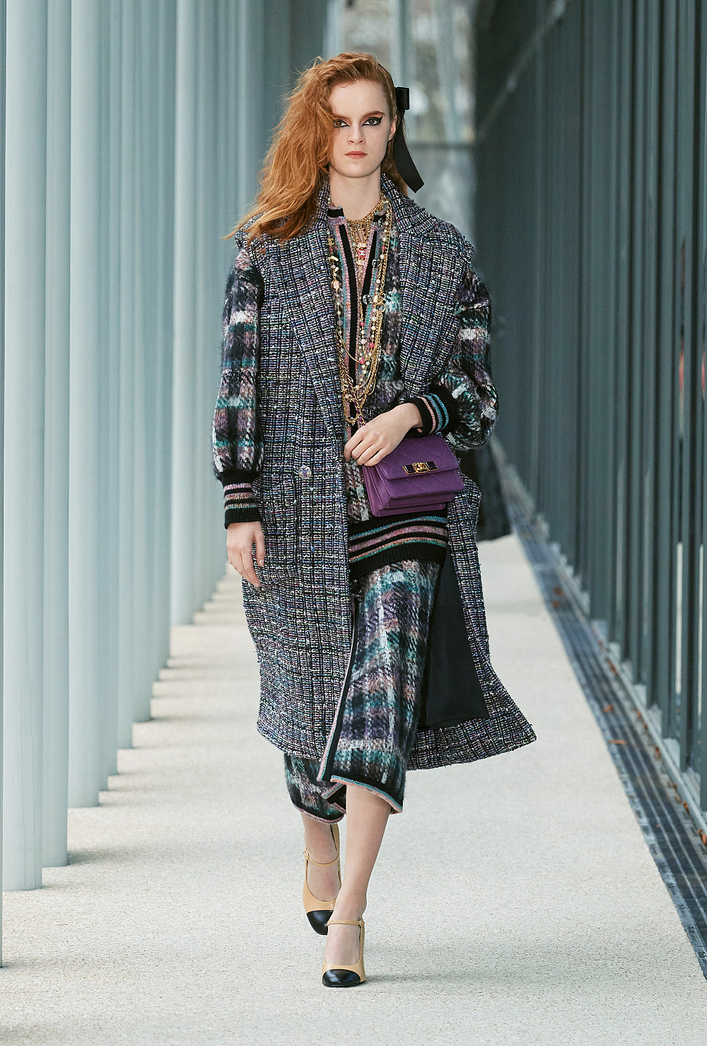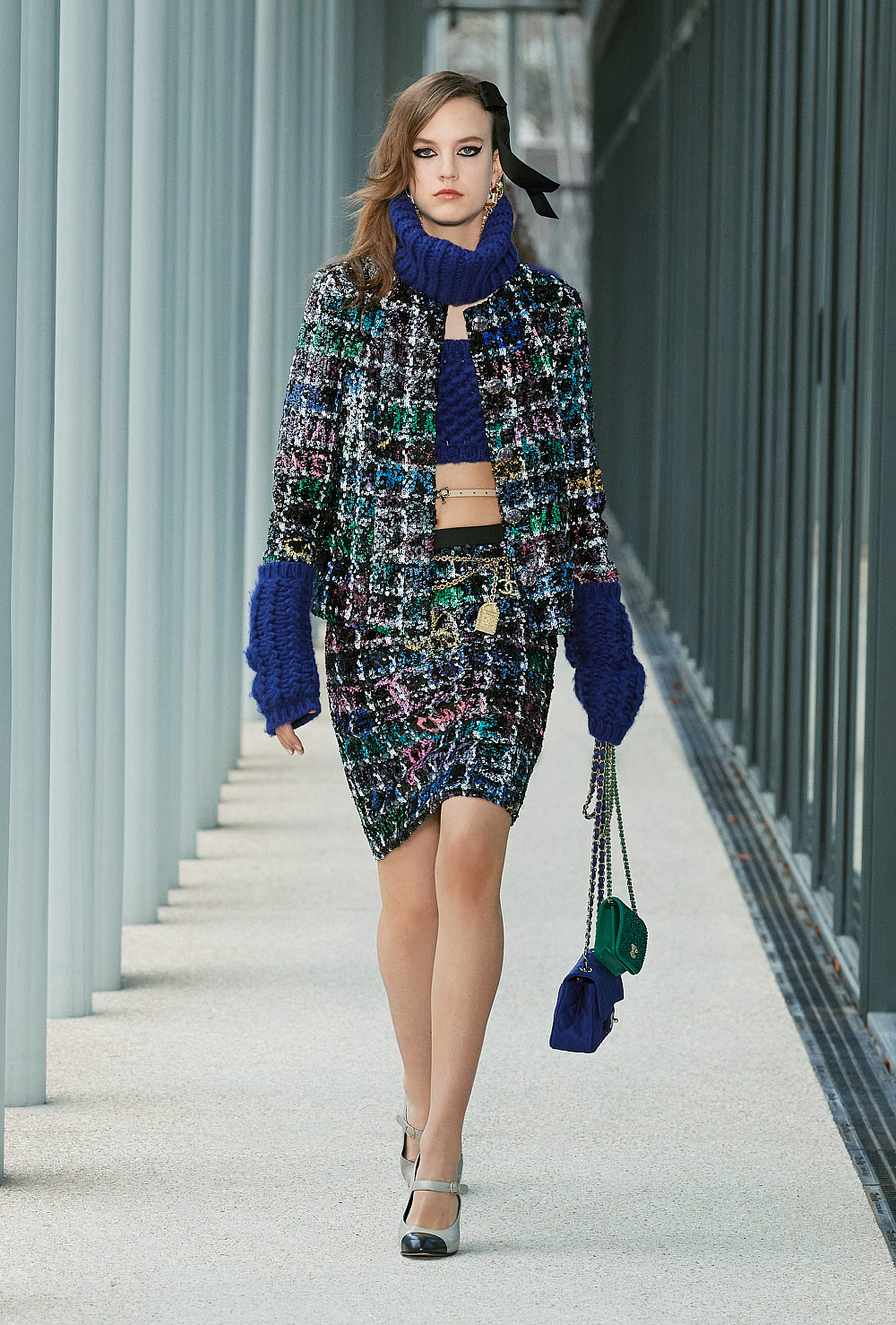 Сама коллекция наполнена знаковыми кодами стиля французского бренда. Образы урбанистичные, но без элегантности Chanel не обошлось. На моделях можно увидеть твидовые куртки с рукавами-свитшотами, вышивкой в стиле граффити, цветные бусы от Lesage, объемные фиолетовые или синие вязаные костюмы и casual пальто, а также платья c перьями марабу. Многие из вышивок вдохновлены структурой самого здания, например, графичные вышивки Montex украшены серебряными блестками. Что касается аксессуаров, то в коллекции можно увидеть культовые черно-бежевые туфли из мастерской Massaro, жемчужные нити и цепи с логотипом бренда от Goossens, серьги-кольца, пояса-цепочки и многое другое.
