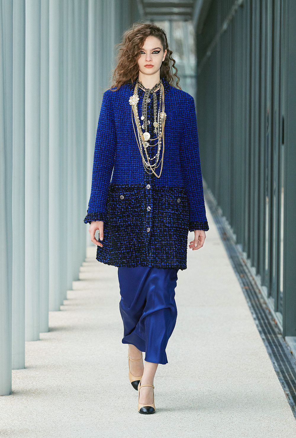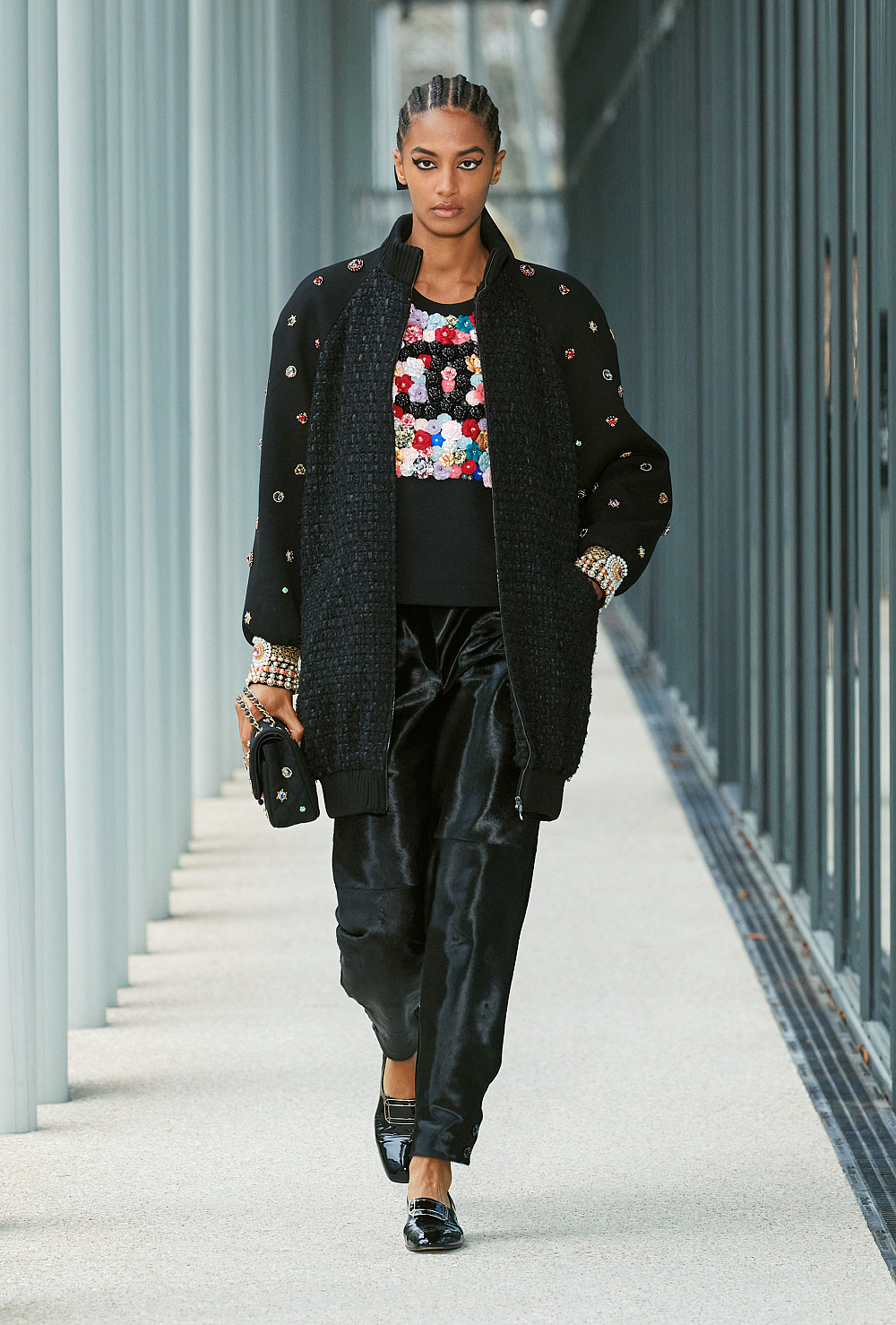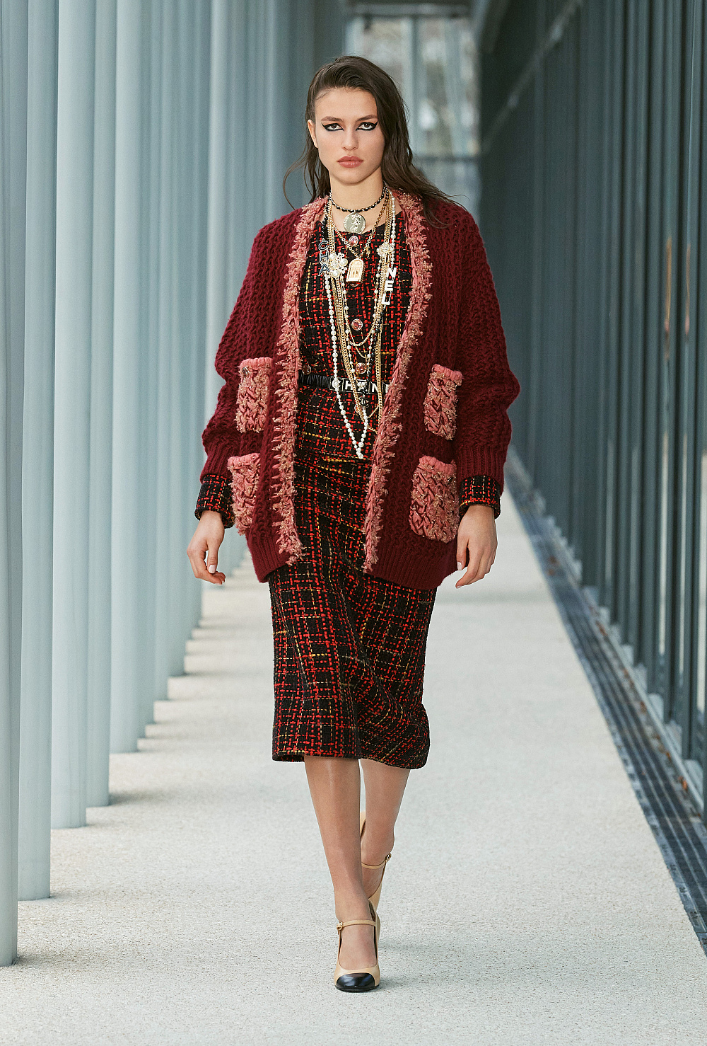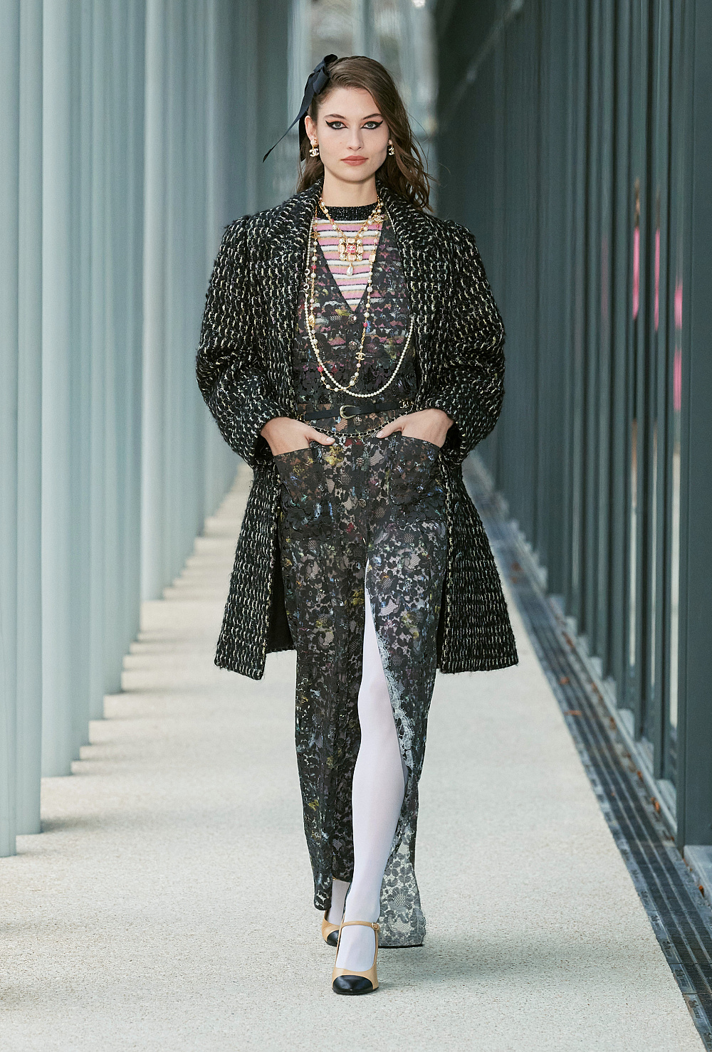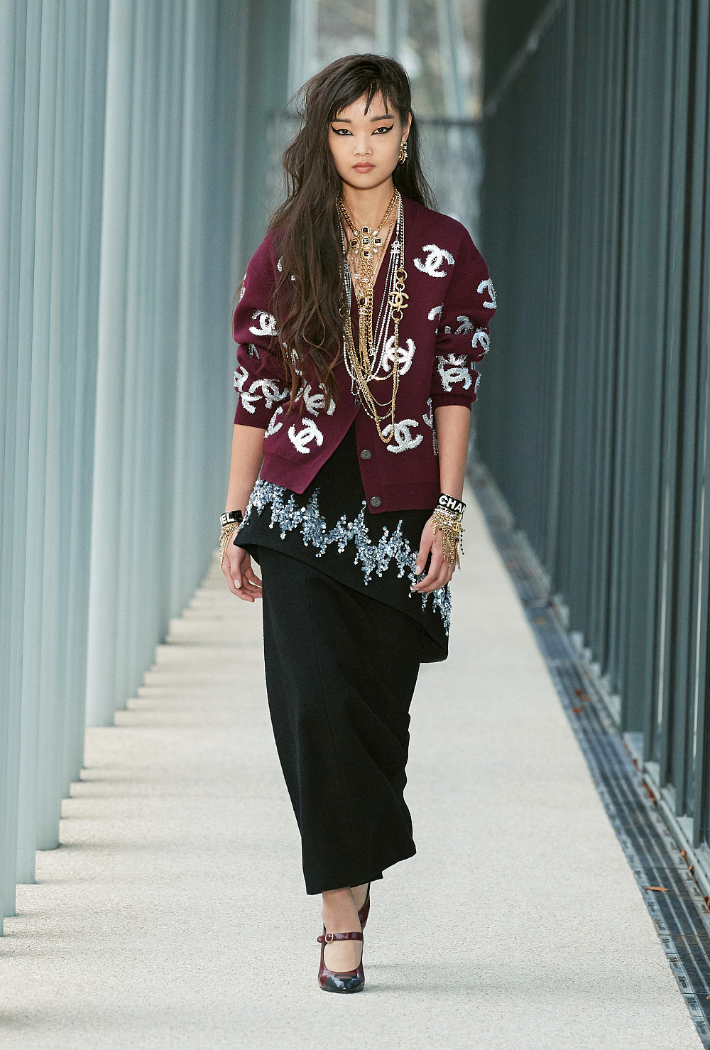 Сама коллекция наполнена знаковыми кодами стиля французского бренда. Образы урбанистичные, но без элегантности Chanel не обошлось. На моделях можно увидеть твидовые куртки с рукавами-свитшотами, вышивкой в стиле граффити, цветные бусы от Lesage, объемные фиолетовые или синие вязаные костюмы и casual пальто, а также платья c перьями марабу. Многие из вышивок вдохновлены структурой самого здания, например, графичные вышивки Montex украшены серебряными блестками. Что касается аксессуаров, то в коллекции можно увидеть культовые черно-бежевые туфли из мастерской Massaro, жемчужные нити и цепи с логотипом бренда от Goossens, серьги-кольца, пояса-цепочки и многое другое.