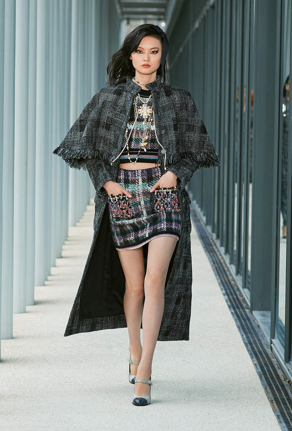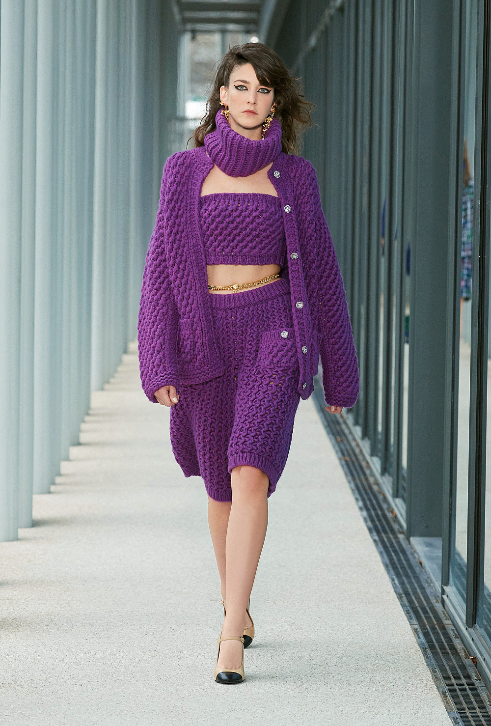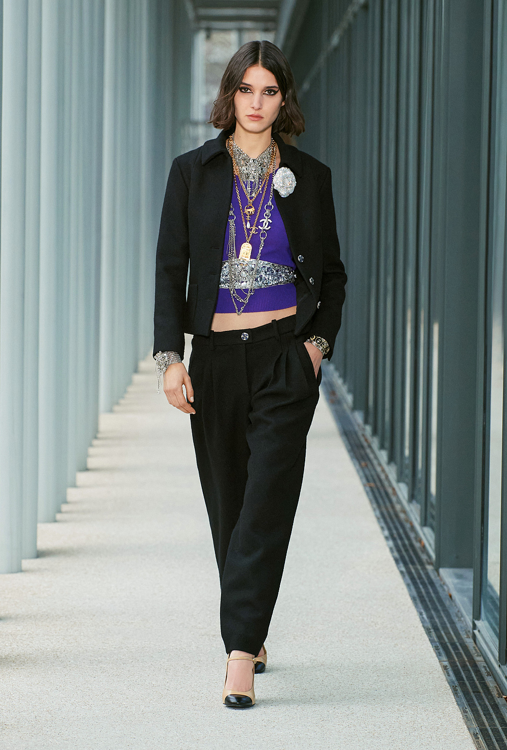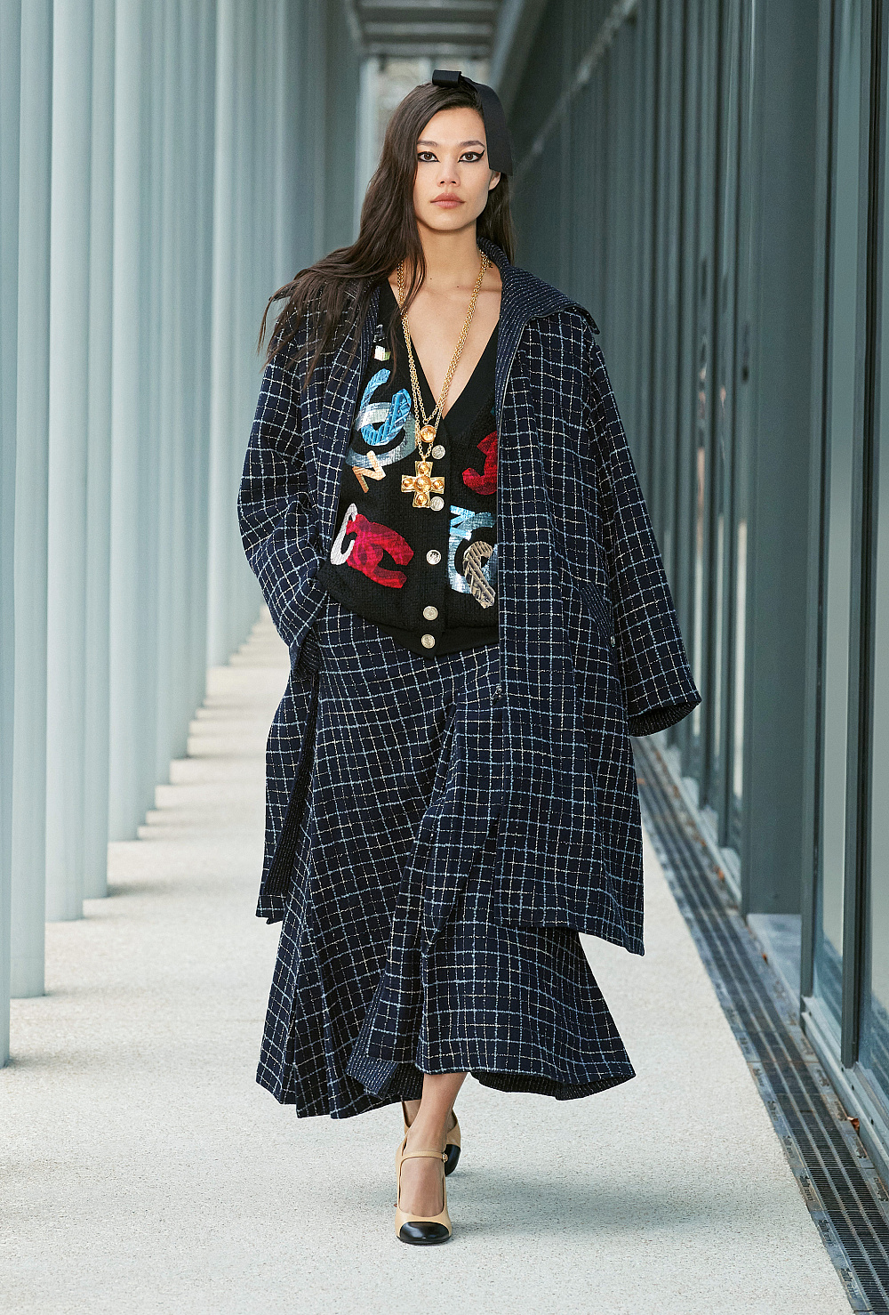 Сама коллекция наполнена знаковыми кодами стиля французского бренда. Образы урбанистичные, но без элегантности Chanel не обошлось. На моделях можно увидеть твидовые куртки с рукавами-свитшотами, вышивкой в стиле граффити, цветные бусы от Lesage, объемные фиолетовые или синие вязаные костюмы и casual пальто, а также платья c перьями марабу. Многие из вышивок вдохновлены структурой самого здания, например, графичные вышивки Montex украшены серебряными блестками. Что касается аксессуаров, то в коллекции можно увидеть культовые черно-бежевые туфли из мастерской Massaro, жемчужные нити и цепи с логотипом бренда от Goossens, серьги-кольца, пояса-цепочки и многое другое.