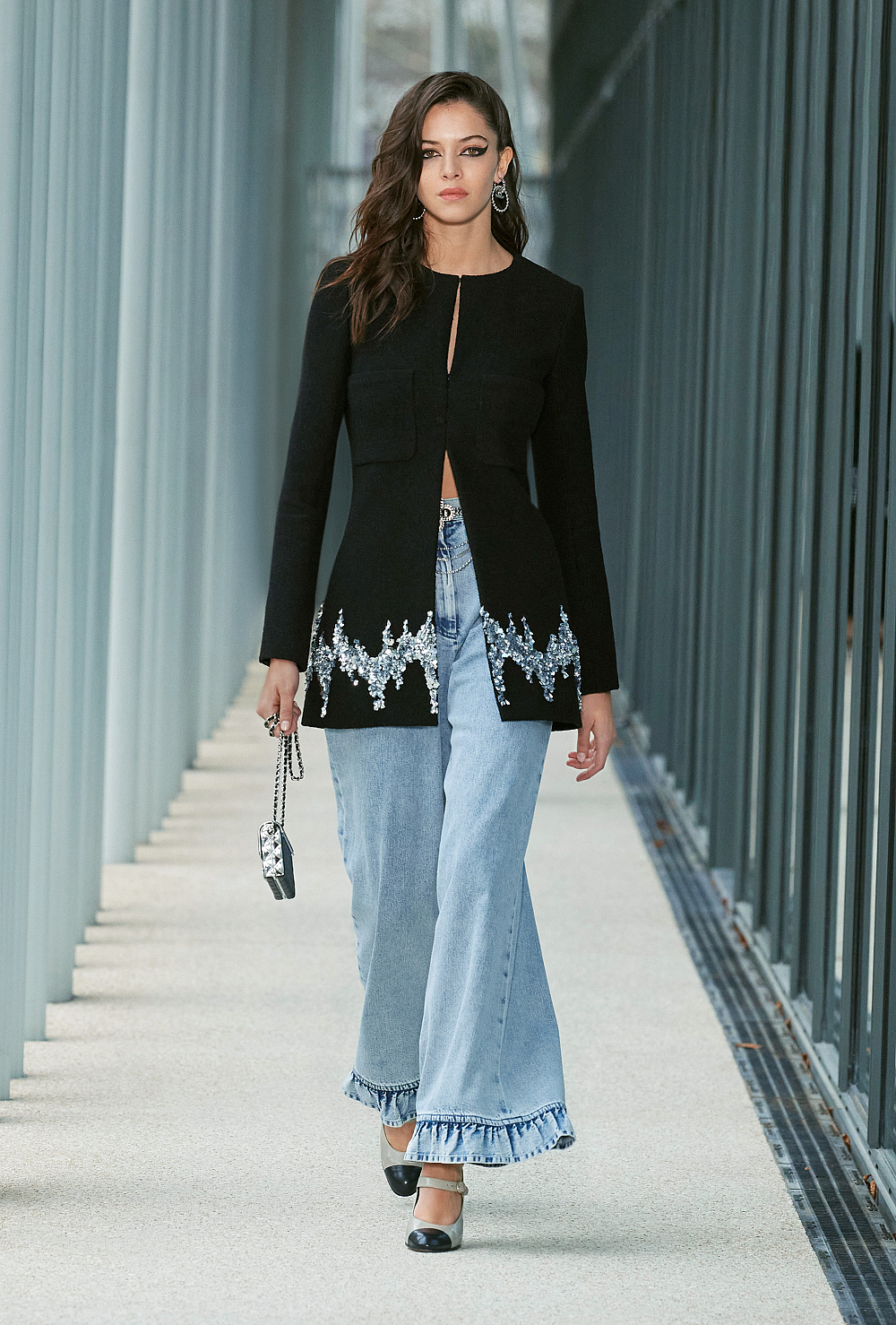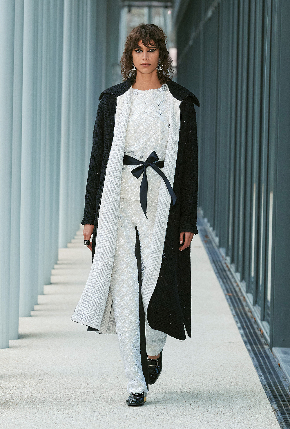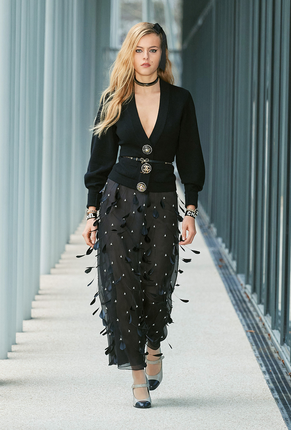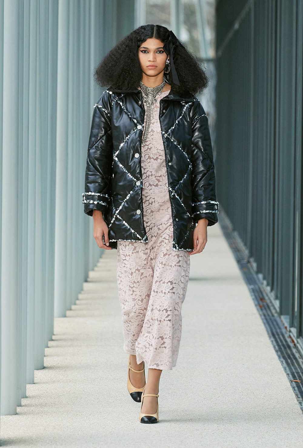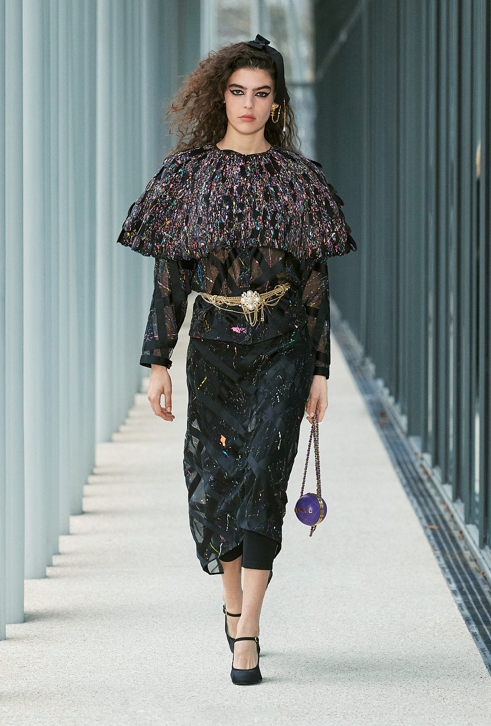 Сама коллекция наполнена знаковыми кодами стиля французского бренда. Образы урбанистичные, но без элегантности Chanel не обошлось. На моделях можно увидеть твидовые куртки с рукавами-свитшотами, вышивкой в стиле граффити, цветные бусы от Lesage, объемные фиолетовые или синие вязаные костюмы и casual пальто, а также платья c перьями марабу. Многие из вышивок вдохновлены структурой самого здания, например, графичные вышивки Montex украшены серебряными блестками. Что касается аксессуаров, то в коллекции можно увидеть культовые черно-бежевые туфли из мастерской Massaro, жемчужные нити и цепи с логотипом бренда от Goossens, серьги-кольца, пояса-цепочки и многое другое.