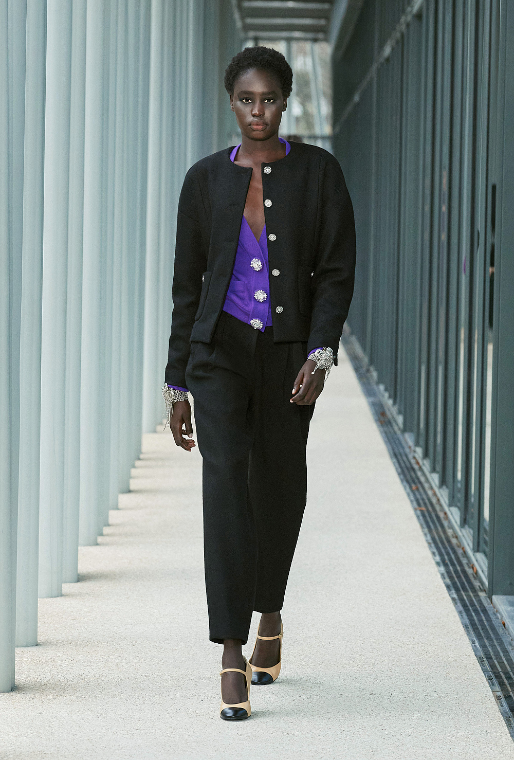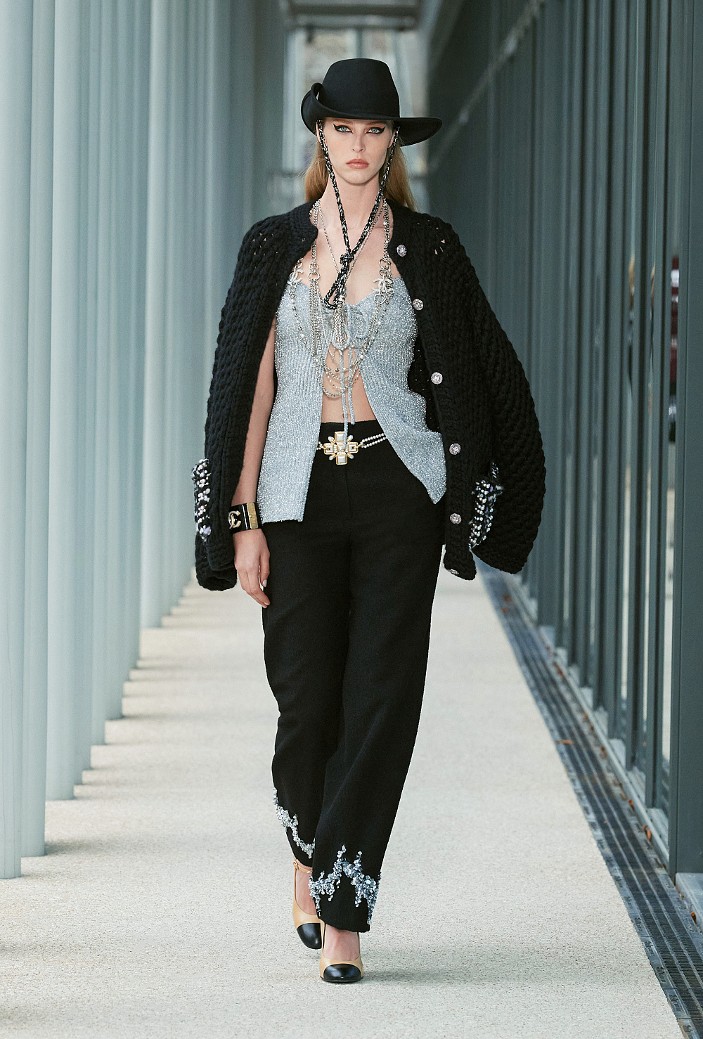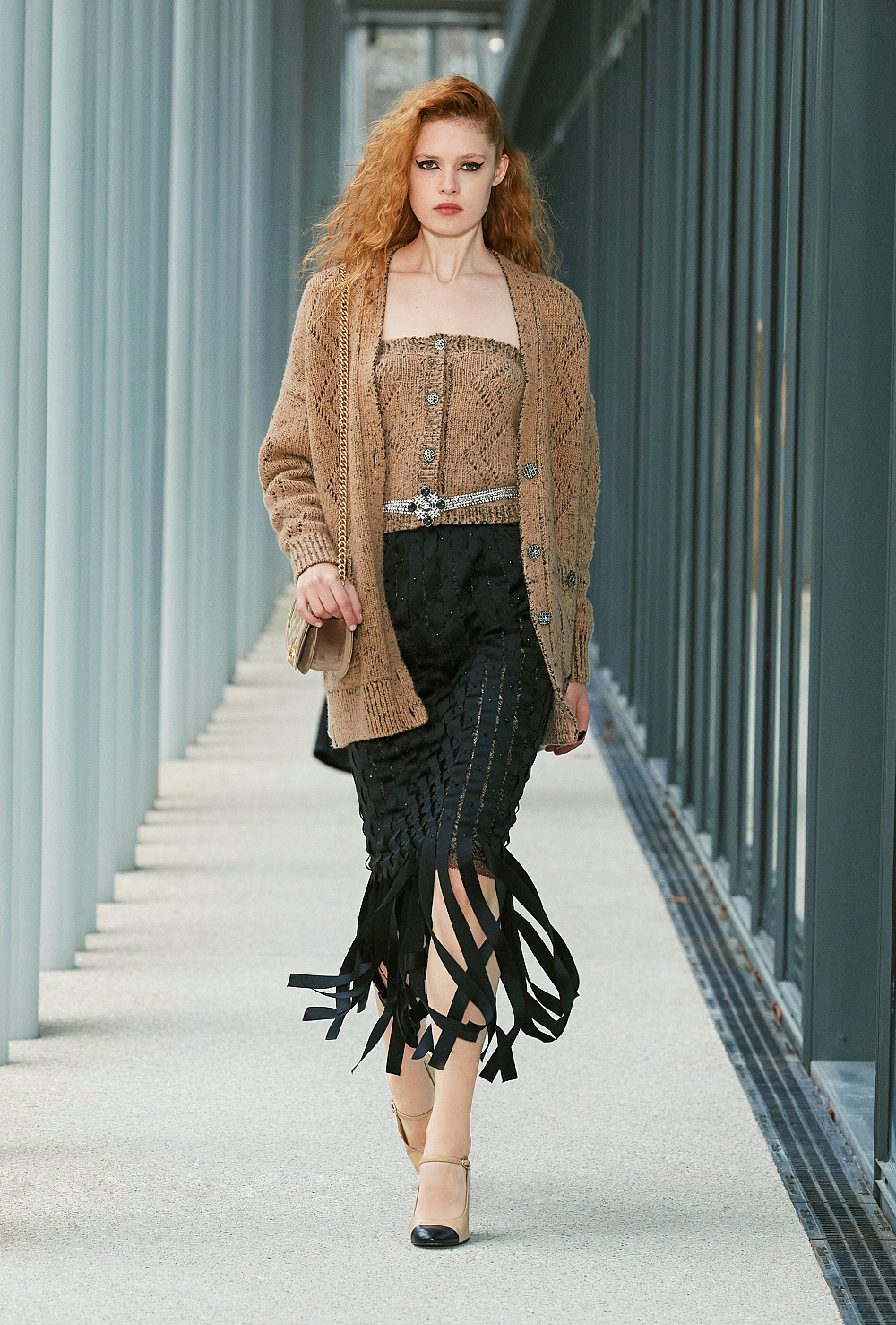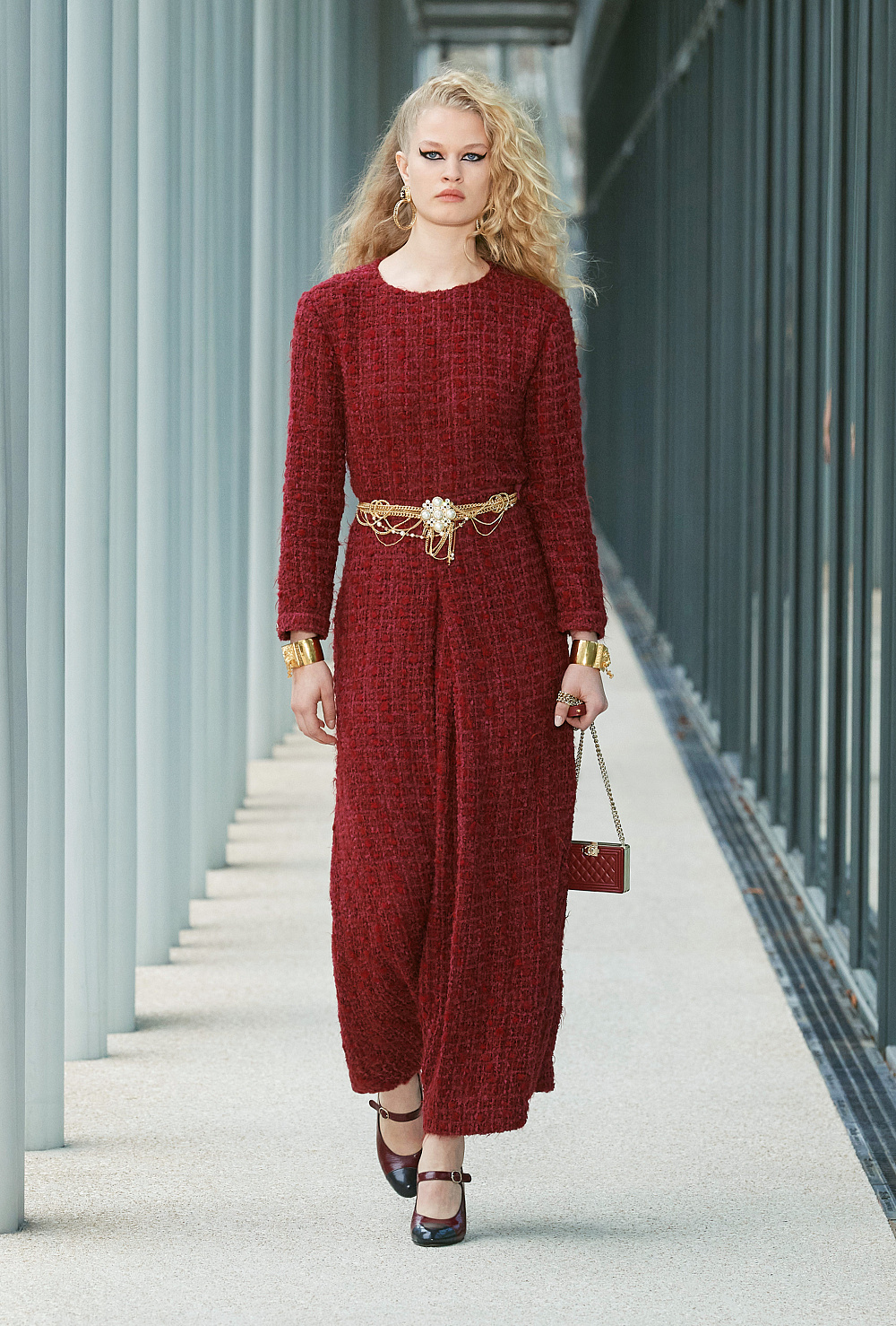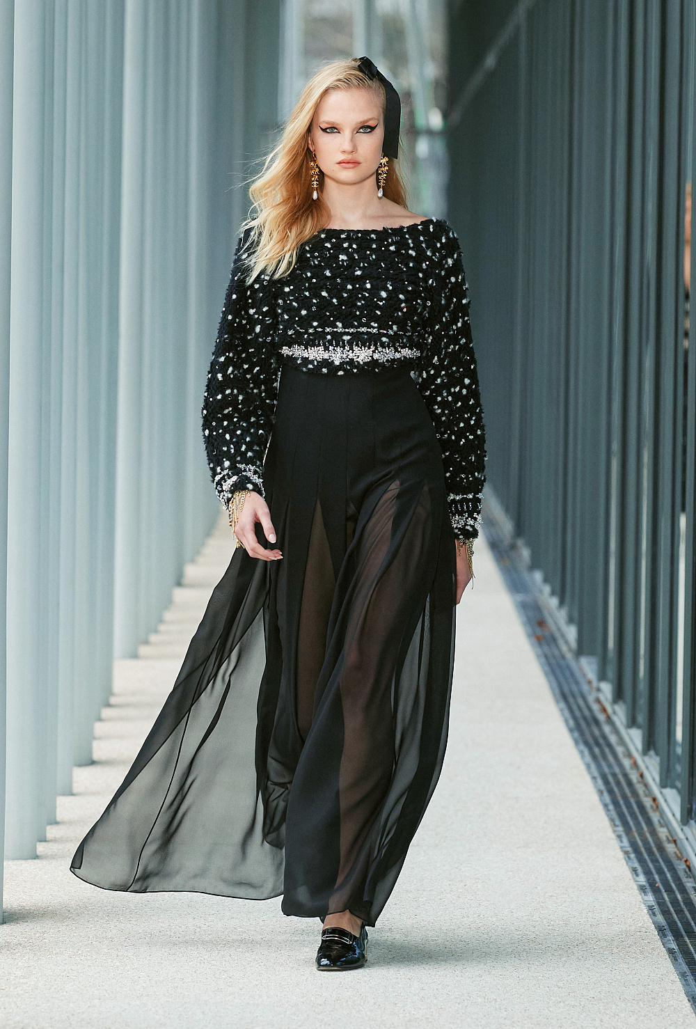Сама коллекция наполнена знаковыми кодами стиля французского бренда. Образы урбанистичные, но без элегантности Chanel не обошлось. На моделях можно увидеть твидовые куртки с рукавами-свитшотами, вышивкой в стиле граффити, цветные бусы от Lesage, объемные фиолетовые или синие вязаные костюмы и casual пальто, а также платья c перьями марабу. Многие из вышивок вдохновлены структурой самого здания, например, графичные вышивки Montex украшены серебряными блестками. Что касается аксессуаров, то в коллекции можно увидеть культовые черно-бежевые туфли из мастерской Massaro, жемчужные нити и цепи с логотипом бренда от Goossens, серьги-кольца, пояса-цепочки и многое другое.