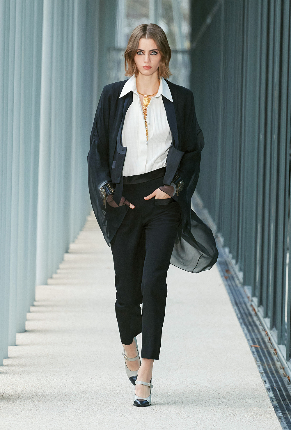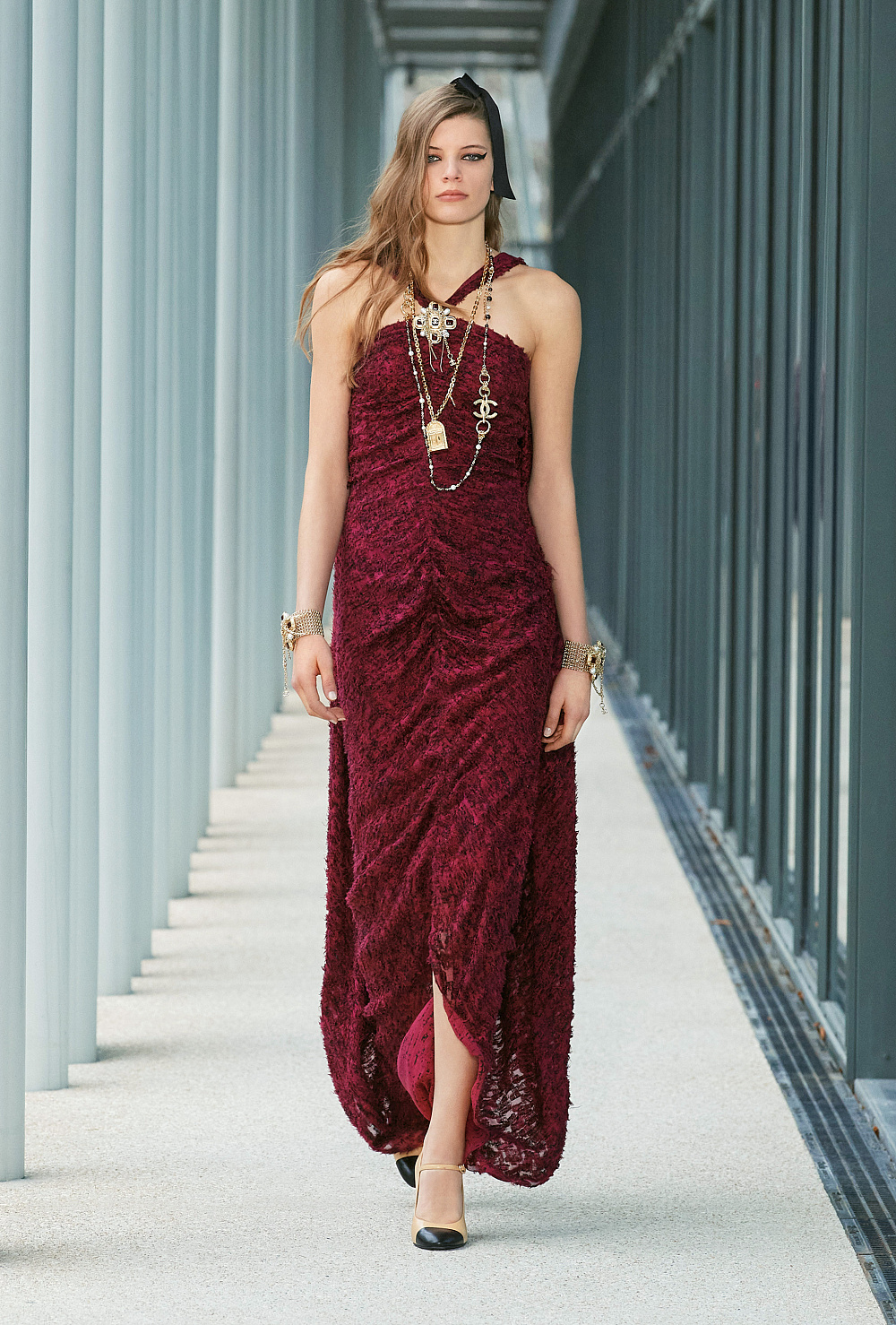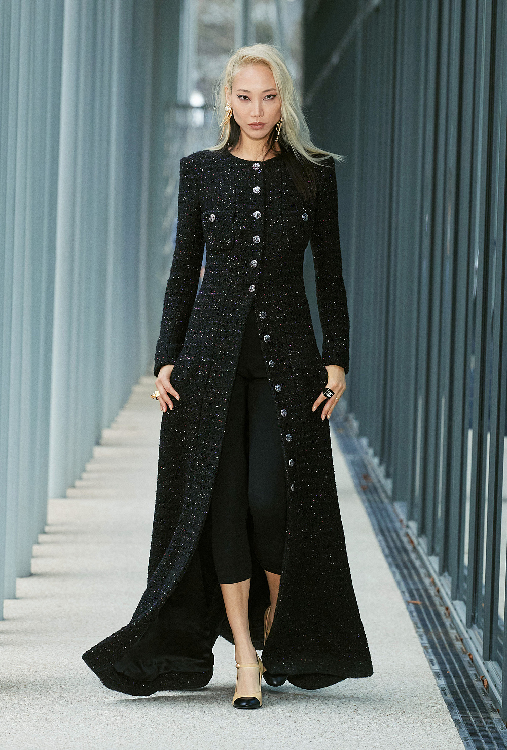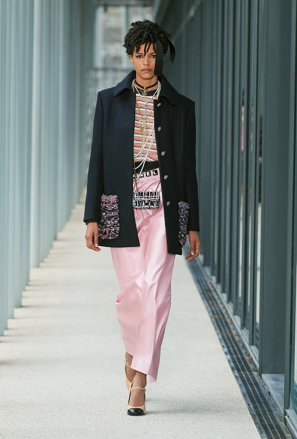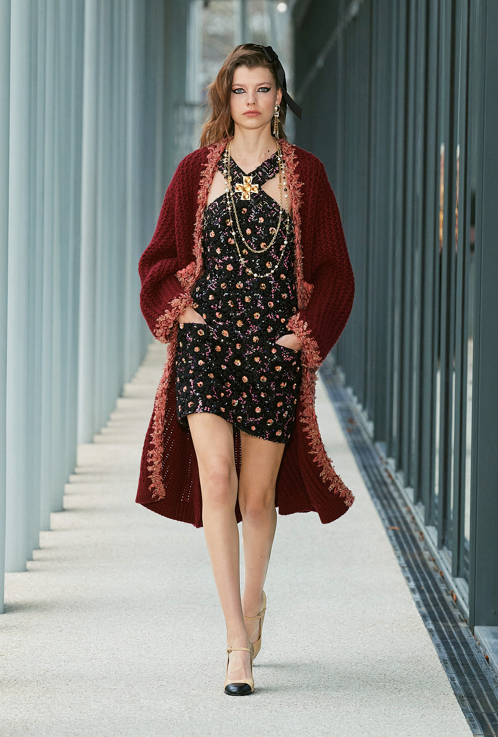 Сама коллекция наполнена знаковыми кодами стиля французского бренда. Образы урбанистичные, но без элегантности Chanel не обошлось. На моделях можно увидеть твидовые куртки с рукавами-свитшотами, вышивкой в стиле граффити, цветные бусы от Lesage, объемные фиолетовые или синие вязаные костюмы и casual пальто, а также платья c перьями марабу. Многие из вышивок вдохновлены структурой самого здания, например, графичные вышивки Montex украшены серебряными блестками. Что касается аксессуаров, то в коллекции можно увидеть культовые черно-бежевые туфли из мастерской Massaro, жемчужные нити и цепи с логотипом бренда от Goossens, серьги-кольца, пояса-цепочки и многое другое.