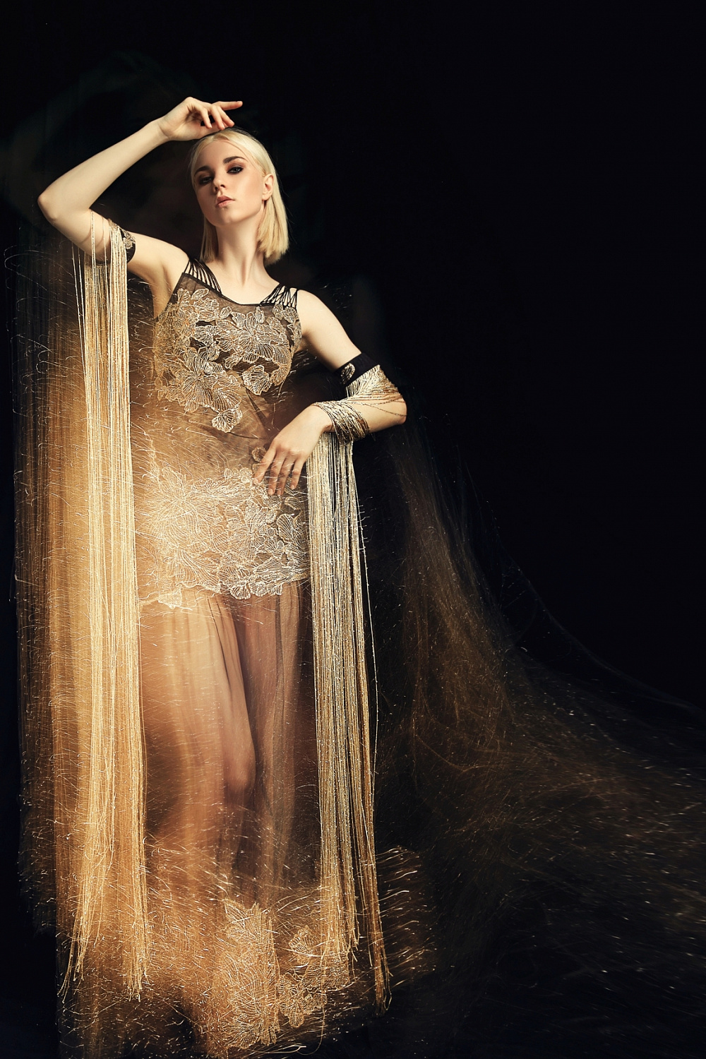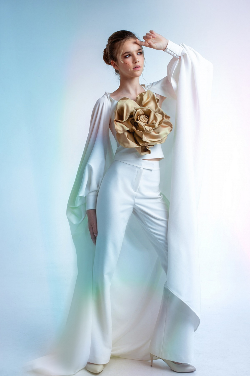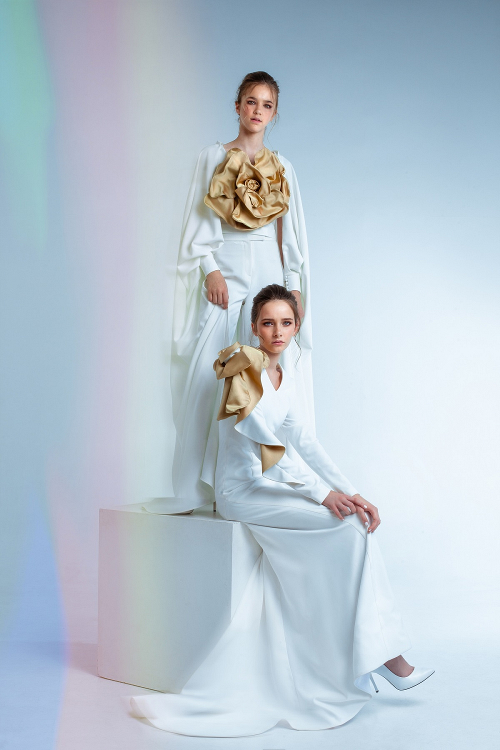 Колекція The Triumph представлена елегантною лінійкою білих образів із золотими акцентними воланами, які додають об`єму, надаючи образам вишуканості та жіночності. Прості, але ефектні силуети створюють легкий та витончений образ, а якісні матеріали з ніжним мереживом і золотою тафтою надають їм особливої привабливості та підкреслюють елегантність образів.