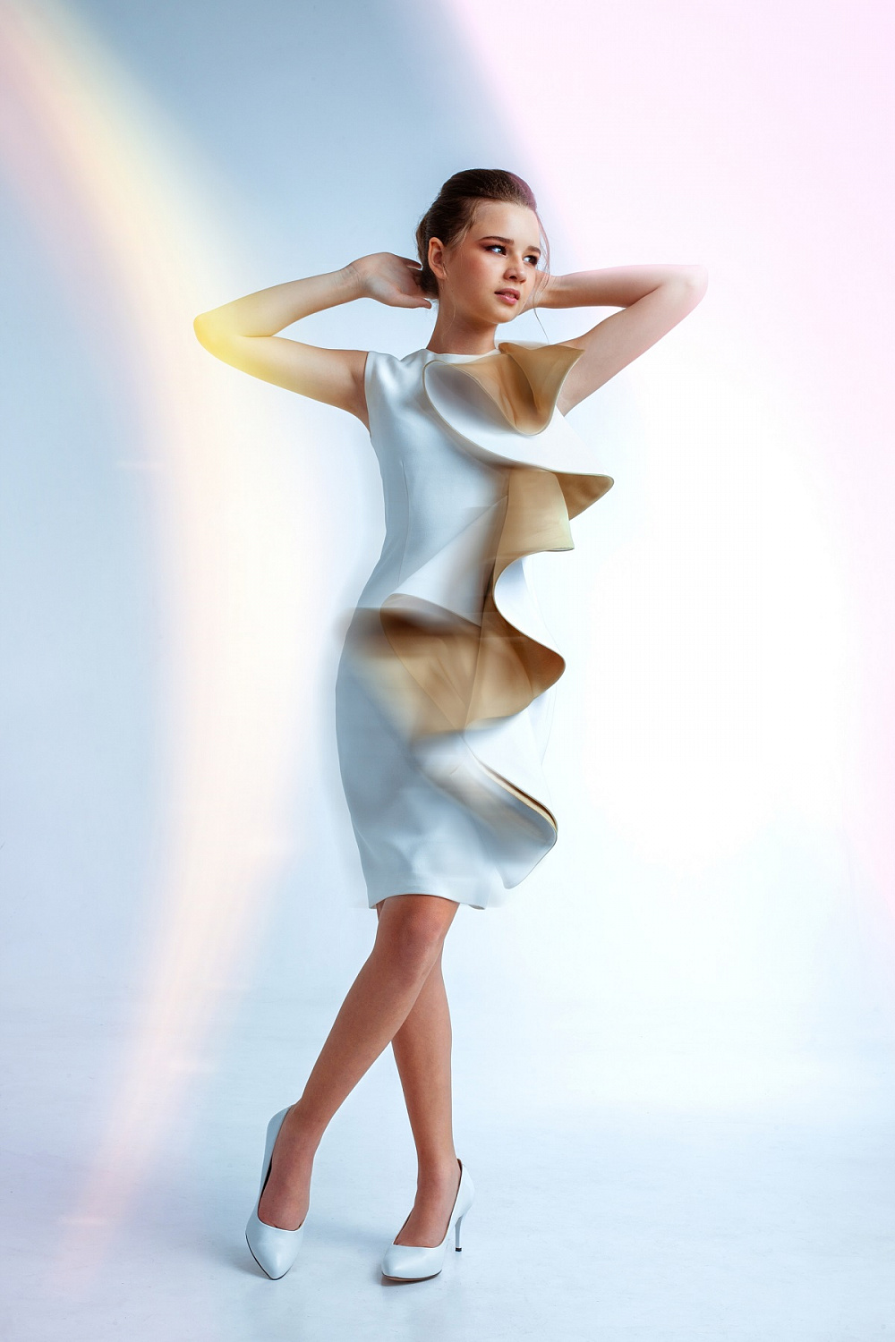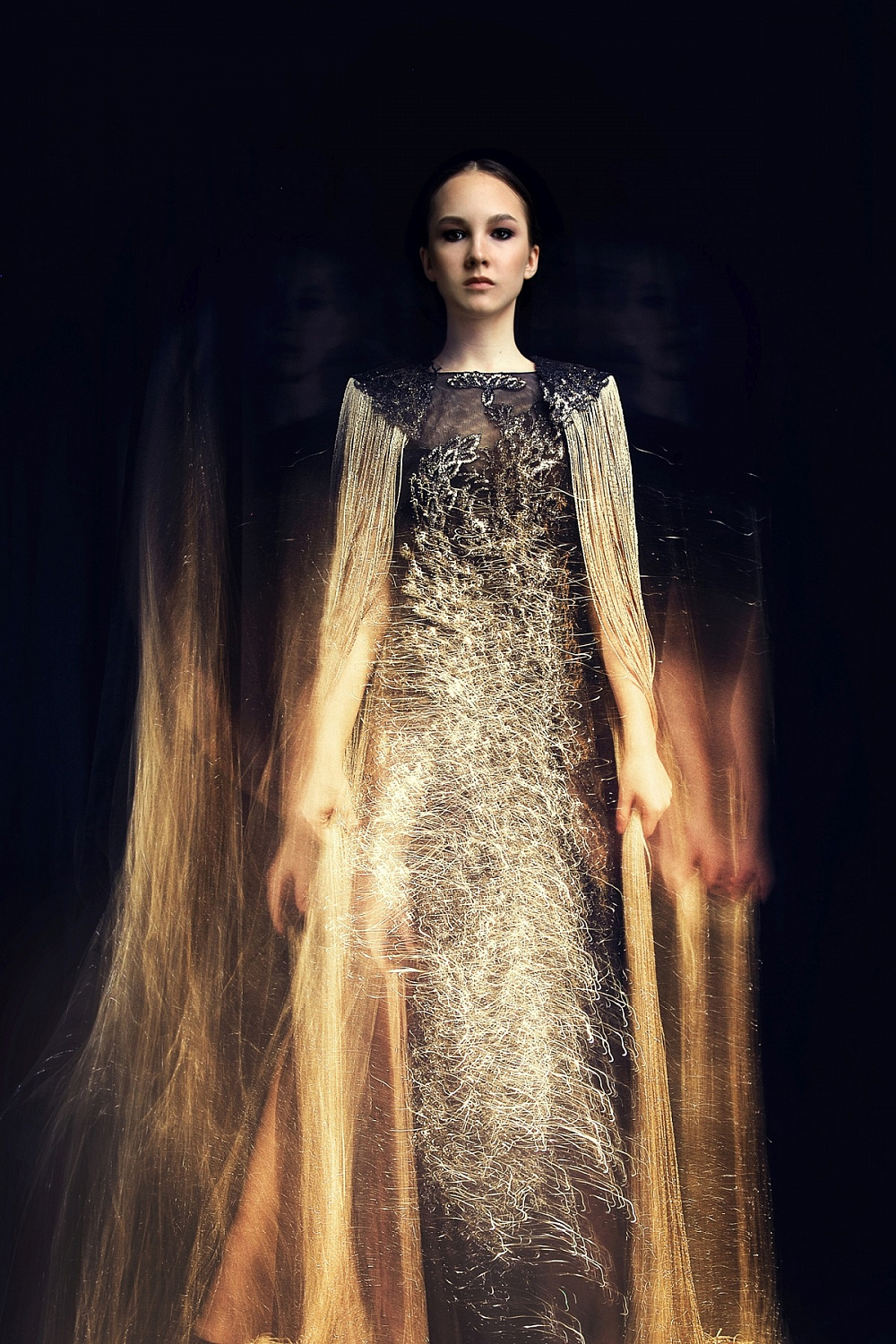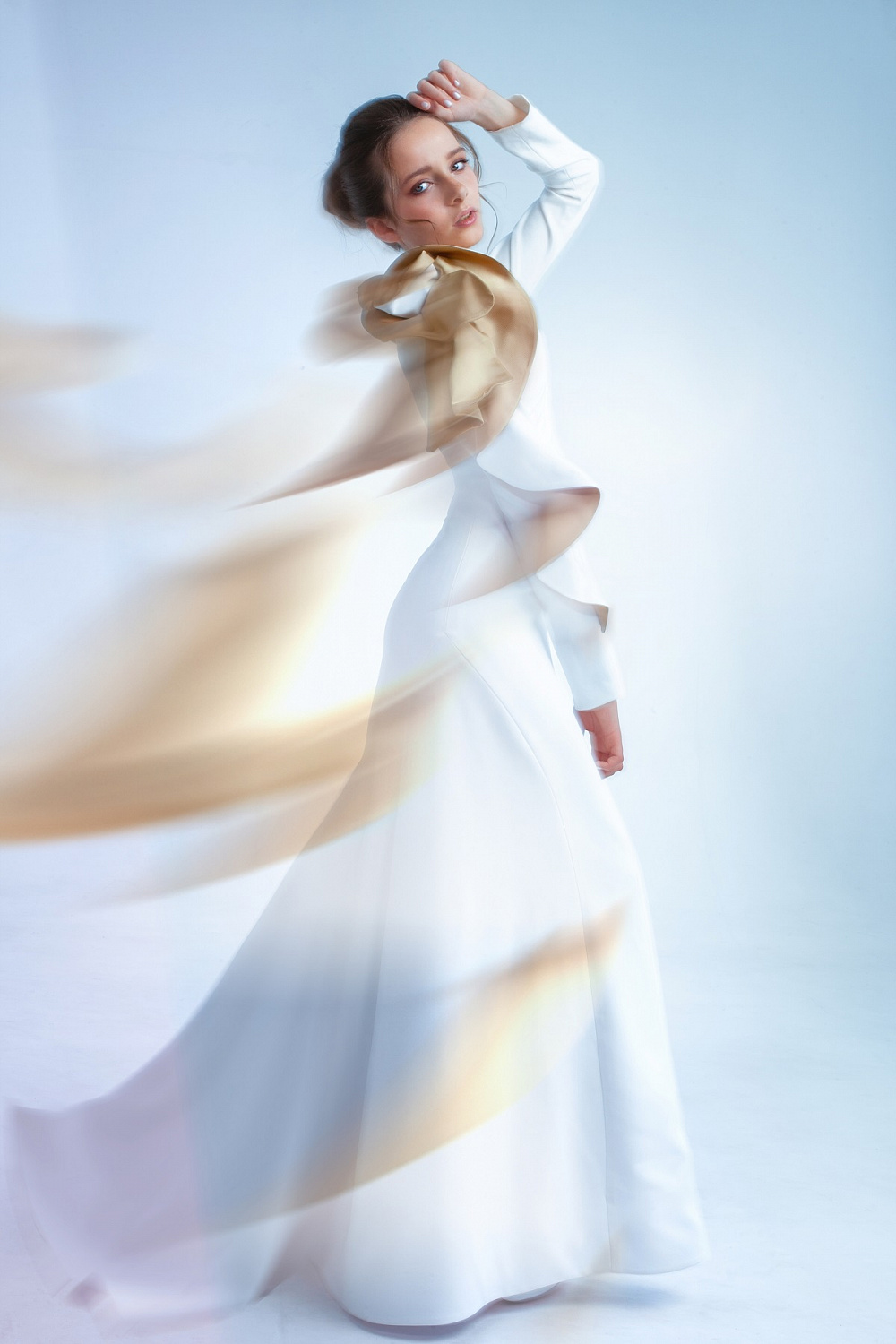 Колекція The Triumph представлена елегантною лінійкою білих образів із золотими акцентними воланами, які додають об`єму, надаючи образам вишуканості та жіночності. Прості, але ефектні силуети створюють легкий та витончений образ, а якісні матеріали з ніжним мереживом і золотою тафтою надають їм особливої привабливості та підкреслюють елегантність образів.