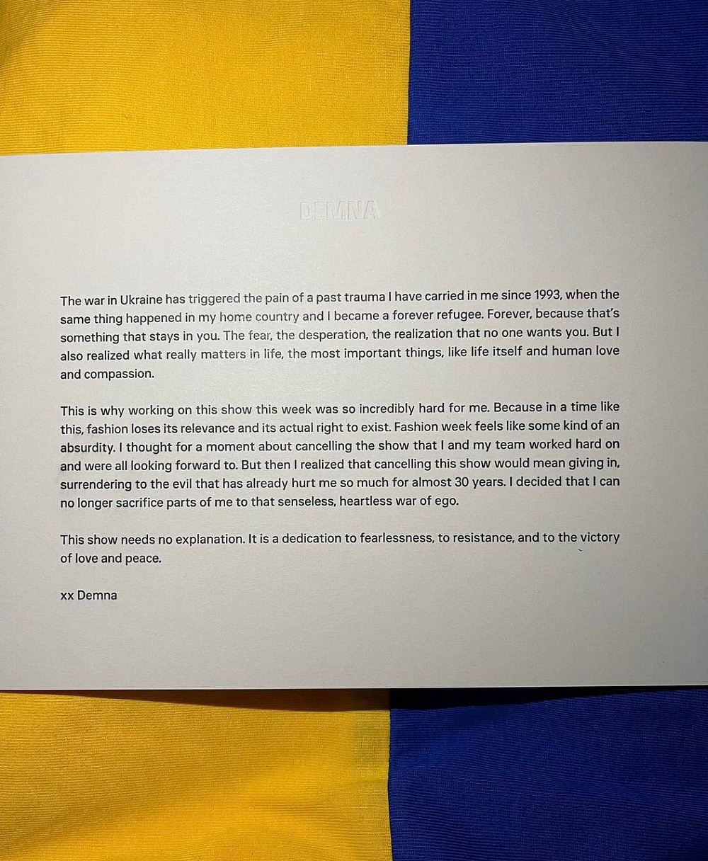 Однак, це не єдиний жест Демни Гвасалія у бік підтримки України: показ Balenciaga він розпочав із вірша українського поета Олександра Олеся «Живи, Україно, живи для краси», який прочитав особисто українською мовою.