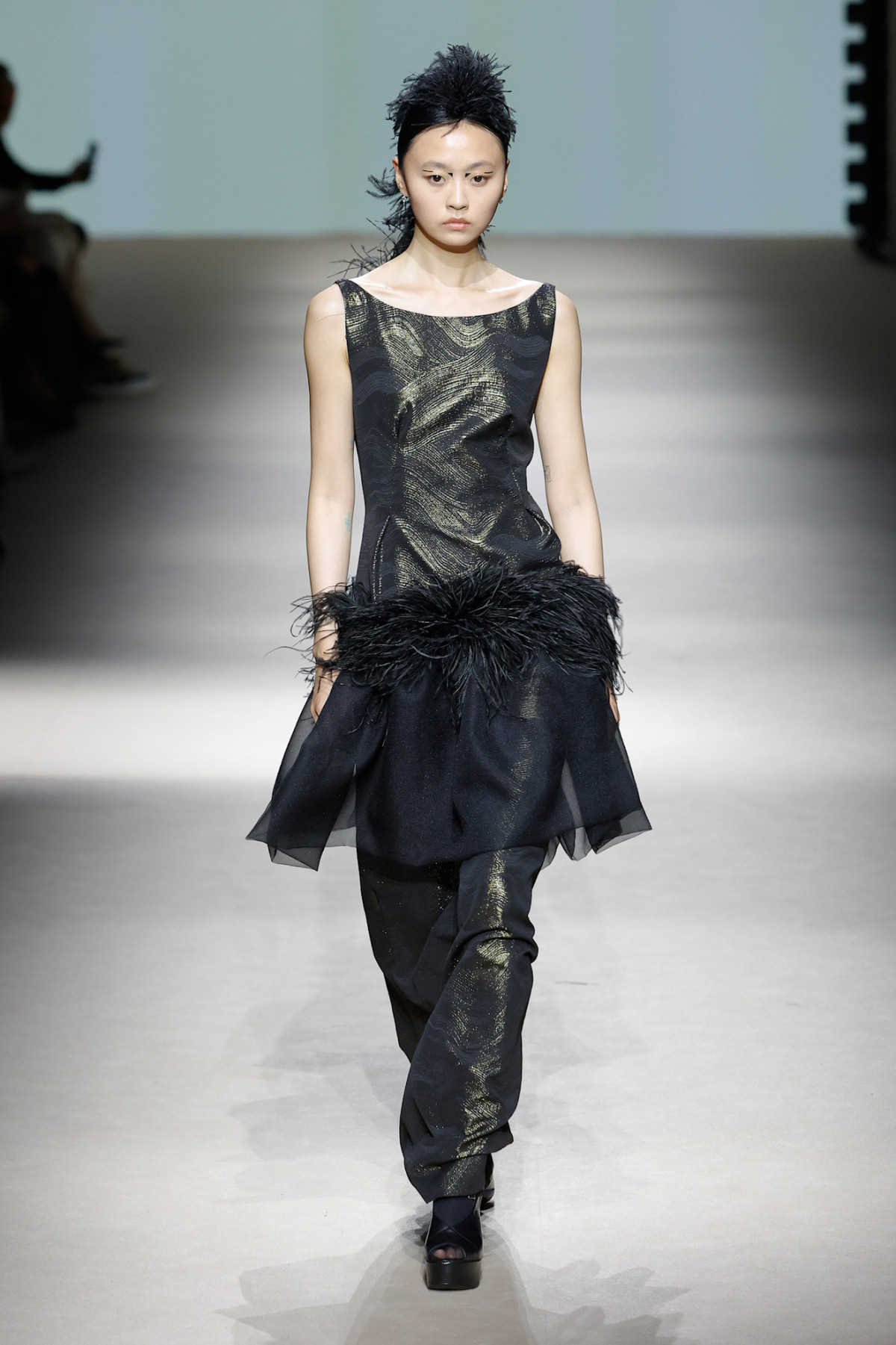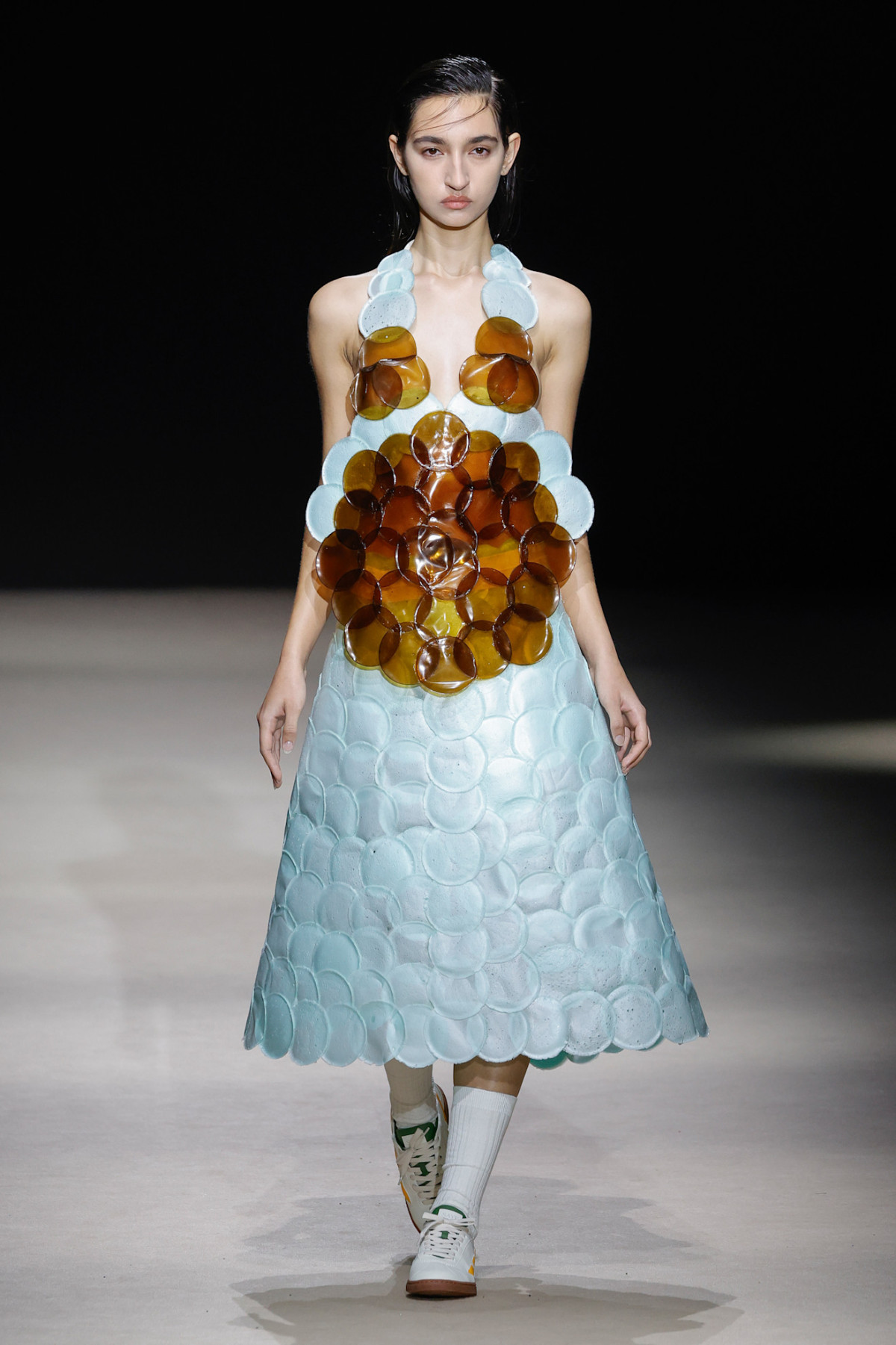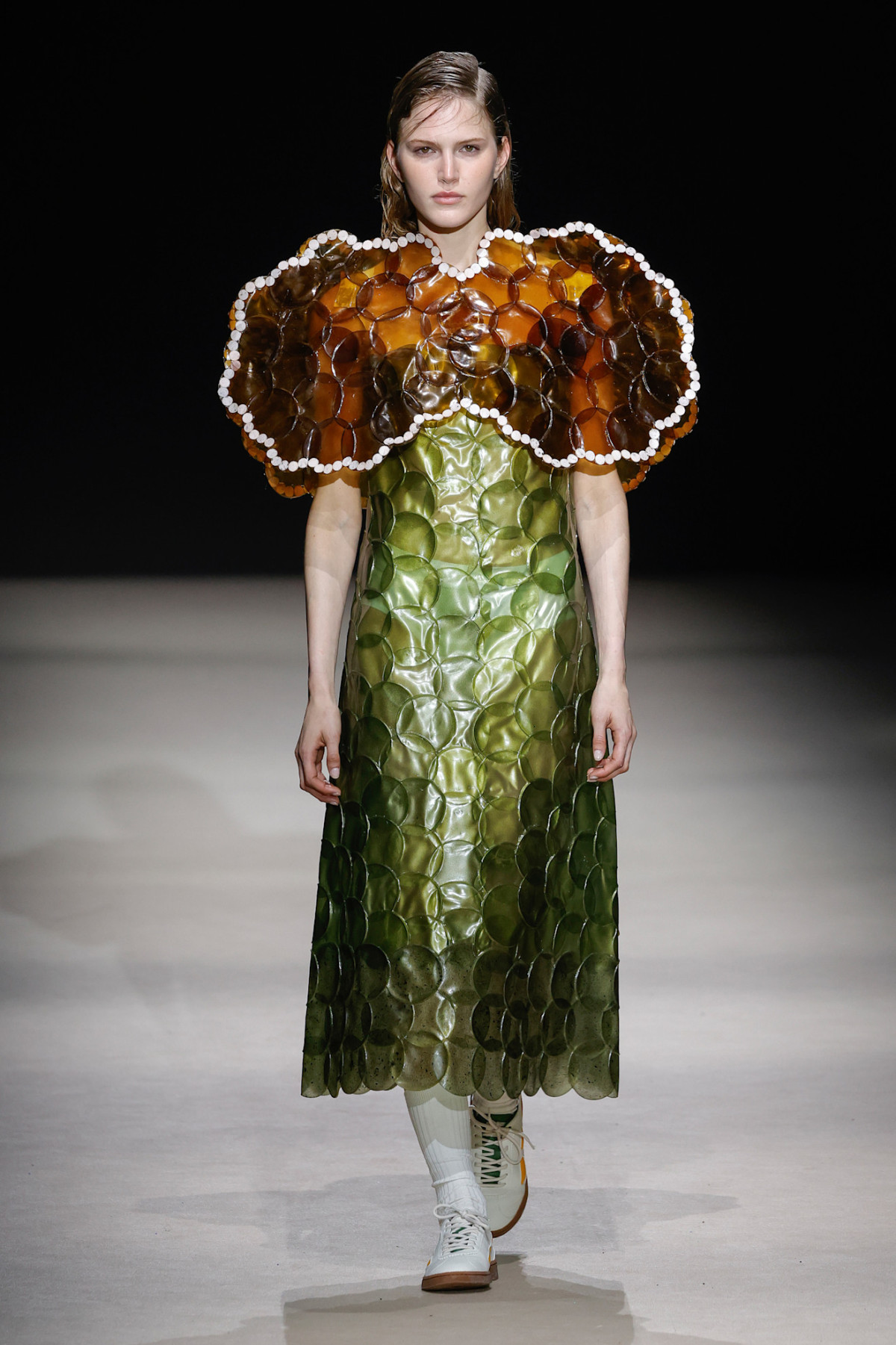 У декількох колекціях з’явилися пластикові фактури тканин, що переливаються при попаданні світла. Піонером у цьому став бренд Caducifolium із його експериментальними формами та сукнями, створеними з кругів.