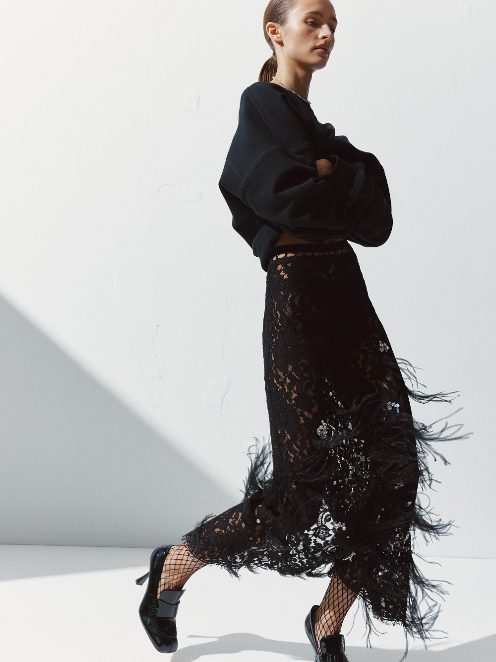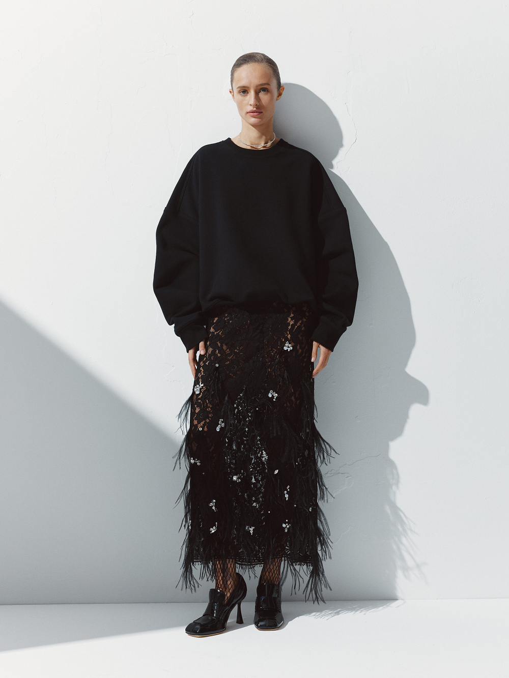 Дизайнери бренду запевняють, що урочисте піднесення особистості — в яскравих деталях та сміливих рішеннях. Тому сукні, костюми, спідниці чорного та білого кольорів у новій колекції СЇХ прикрашені стьобаним оксамитом, боа та камінням Swarovski. Відчіпне пір’я на речах легко трансформує коктейльні луки в одяг для щоденного носіння.