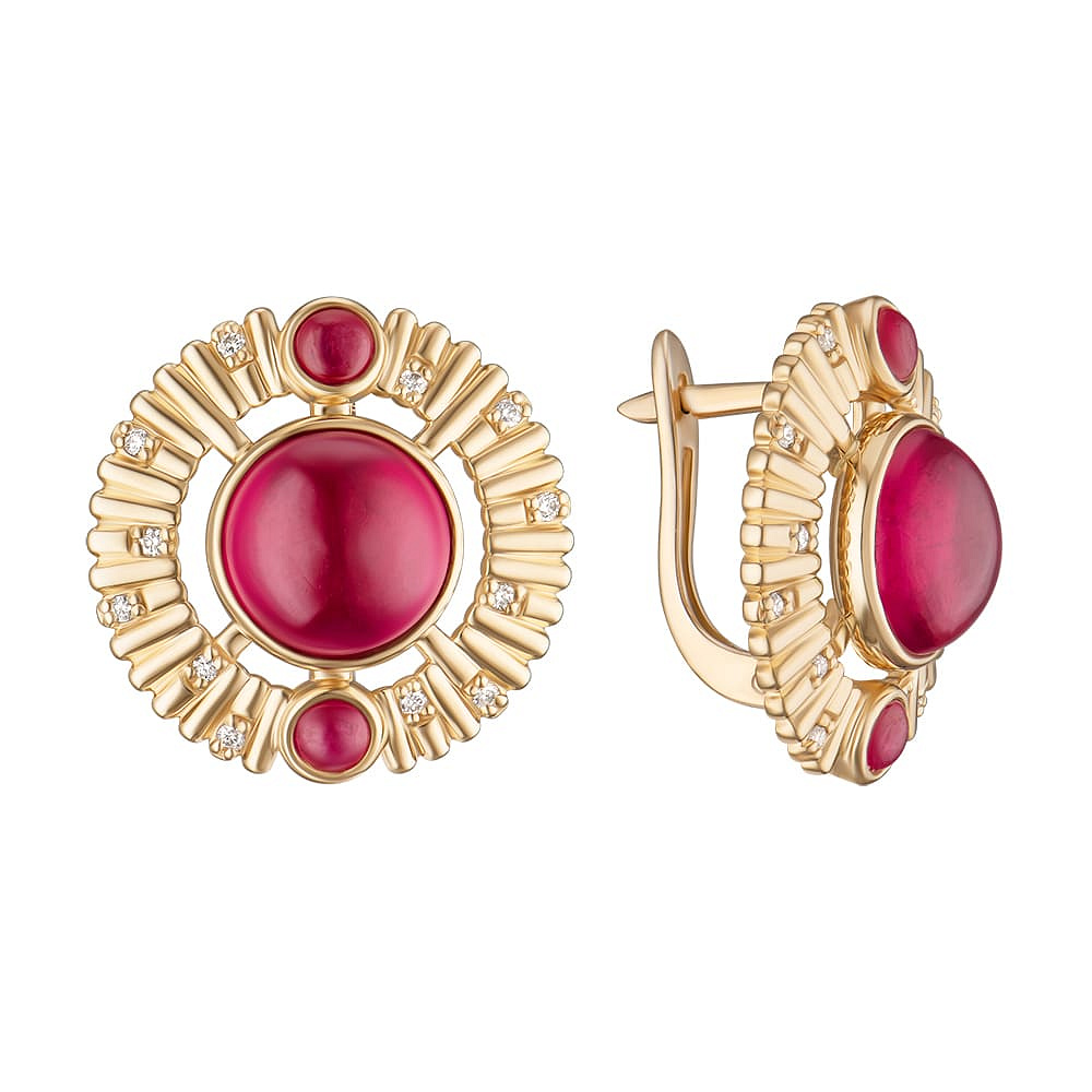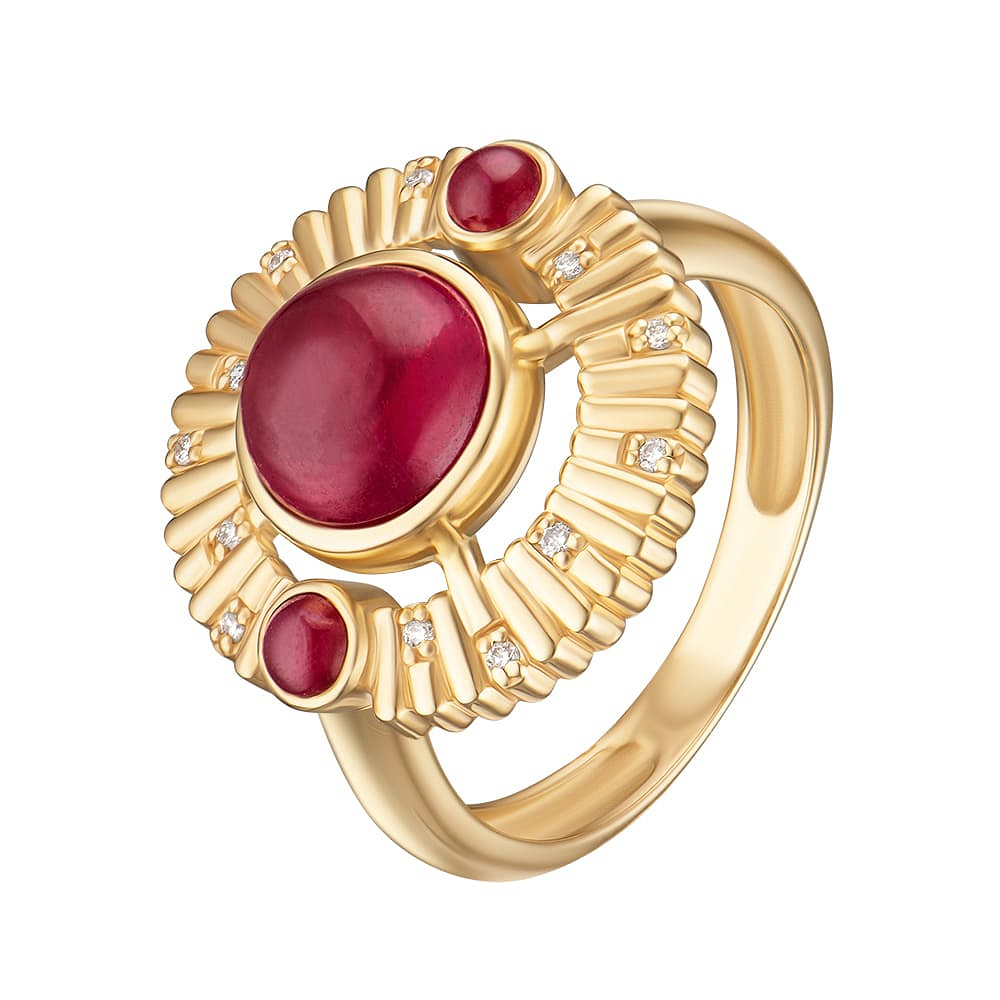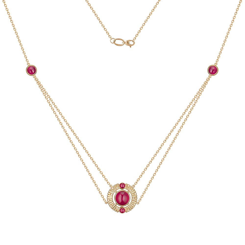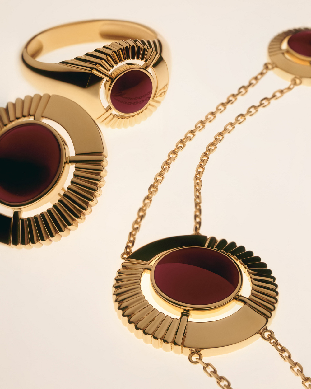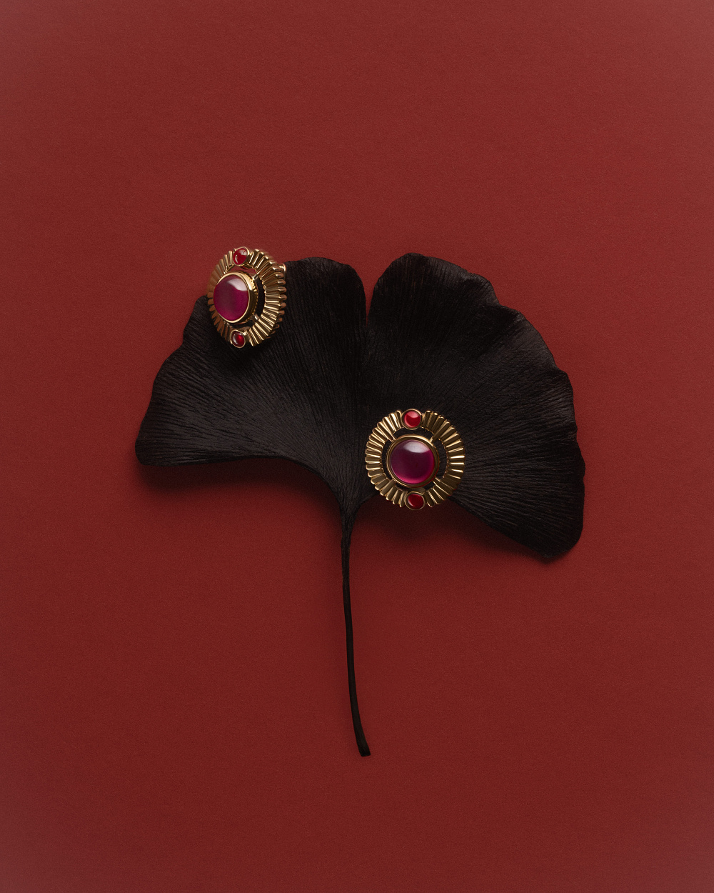 Ця естетика оживає в трьох варіантах оздоблення: рубін у чистому вигляді, у поєднанні з розсипом діамантів та з насиченими акцентами емалі кольору бургунді. У колекції представлені сережки, каблучки, браслети, брошки, кольє, чокери та браслети на оксамитовій стрічці — прикраси, які здатні органічно інтегруватися як у святкові образи, так і в повсякденний гардероб.