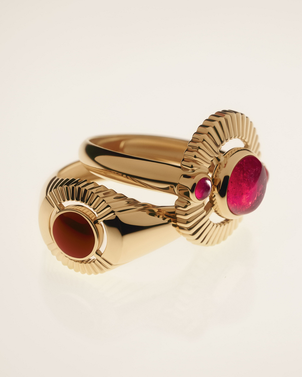 Колекція ROUGE є сучасним прочитанням епохи 50–60-х років, коли прикраси вирізнялися сміливими формами, майстерною роботою з матеріалами та унікальною здатністю підкреслювати індивідуальність власниці. Арткоманда SOVA створила прикраси, в яких класична вінтажна стилістика поєднується із сучасним баченням. У центрі кожного твору — масивний круглий елемент із витонченою фактурою у вигляді променів, що віддзеркалюють світло, додаючи глибини золоту.