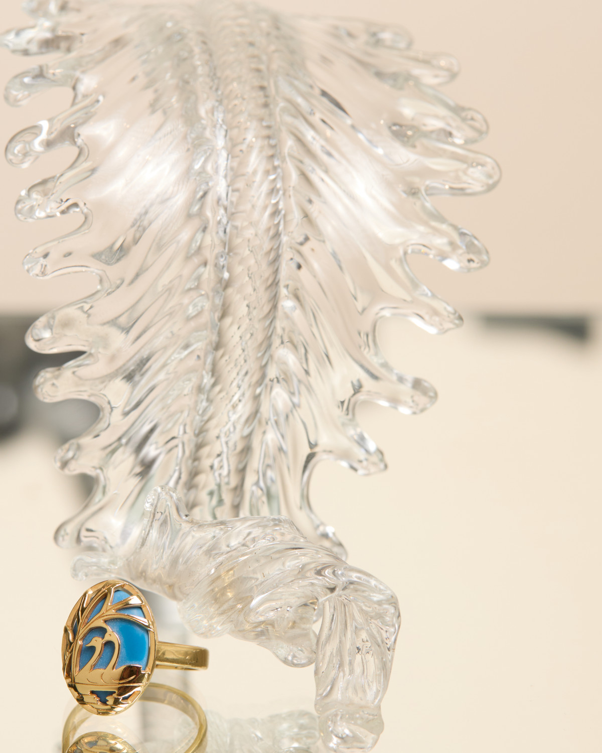 Кольоровим акцентом став сет із каблучки та кольє, основою яких є синій агат з матовим фінішем. На камені зображено рельєф із парою лебедів у жовтому металі — як символ кохання та вірності. Синій агат перегукується з відомою у світі весільною традицією дарувати нареченій «щось синього кольору» — на щасливе майбутнє.