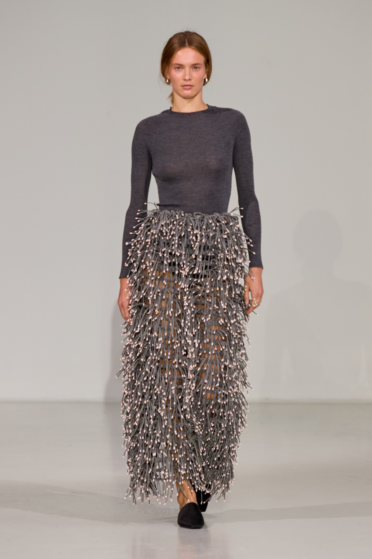Від делікатної бахроми з тонких ниток до масивних шкіряних пасків, що м’яко рухаються й створюють об’ємний 3D-ефект під час ходи — фактурність цього сезону вражає. Herskind, Iamisigo та Freya Dalsjø представили особливо креативні інтерпретації цього прийому.